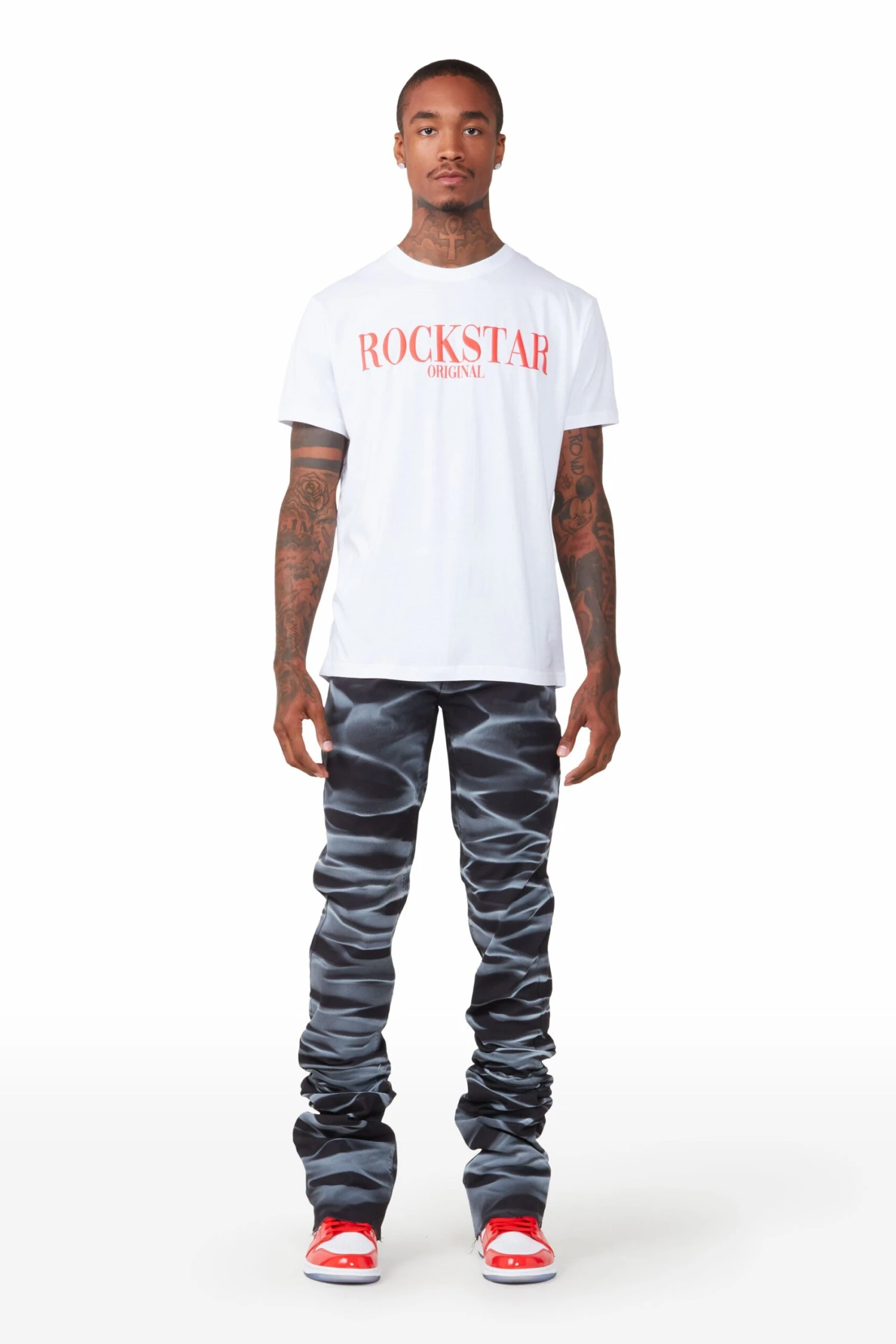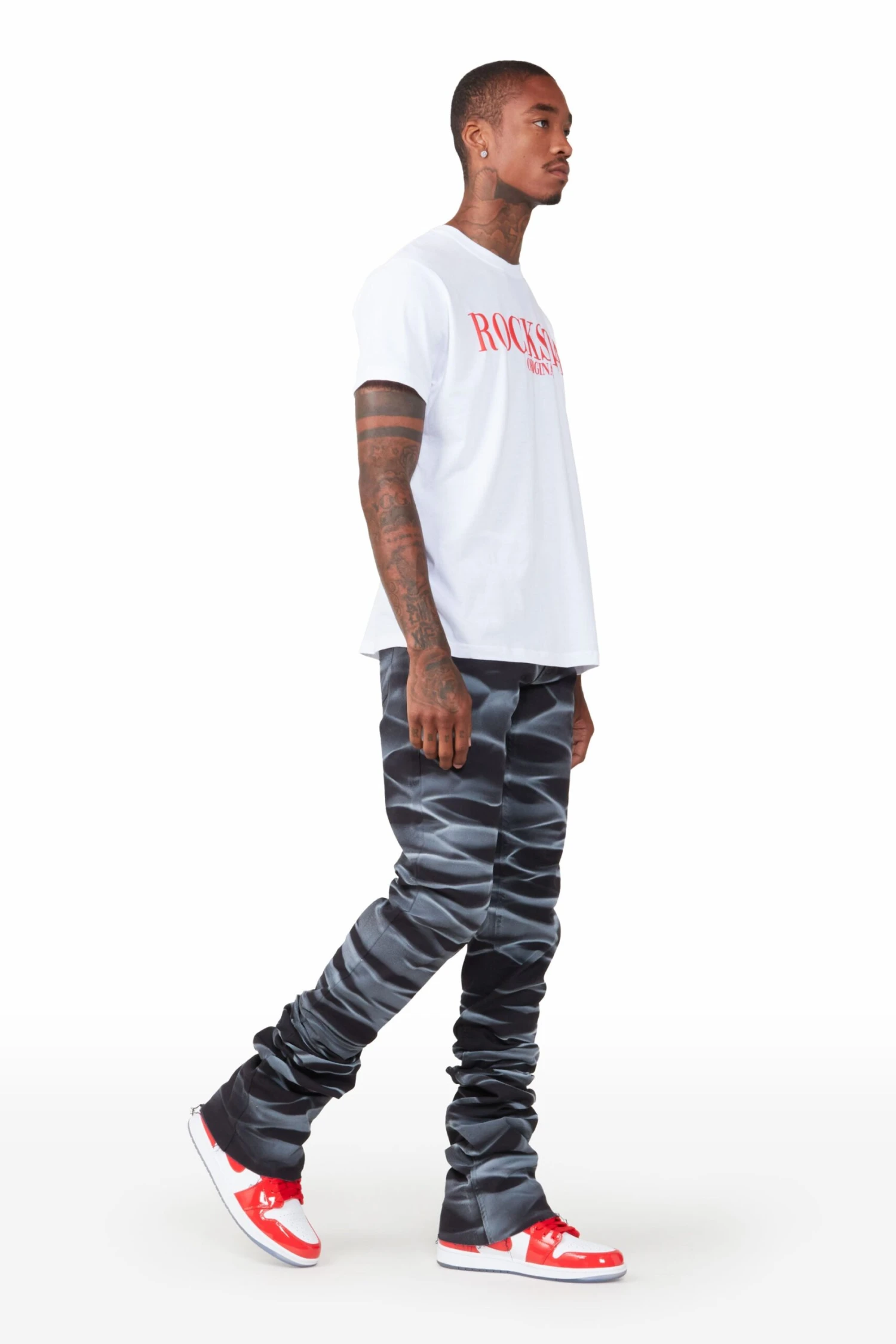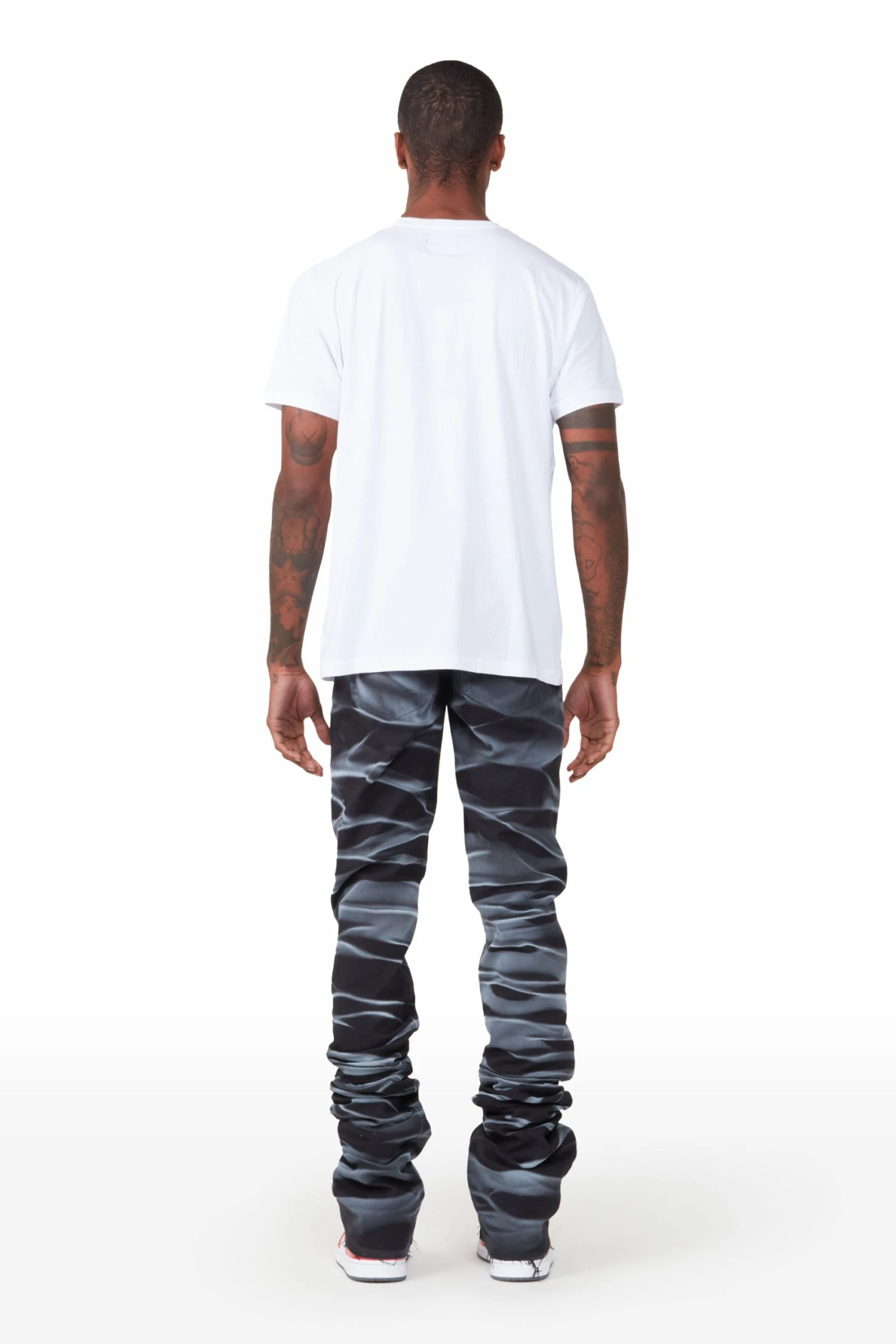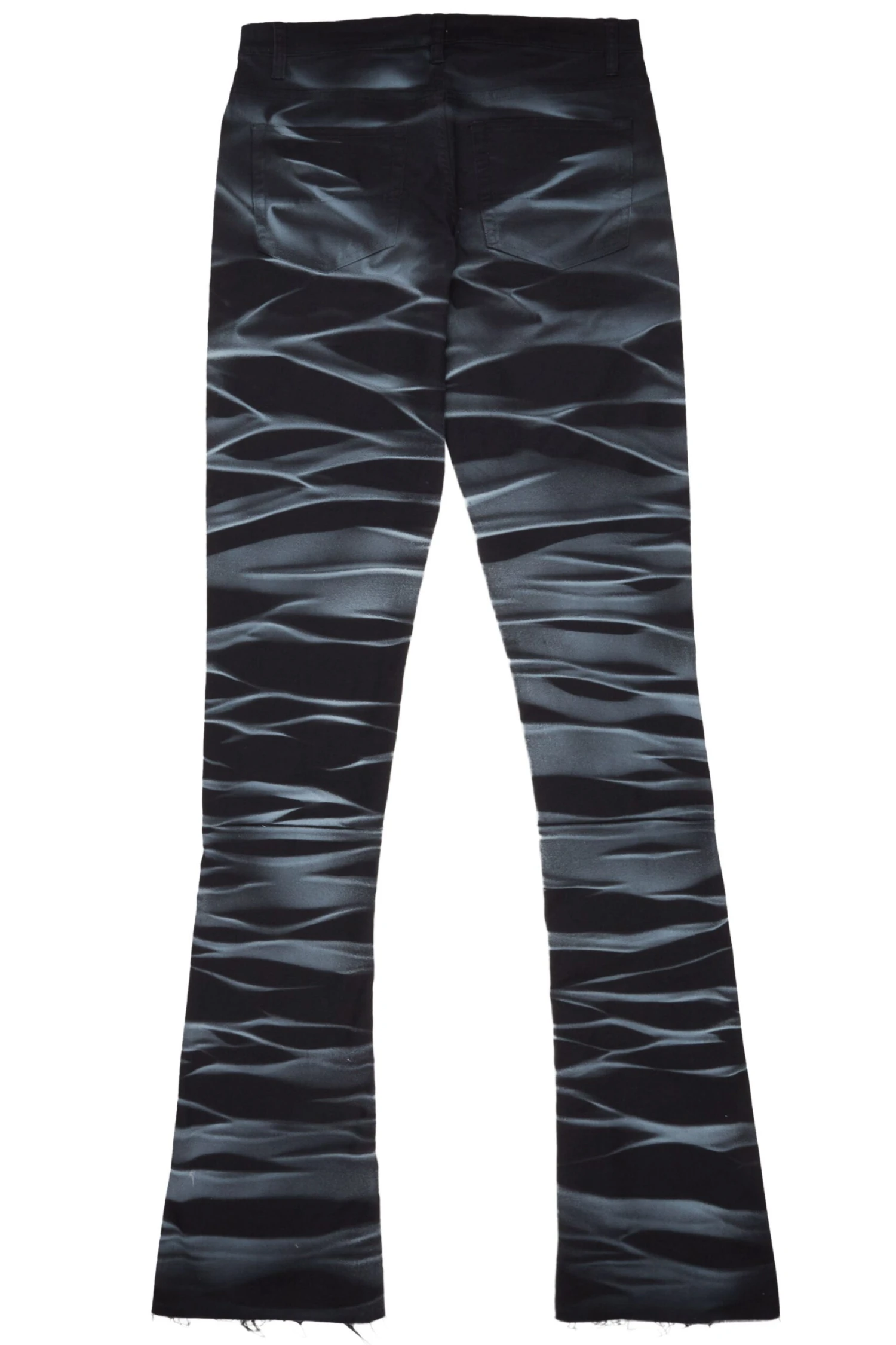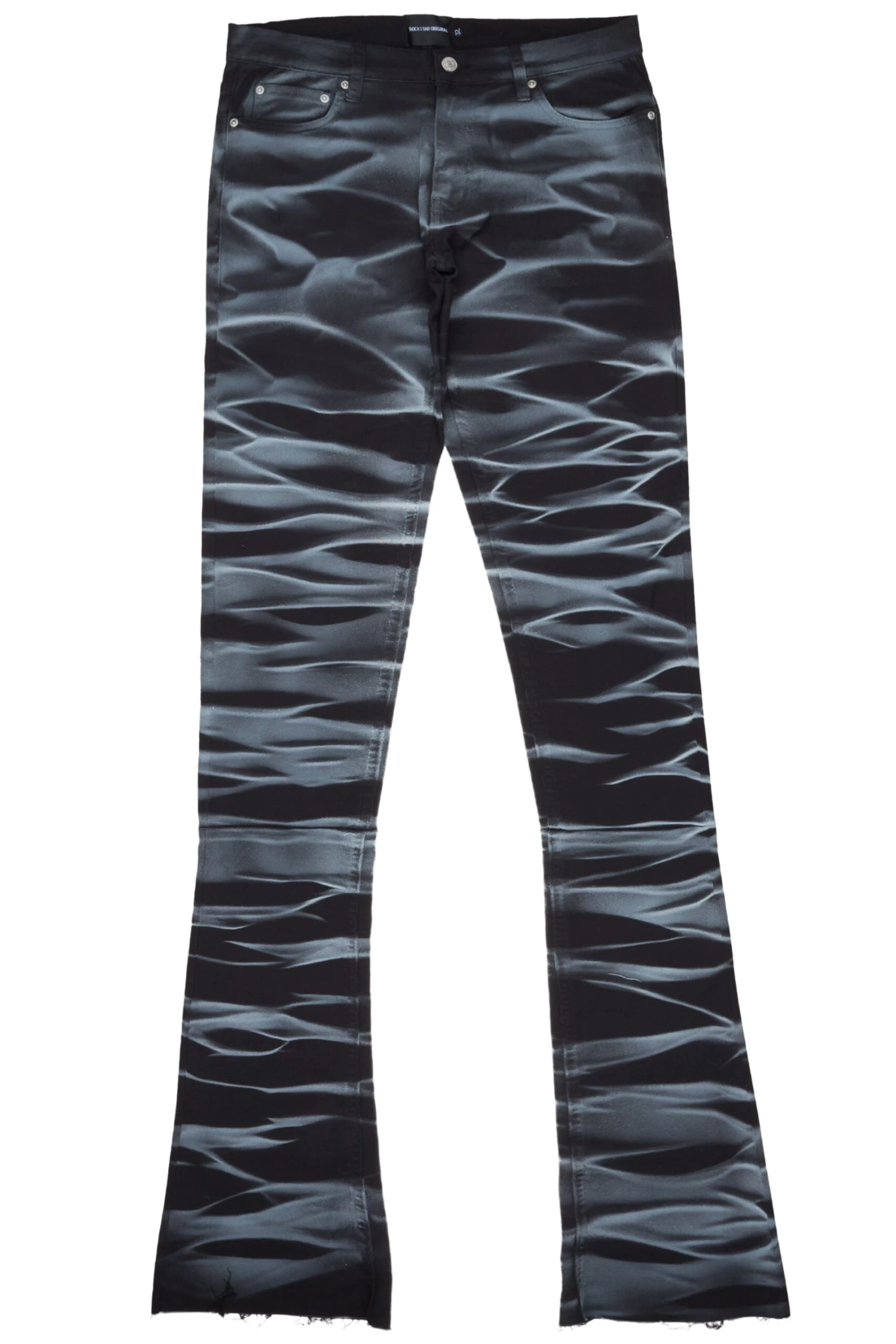 An urban super stacked denim jean for men in black. Designed with organic cotton and spray paint detailing for a dope streetwear style.