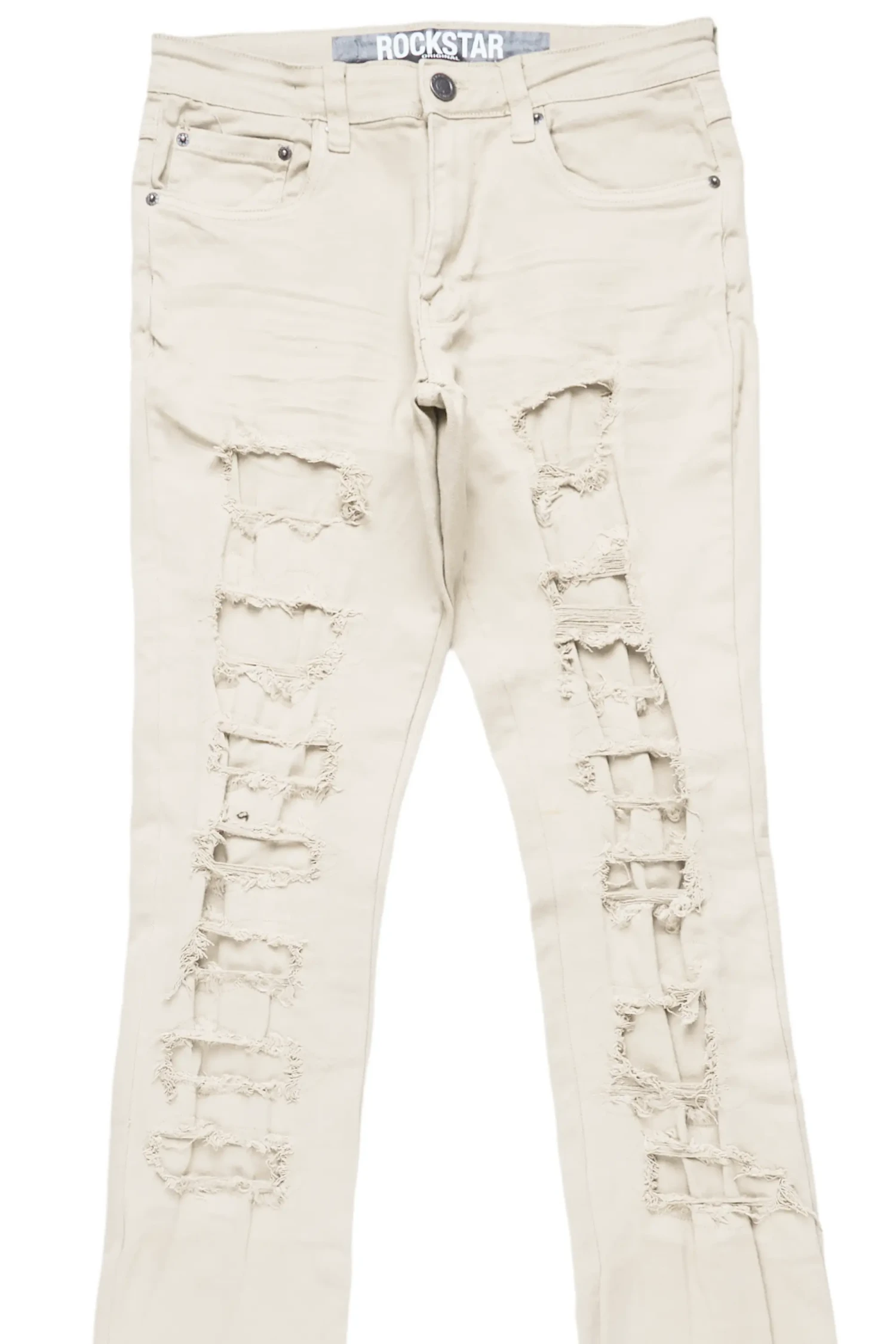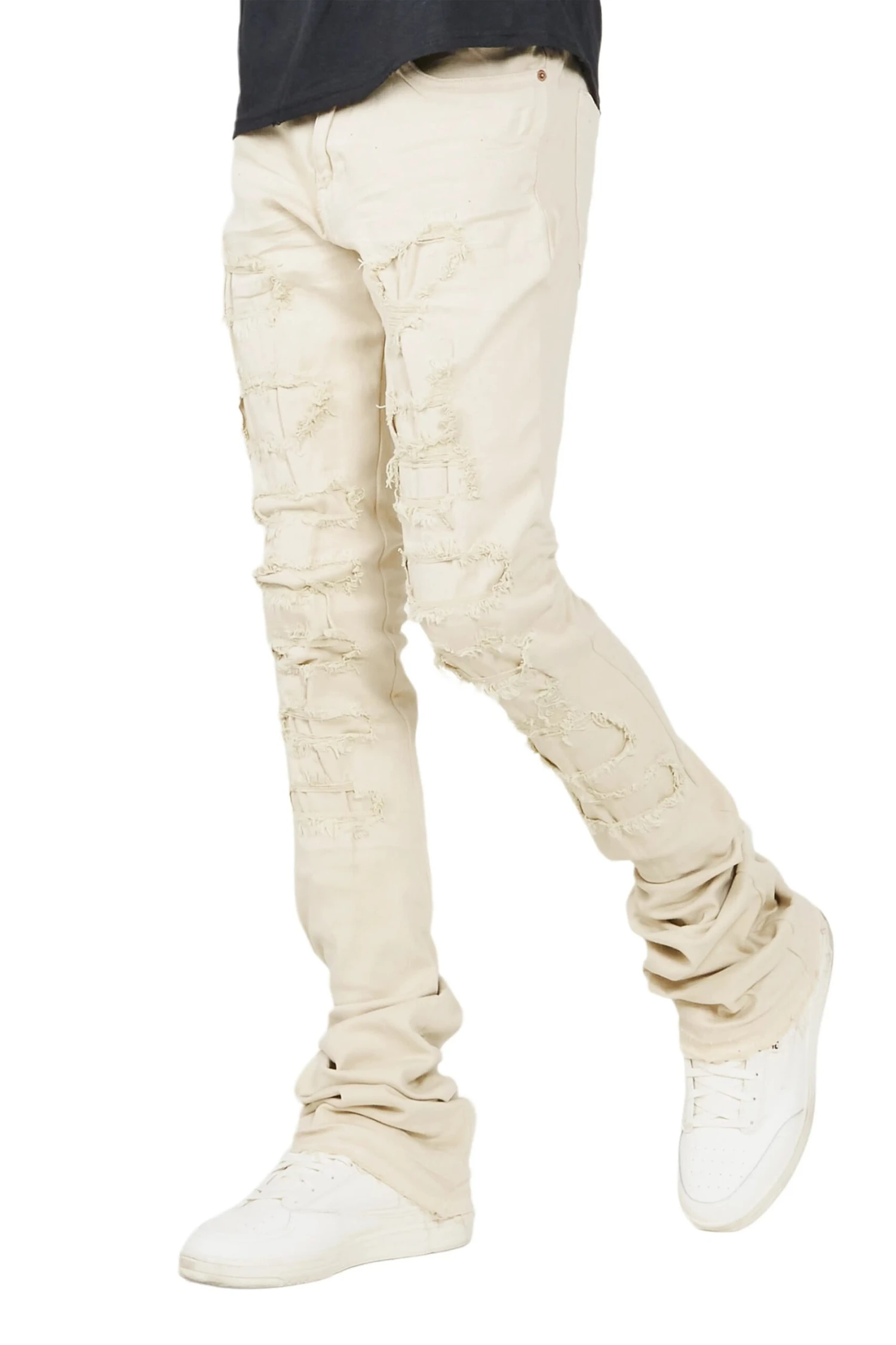 An elite pair of super stacked denim jeans for men in sand. Designed with organic cotton and extra long legs for a dope streetwear style.
