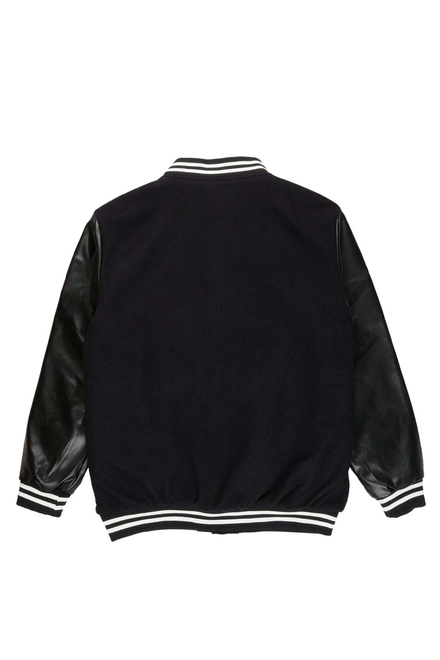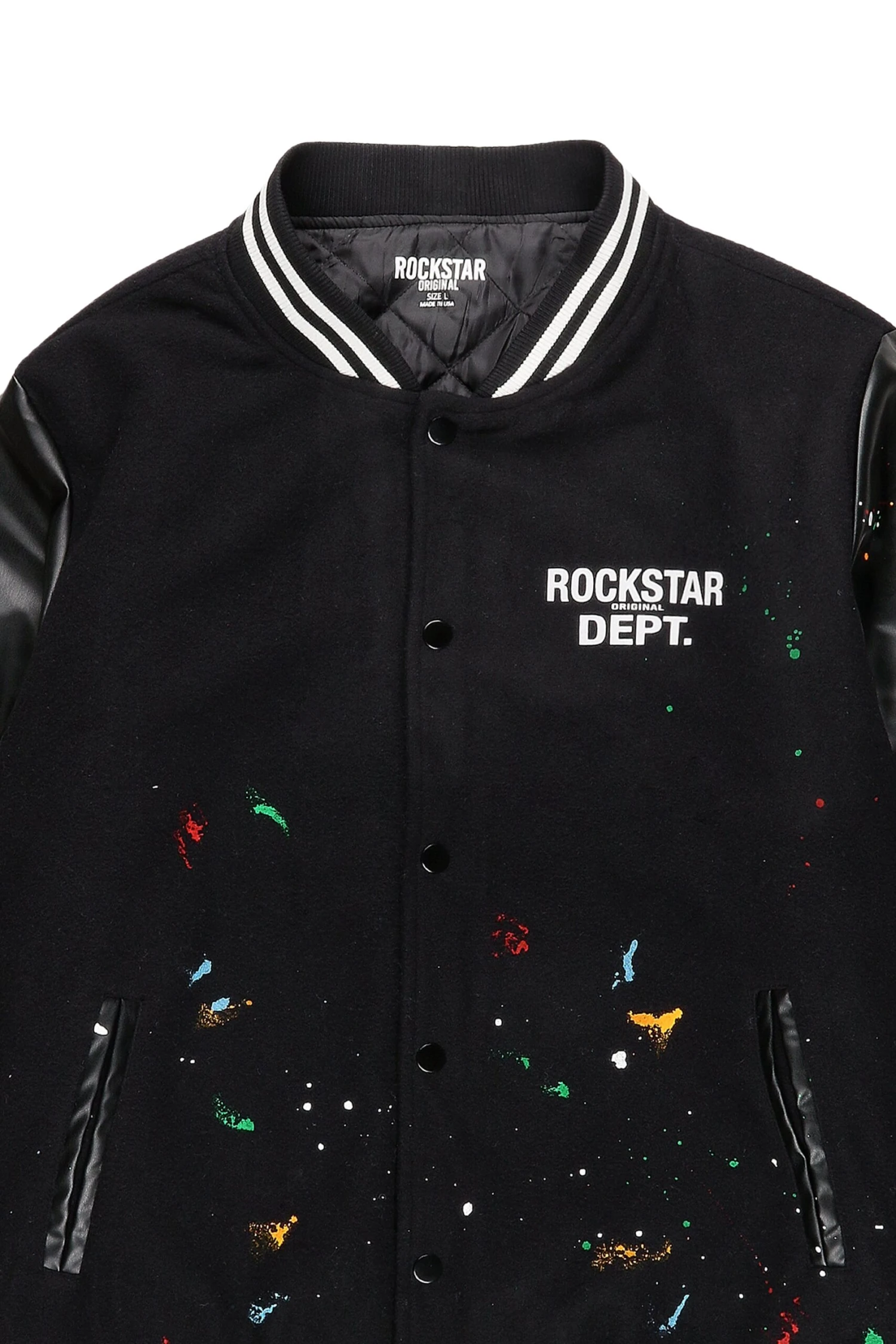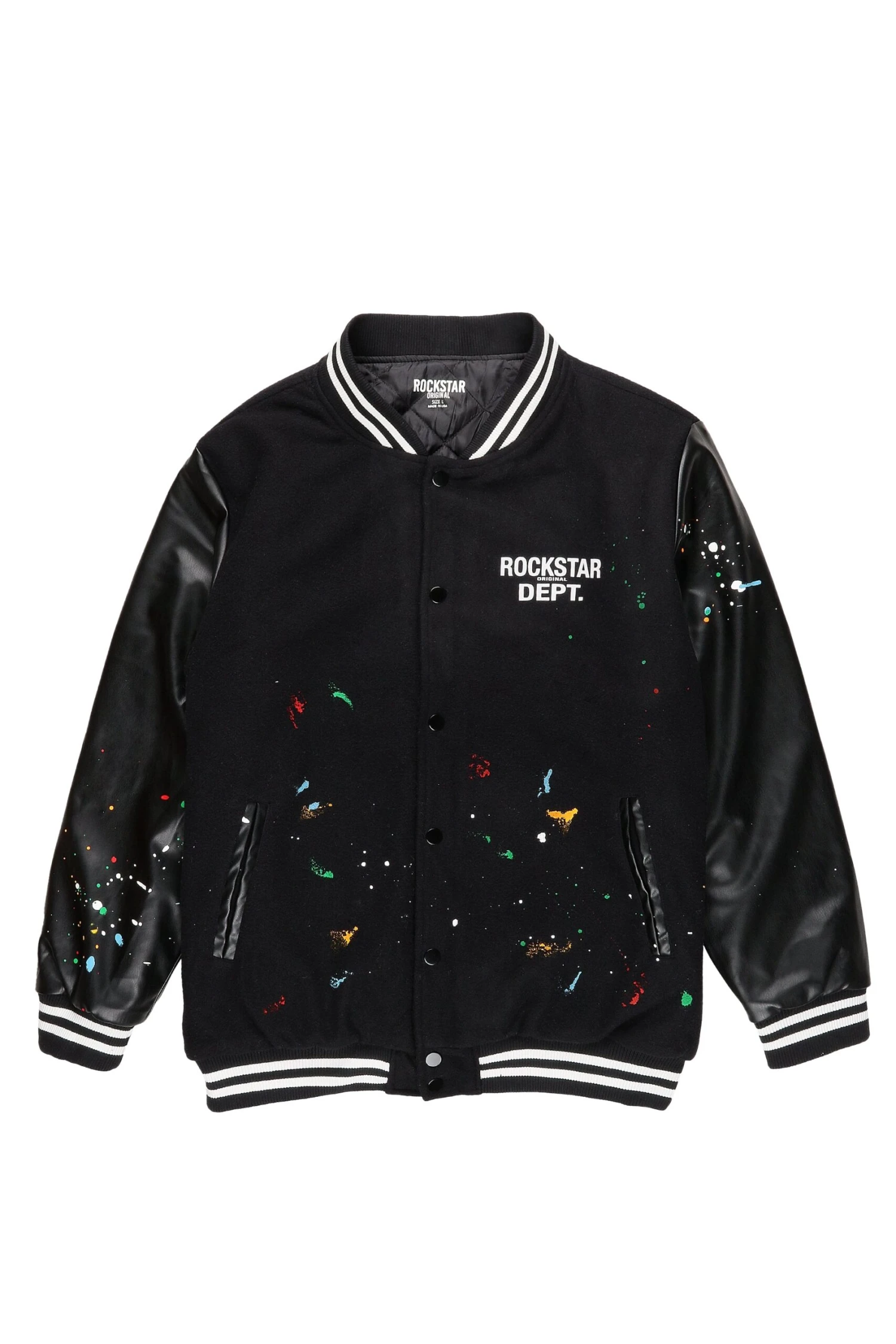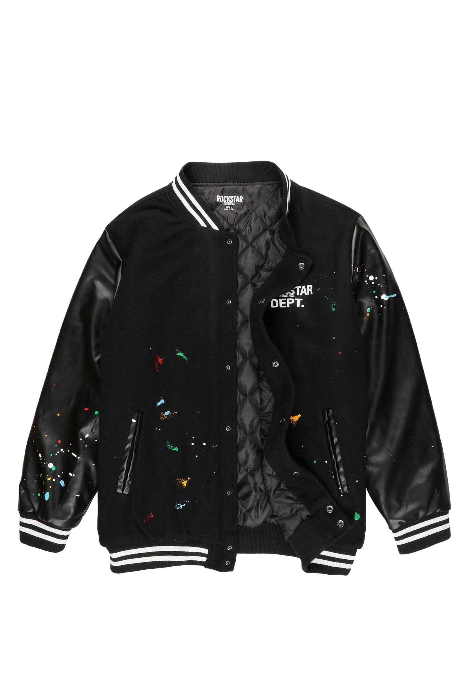 A quilted bomber jacket for men in black. Designed with custom paint splatter and ultra soft felt fabric for a versatile outerwear style.