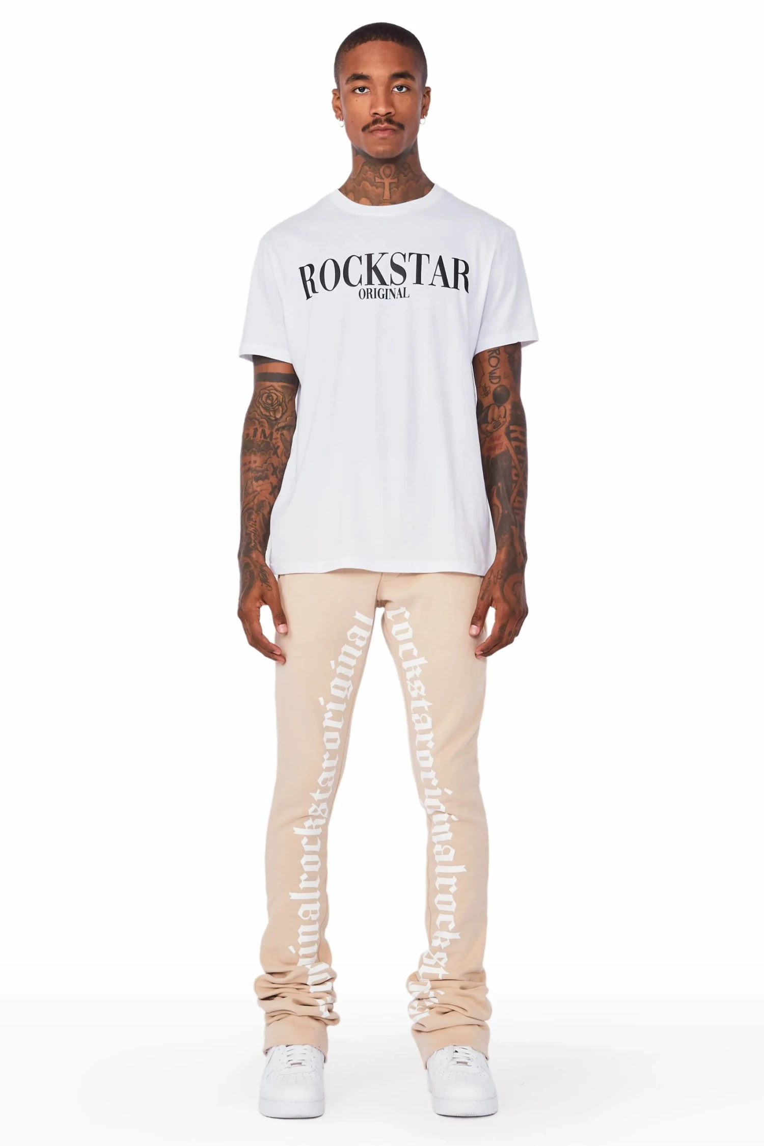A pair of contemporary super stacked track pants for men in beige. Designed with ultra soft organic cotton and extended legs for a must-cop loungewear style.