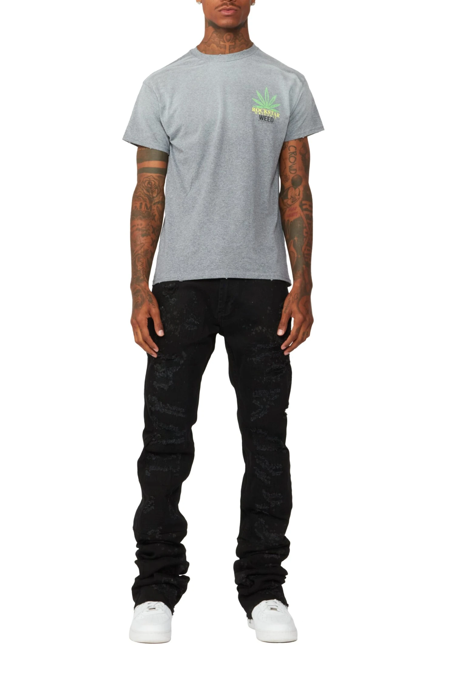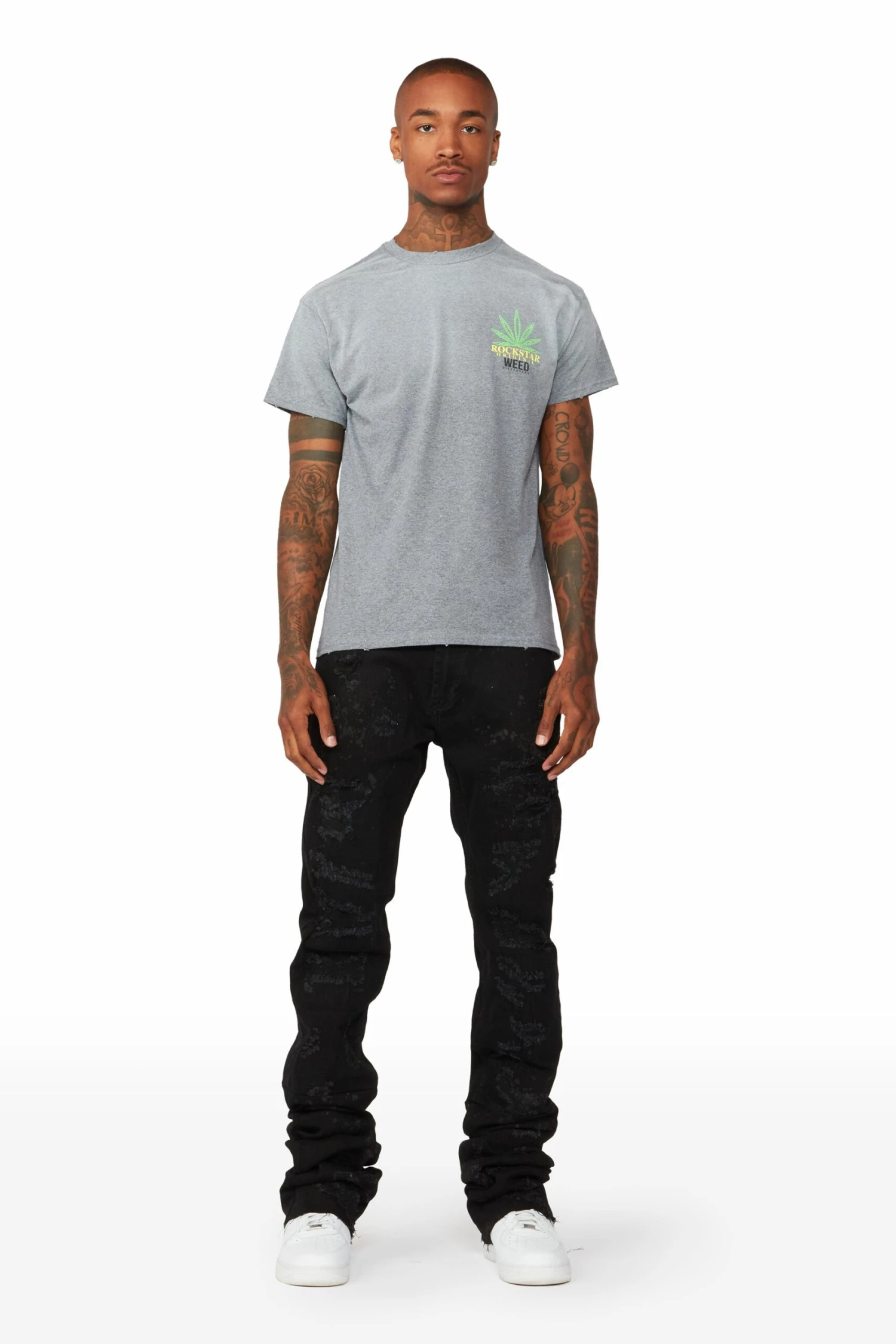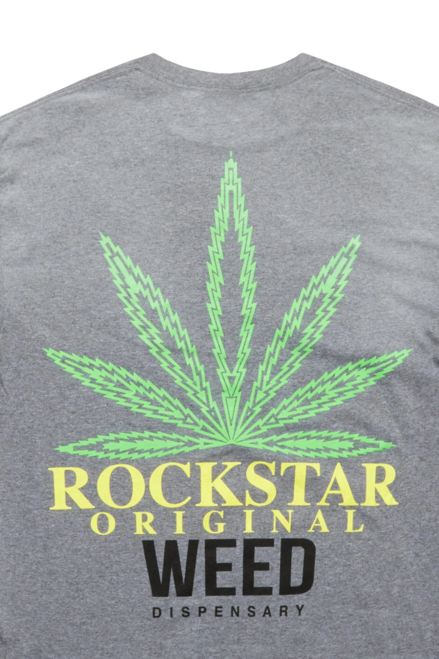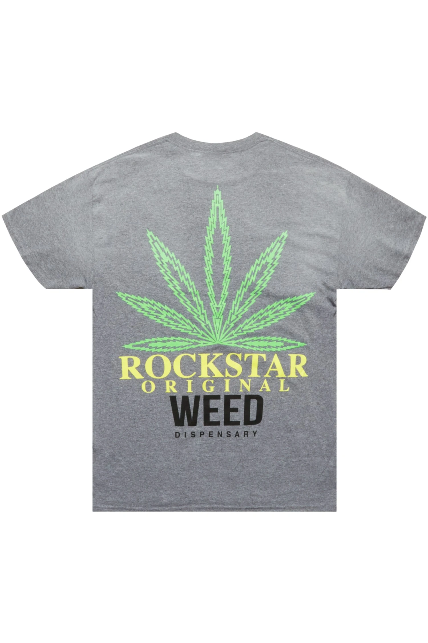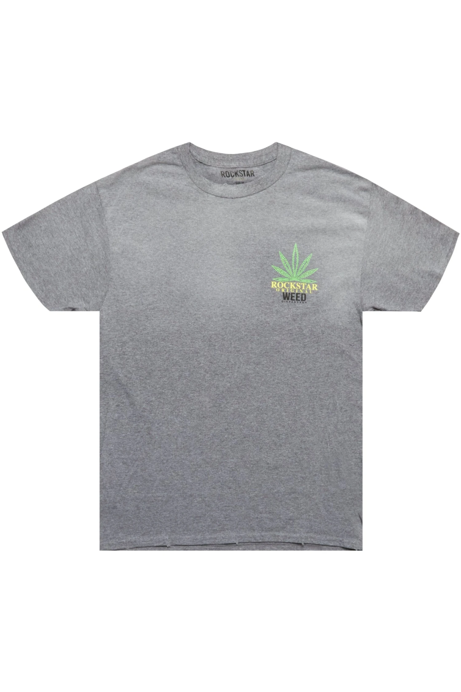 An urban streetwear t-shirt for men in grey. Designed with organic cotton and a custom weed dispensary logo for the perfect staple piece style.