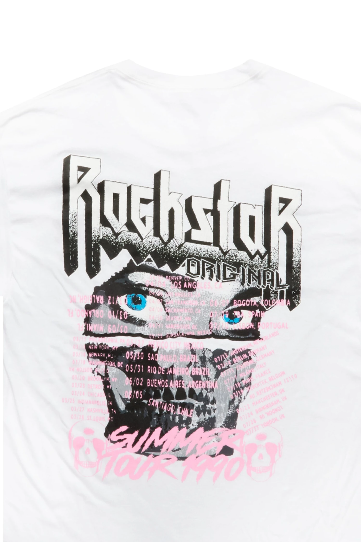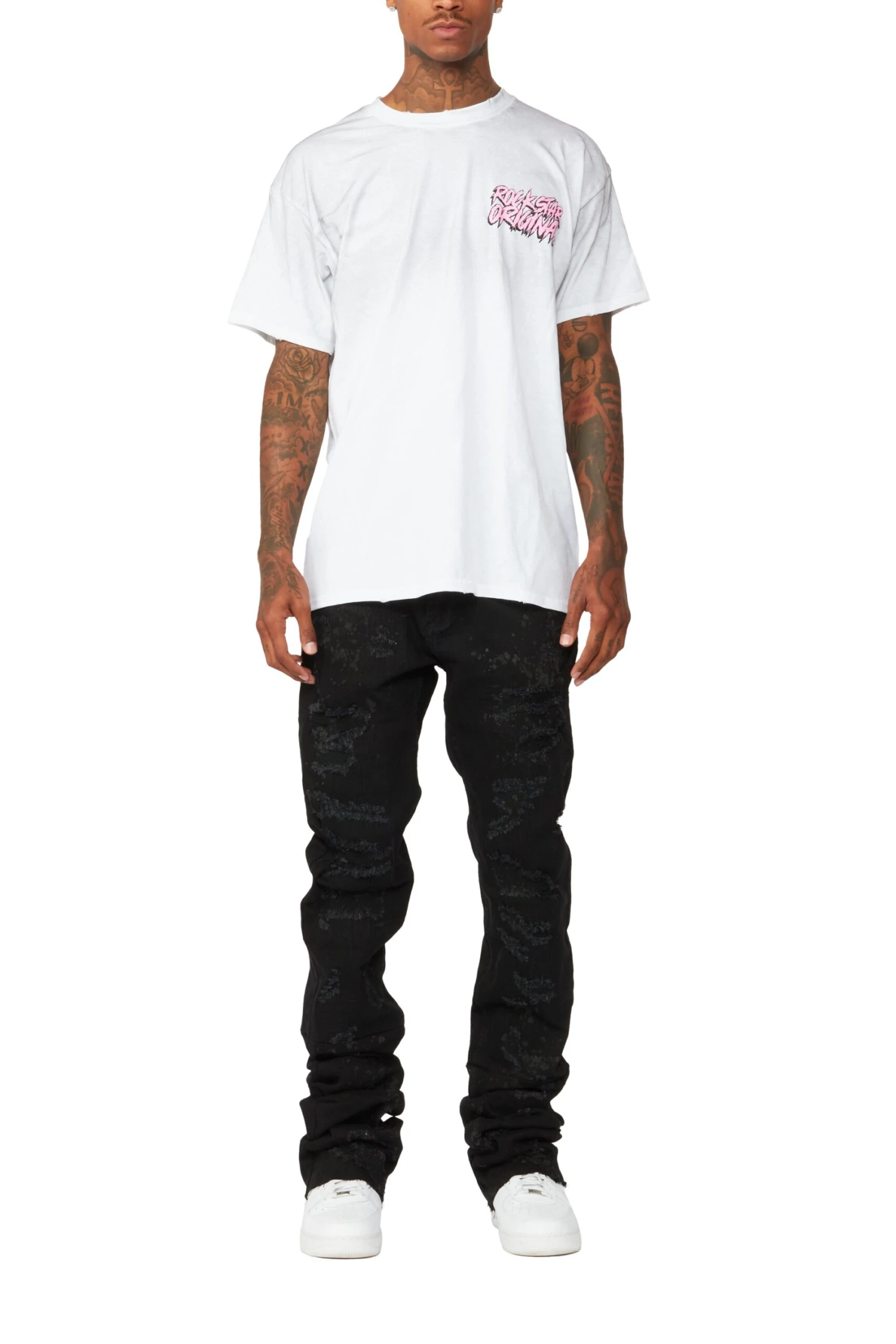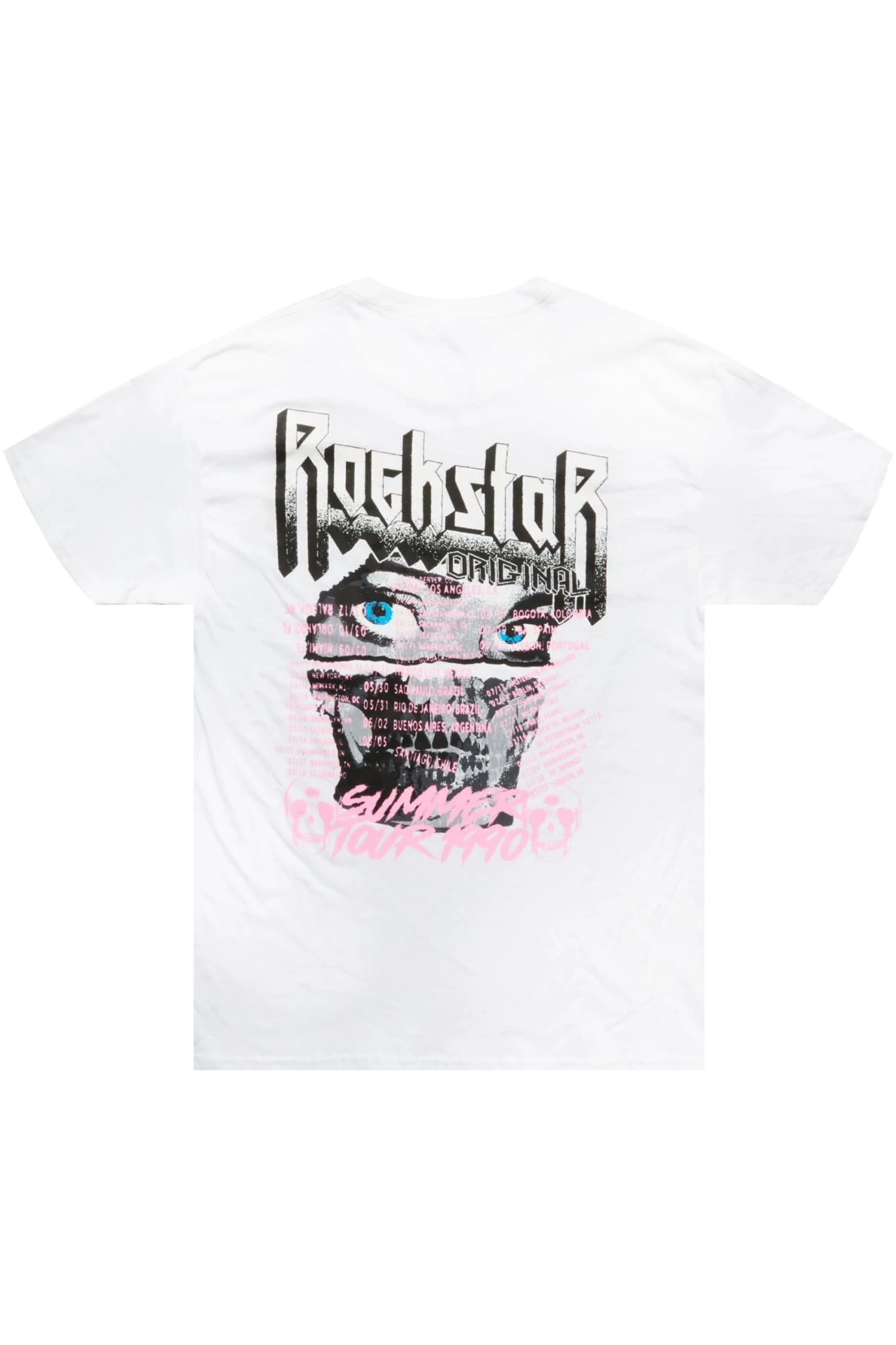 An urban streetwear t-shirt for men in white. Designed with organic cotton and a custom multi-color graphic for the perfect staple piece style.