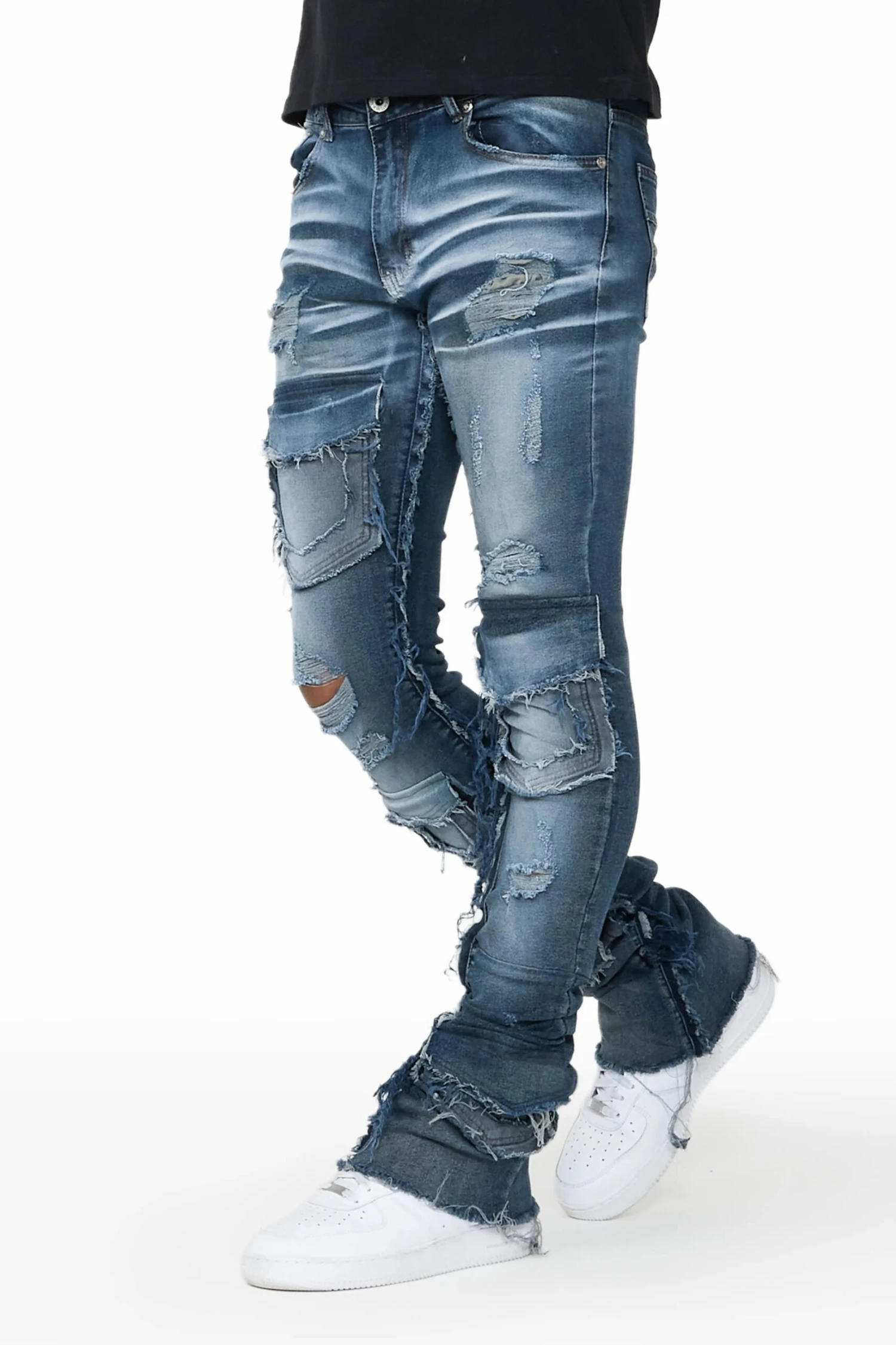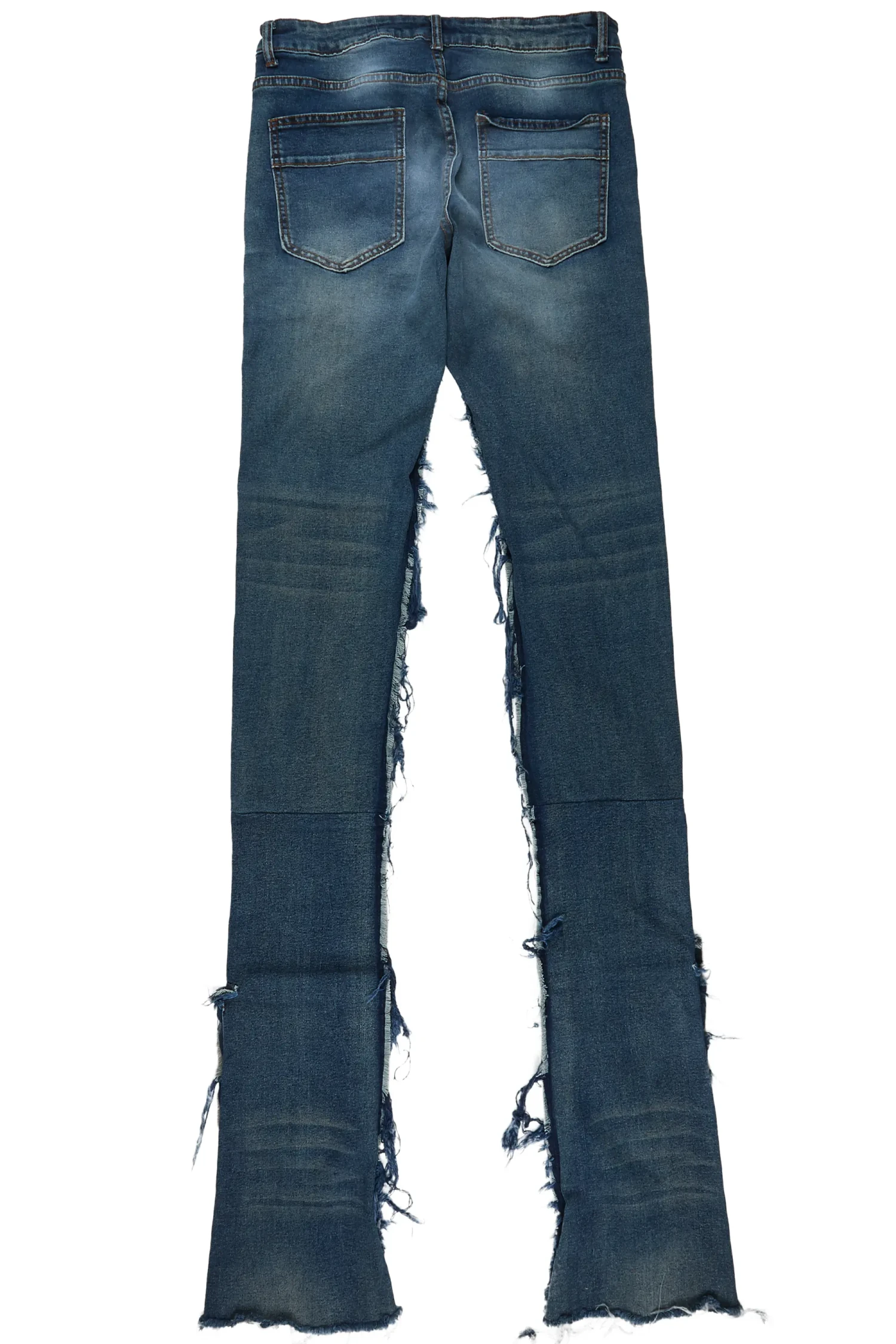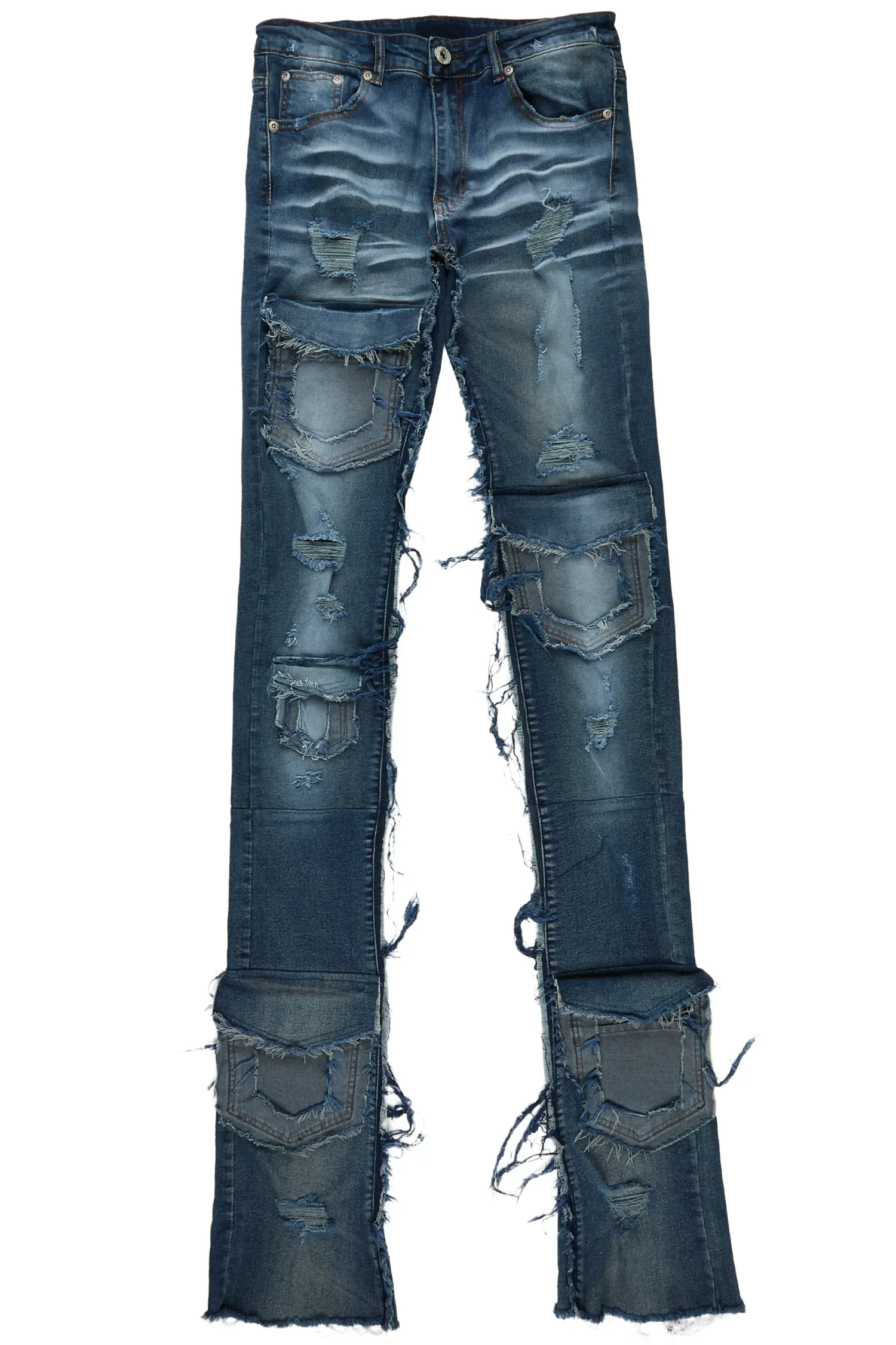A pair of urban super stacked denim jeans for men in vintage. Designed with organic cotton and custom patchwork for a dope streetwear style.