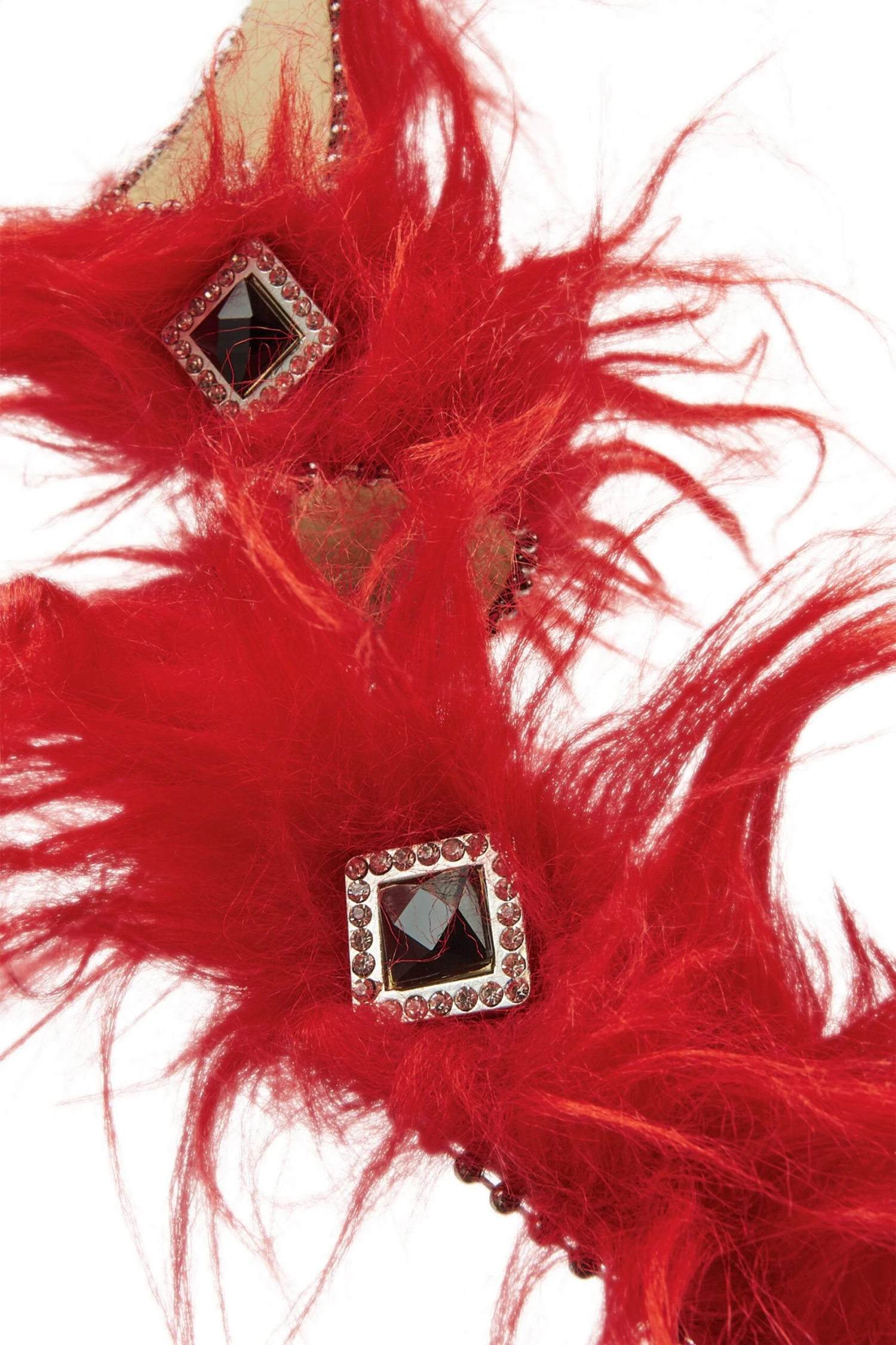 An elevated faux fur strap belt for men in red. Designed with custom embellishments and a stainless steel RSO buckle for a must-cop accessory.