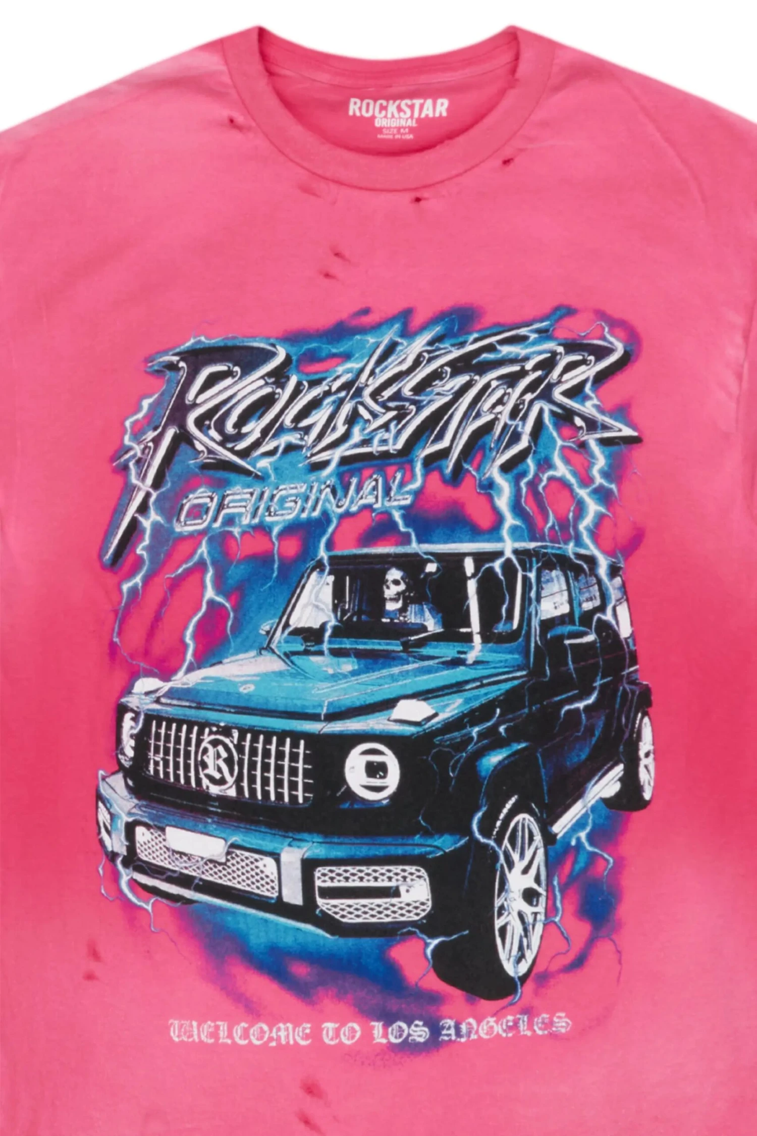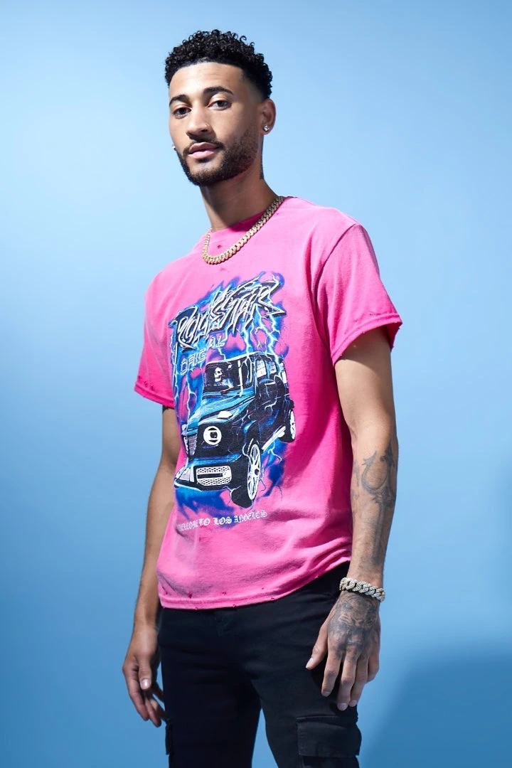 An urban streetwear t-shirt for men in pink. Designed with organic cotton and a custom multi-color graphic for the perfect staple piece style.