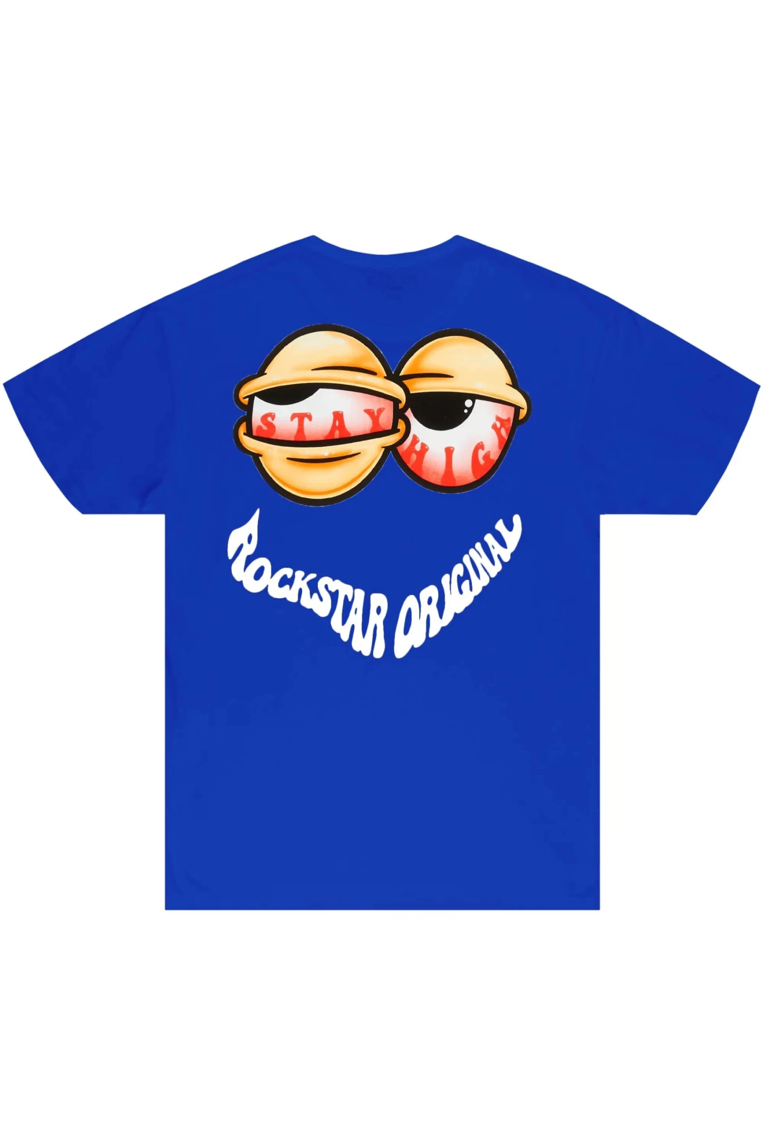 An urban streetwear t-shirt for men in royal blue. Designed with organic cotton and a custom faded smiley graphic for the perfect staple piece style.