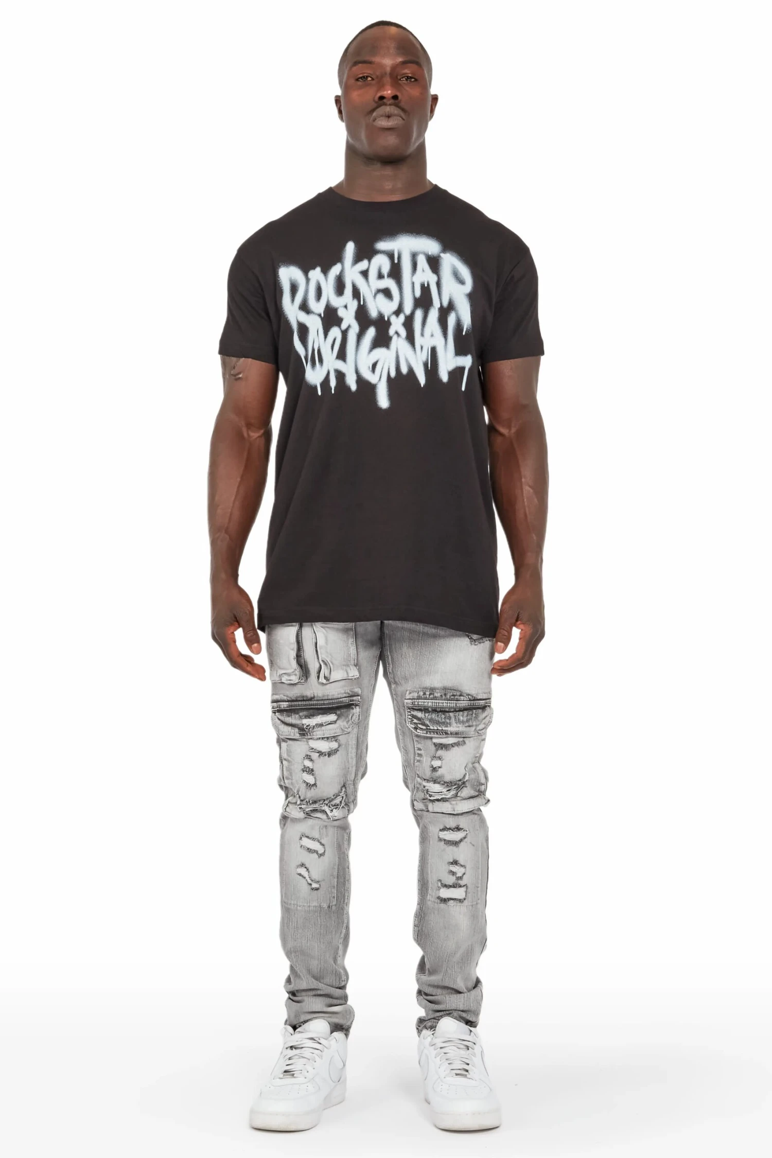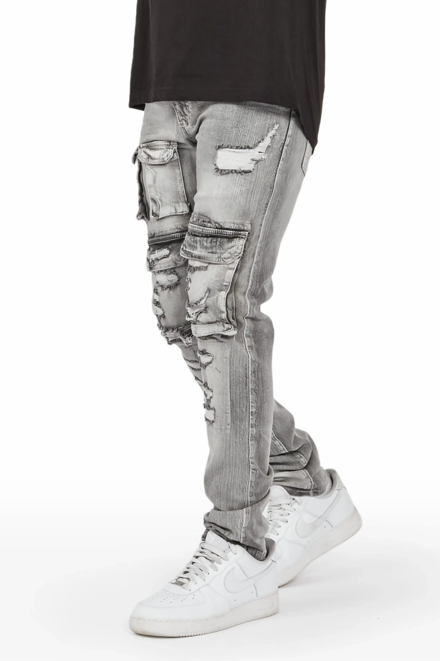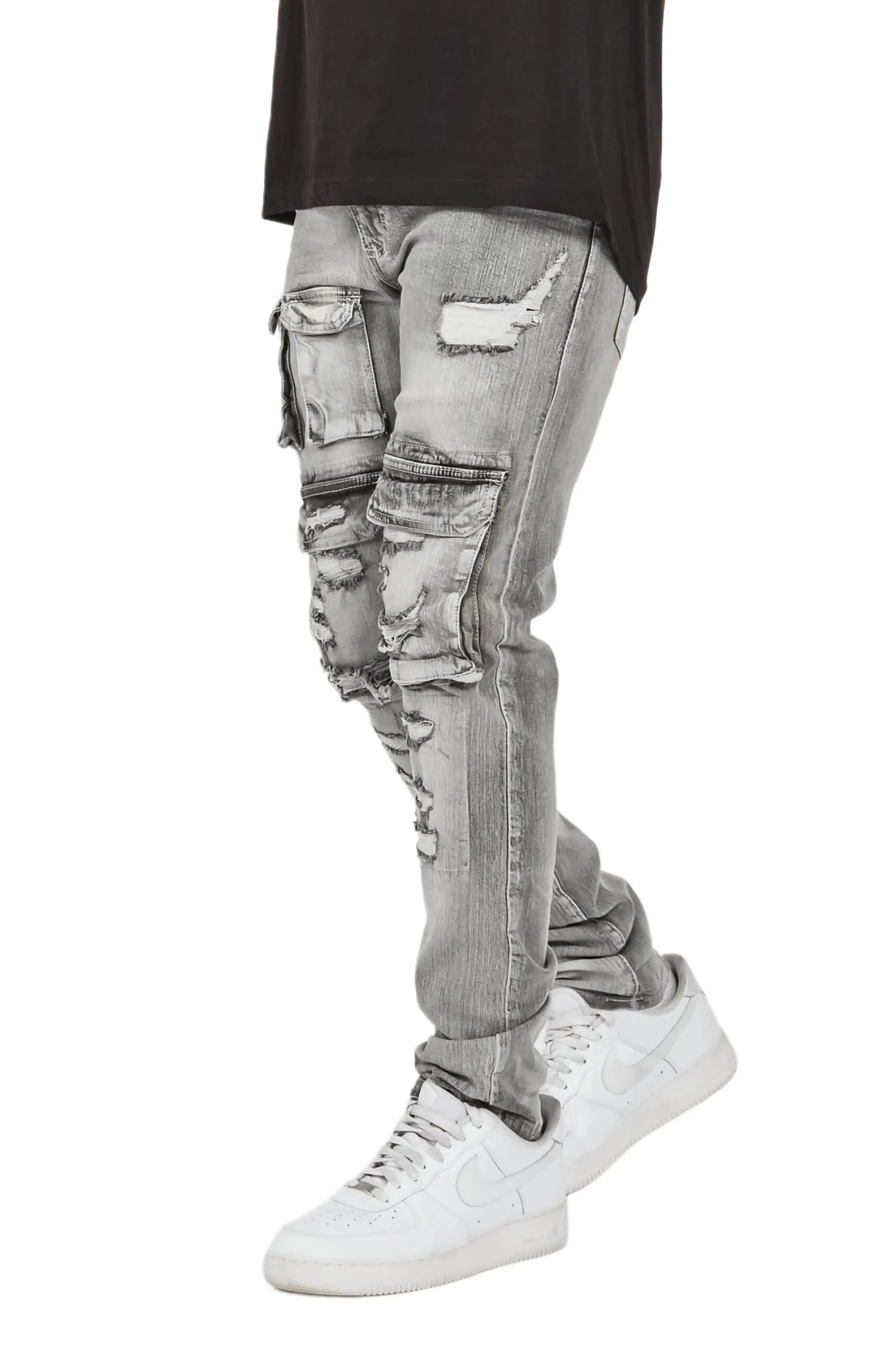 A pair of urban denim cargo jeans for men in grey. Designed with organic cotton and utility pockets for a dope streetwear style.