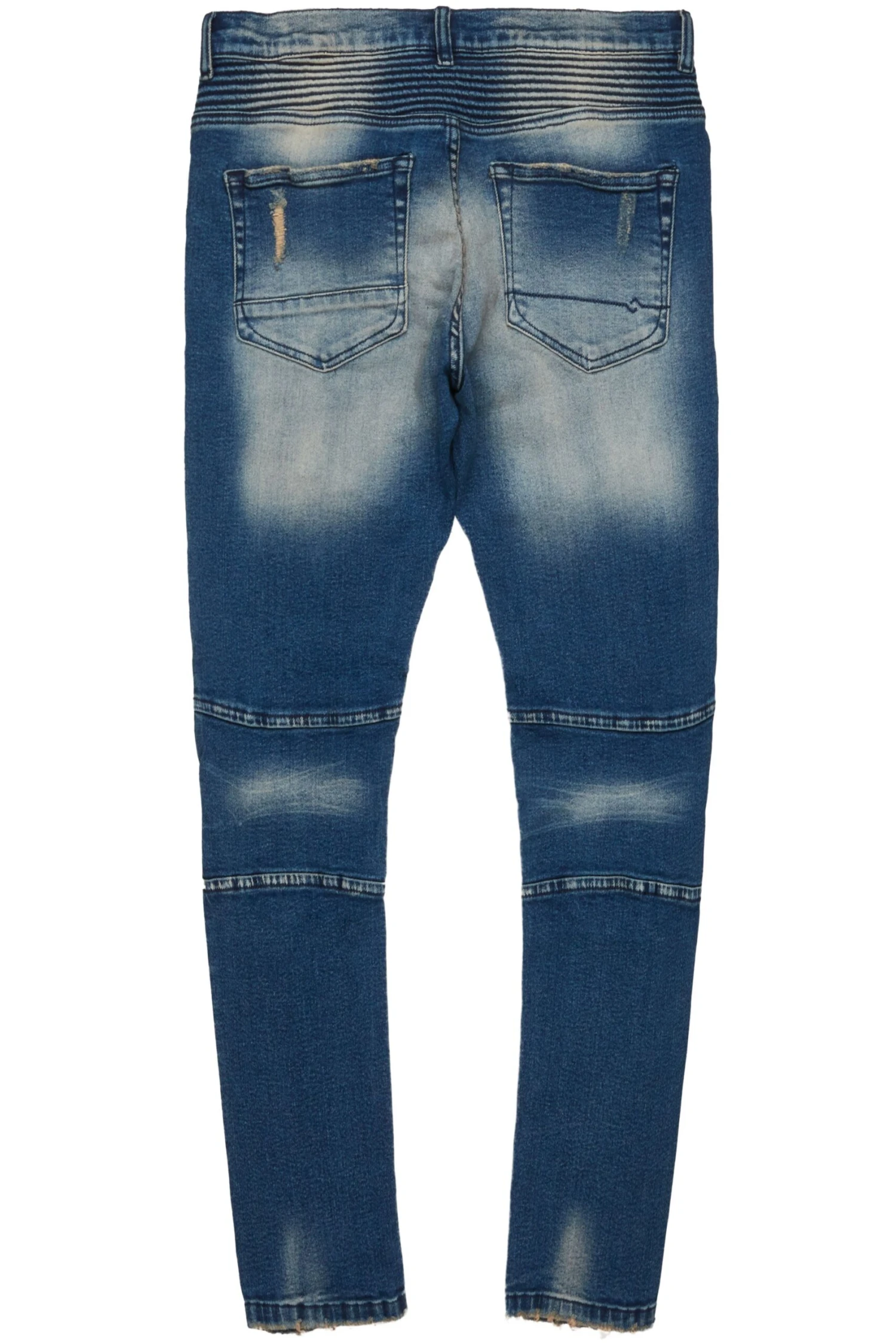 A custom pair of urban streetwear denim jeans for men in blue. Designed with organic cotton and moto-biker details for the perfect everyday style.