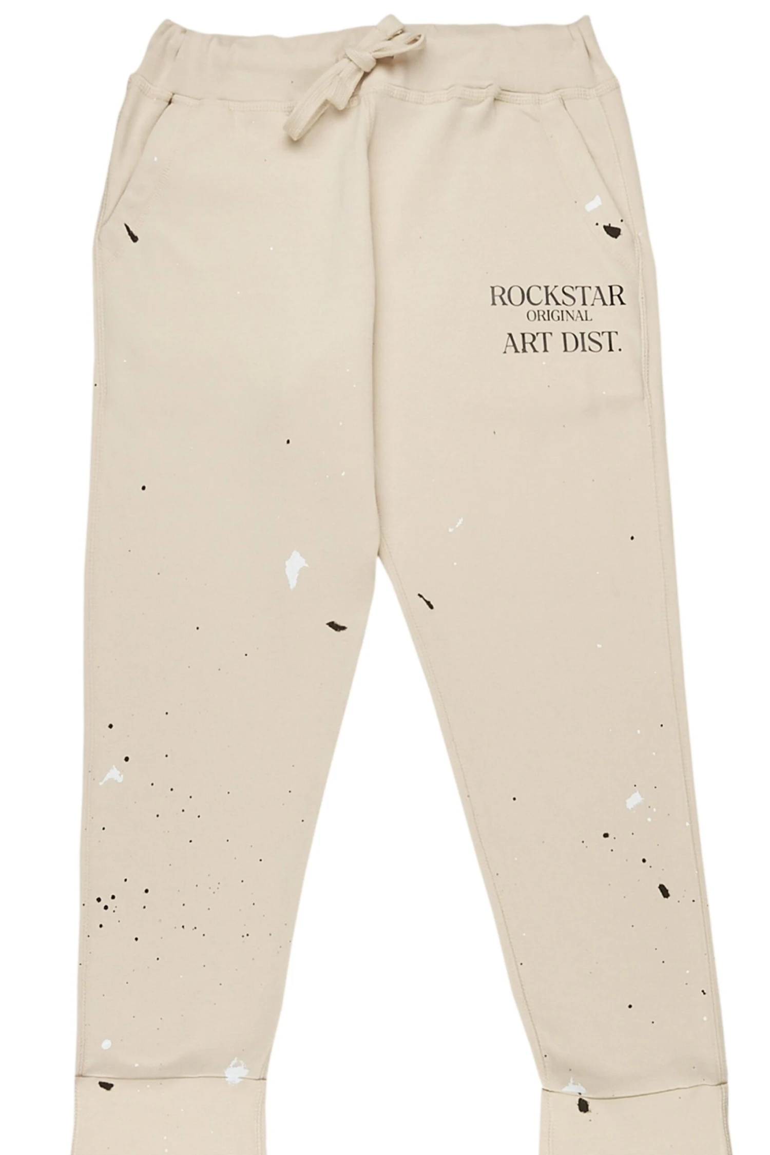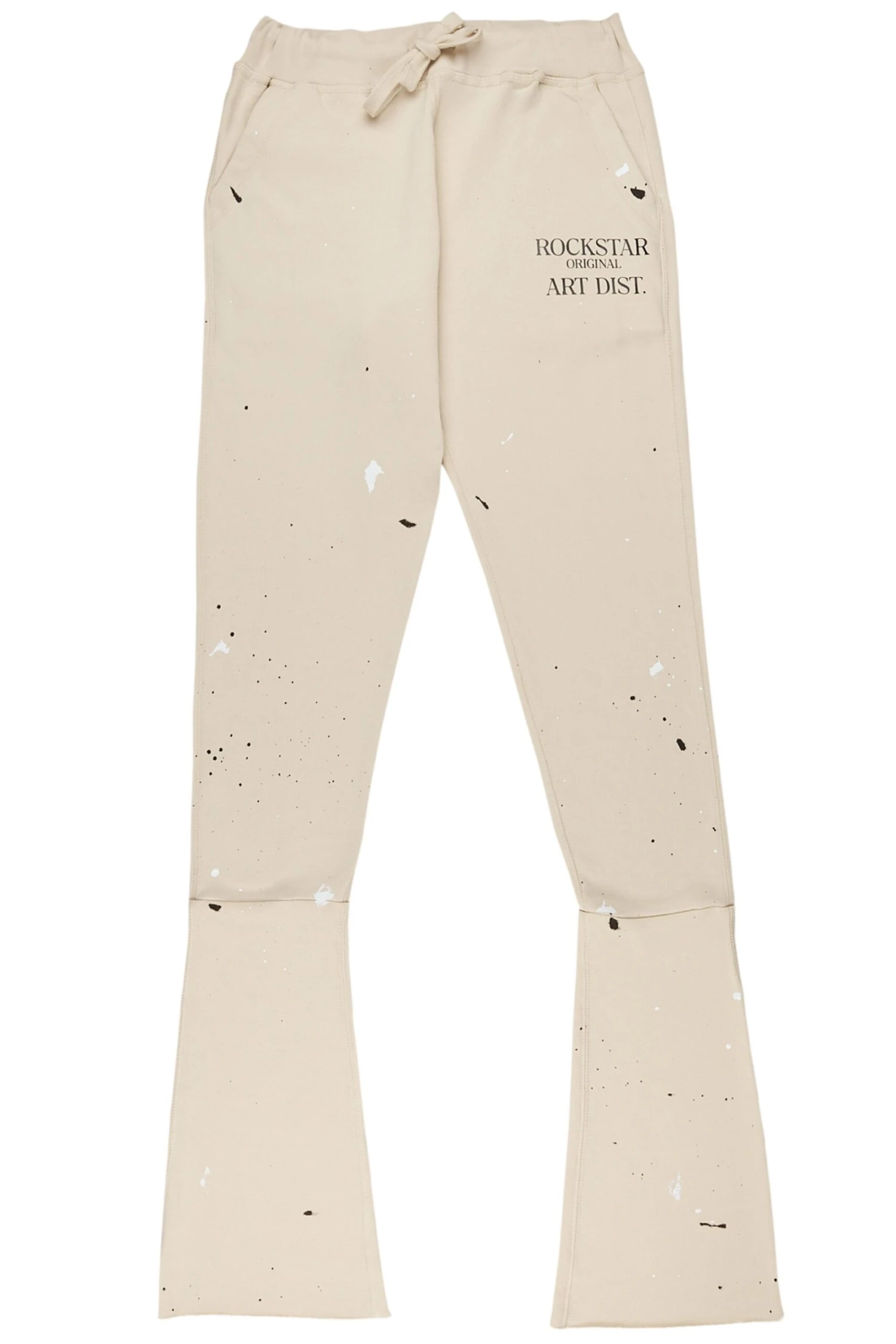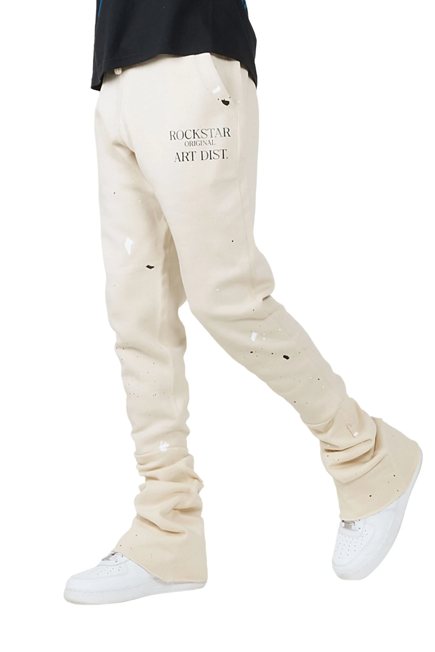 A pair of contemporary super stacked track pants for men in beige. Designed with ultra soft organic cotton and custom paint splatter detailing for a dope streetwear style.