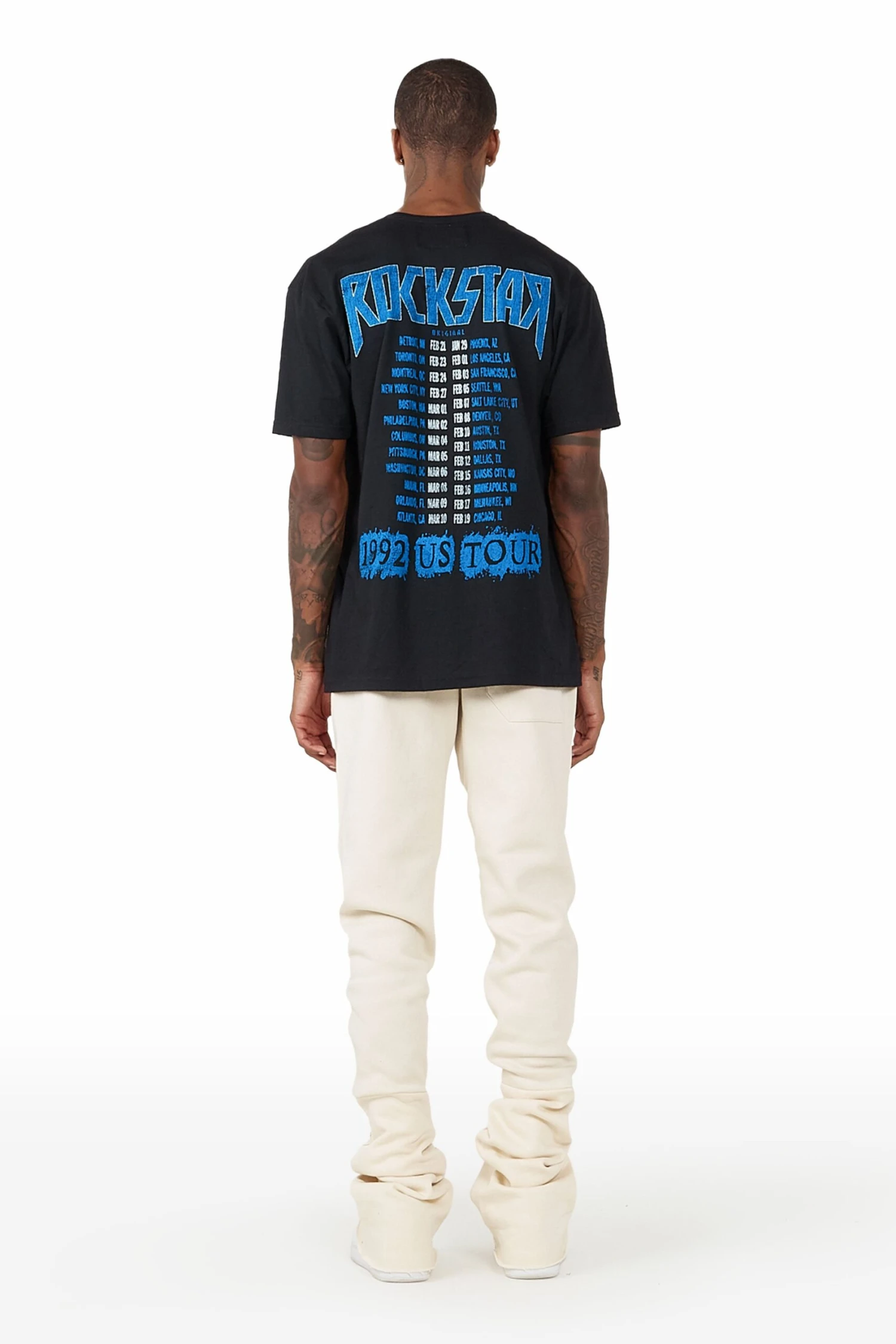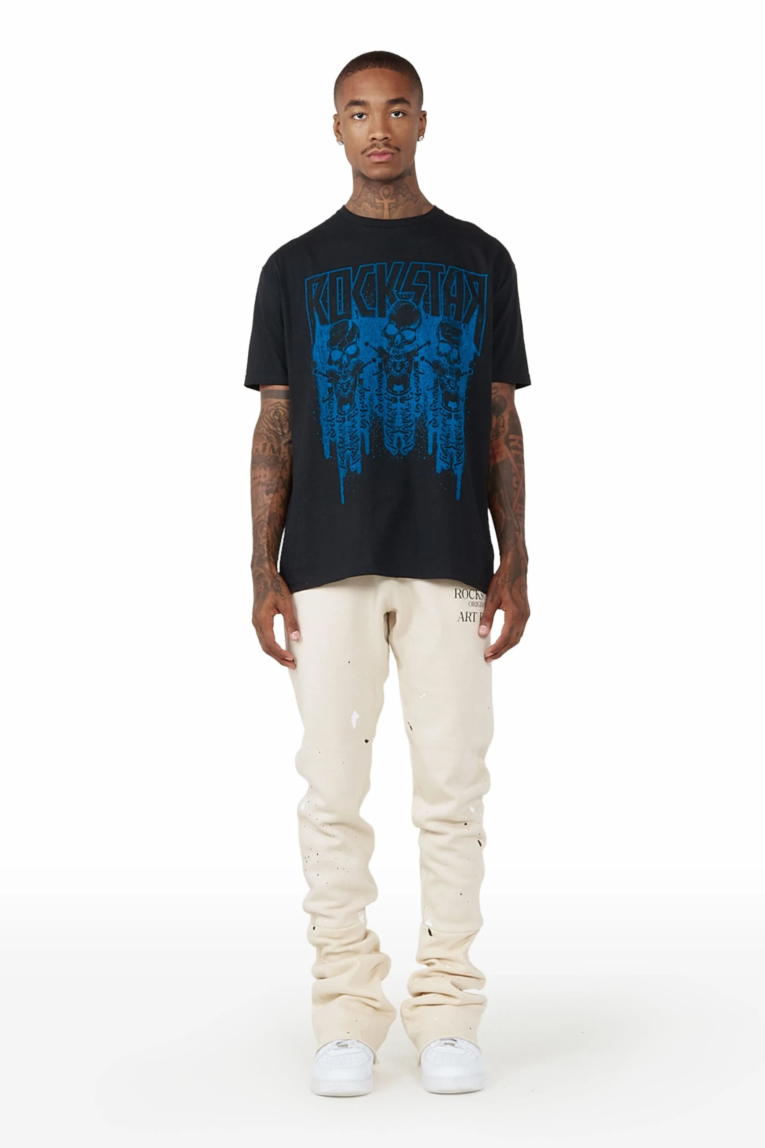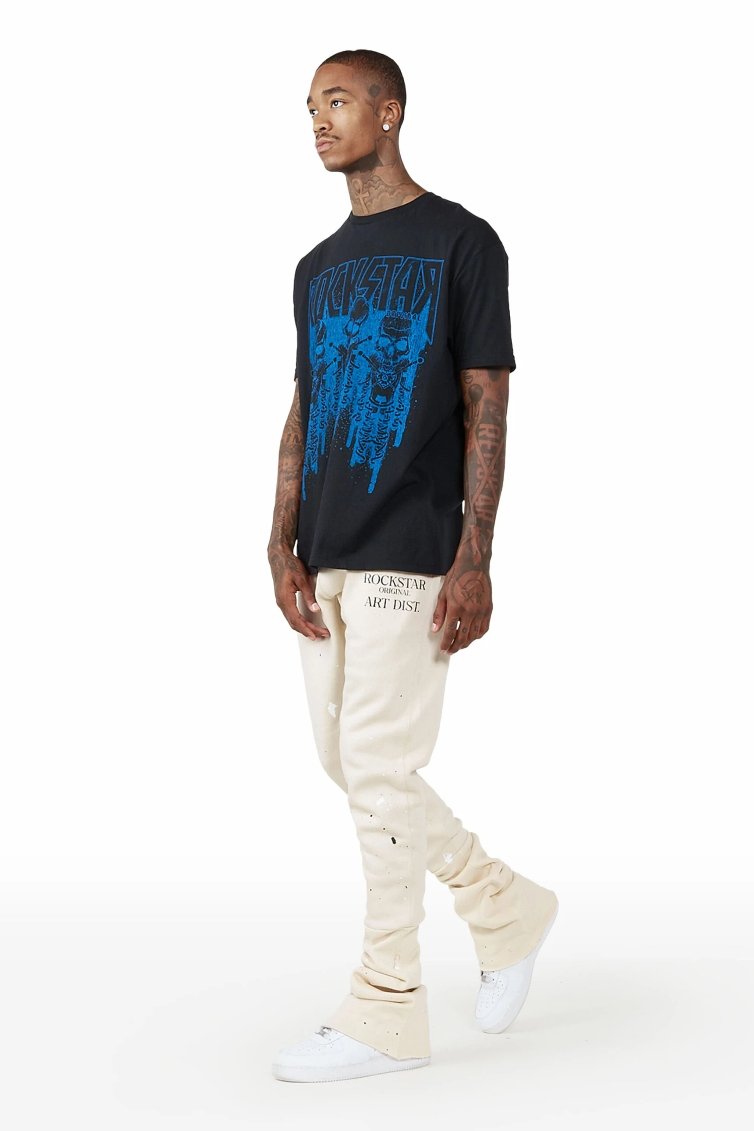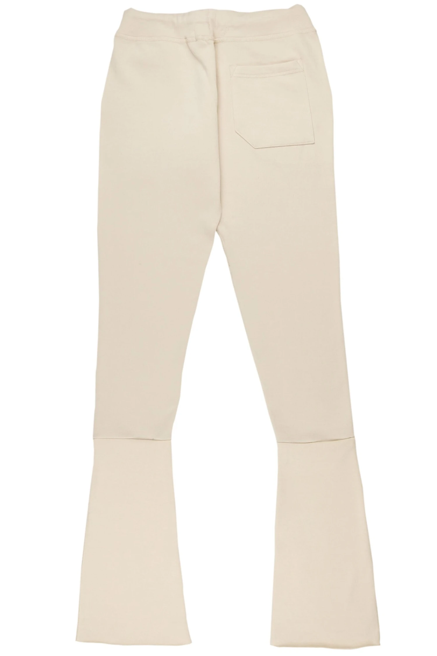 A pair of contemporary super stacked track pants for men in beige. Designed with ultra soft organic cotton and custom paint splatter detailing for a dope streetwear style.