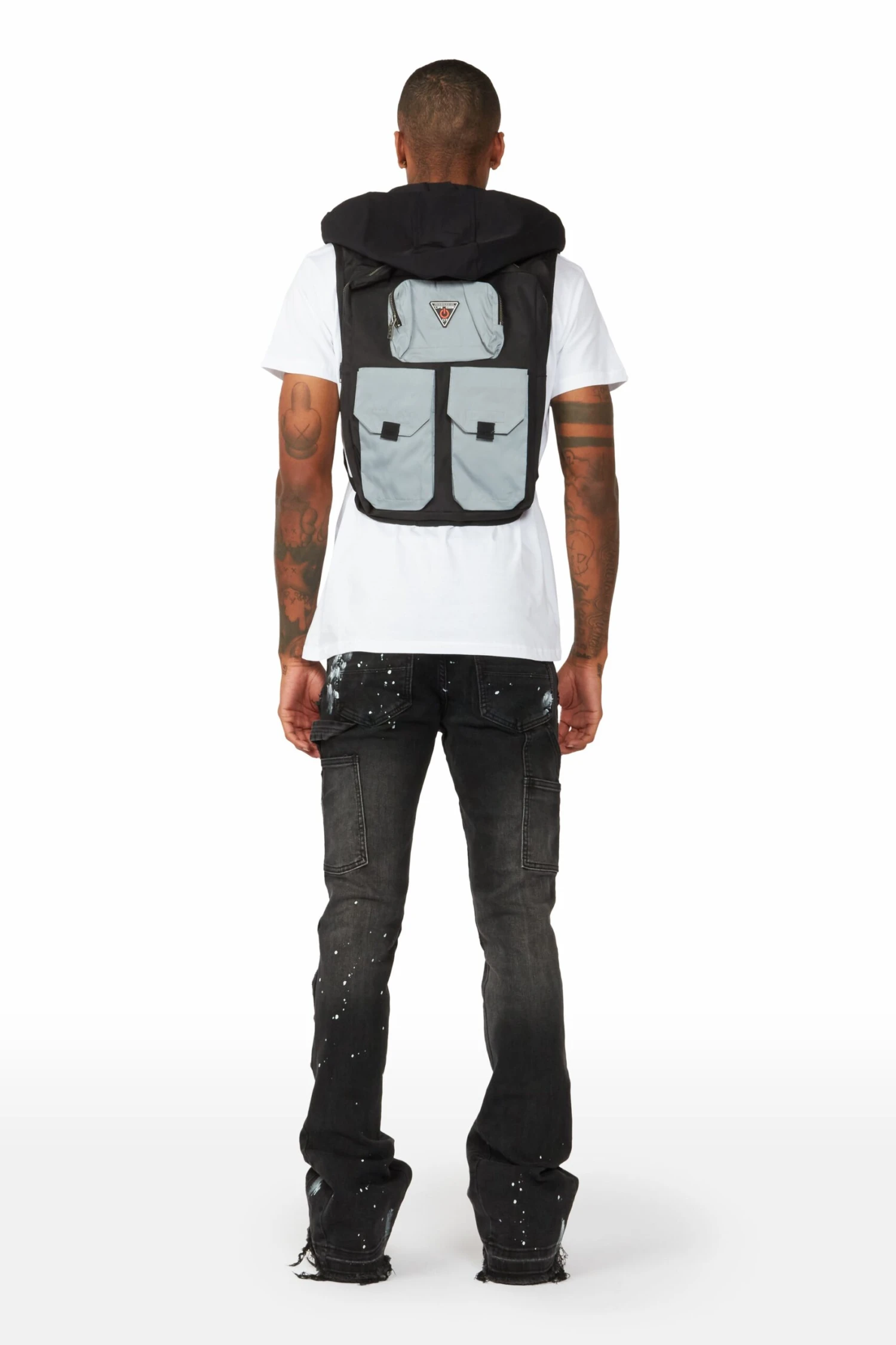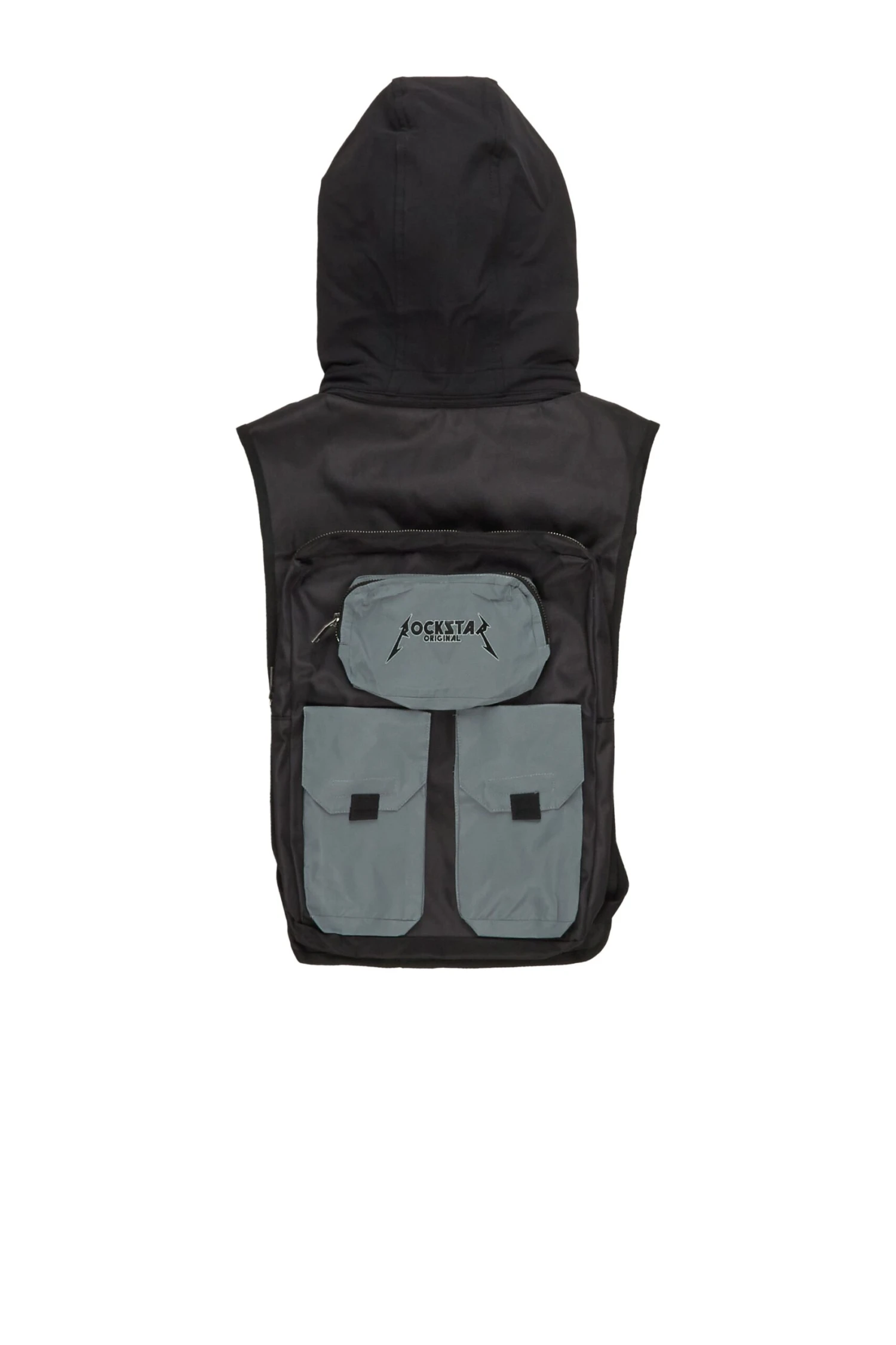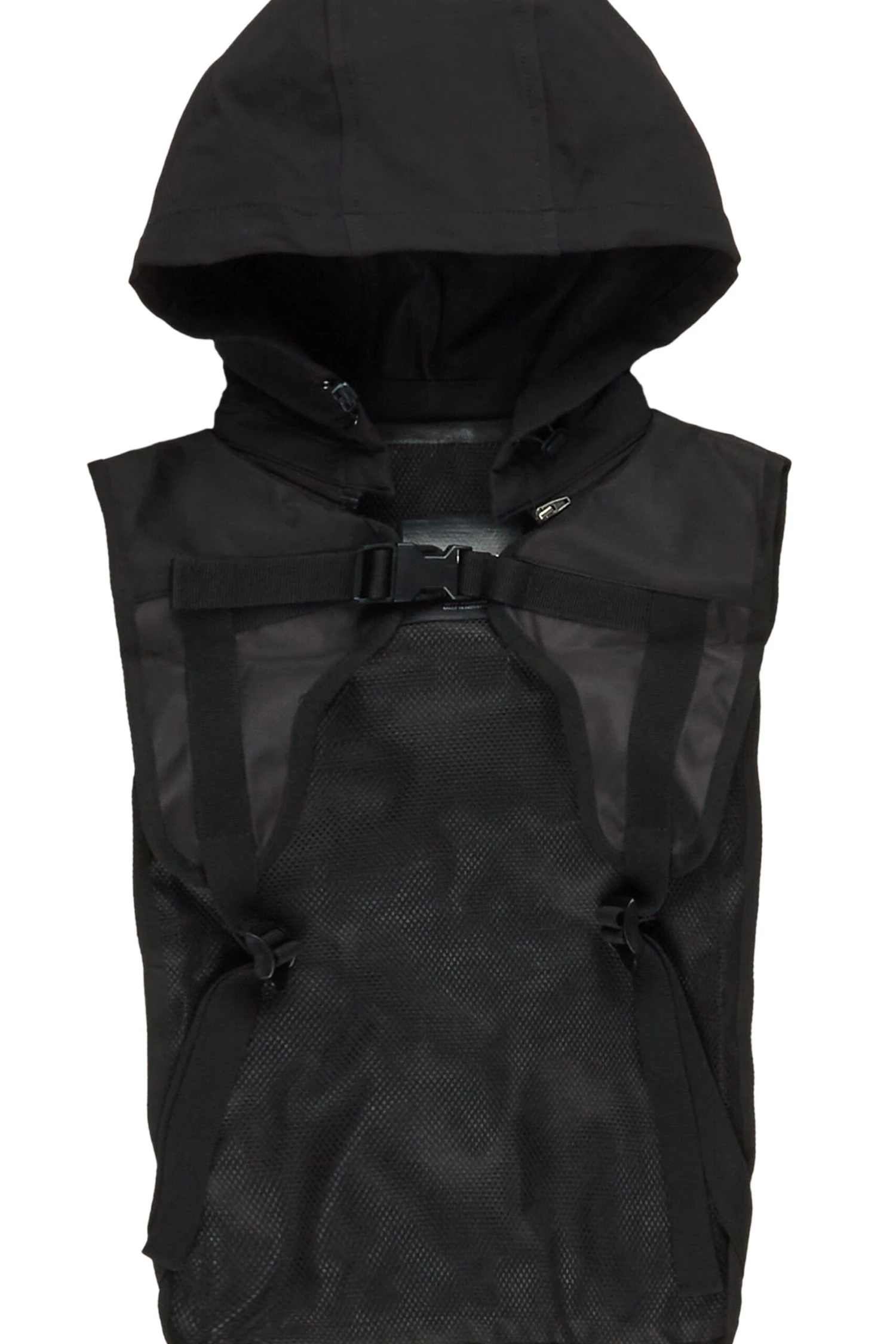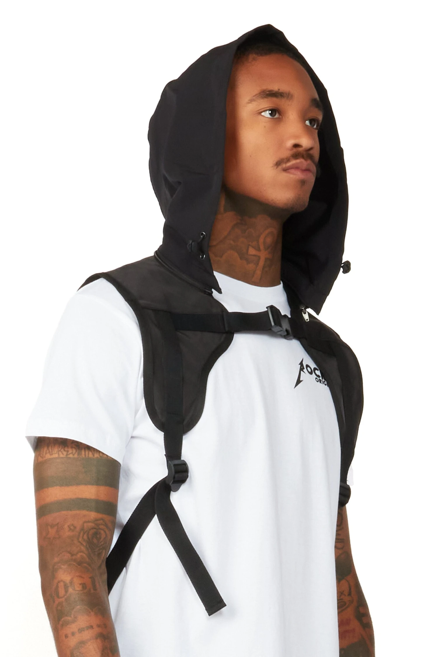 An urban streetwearĀ backpackĀ vest for men inĀ black. Designed withĀ water-repellentĀ nylon andĀ utility pockets for a versatile style.