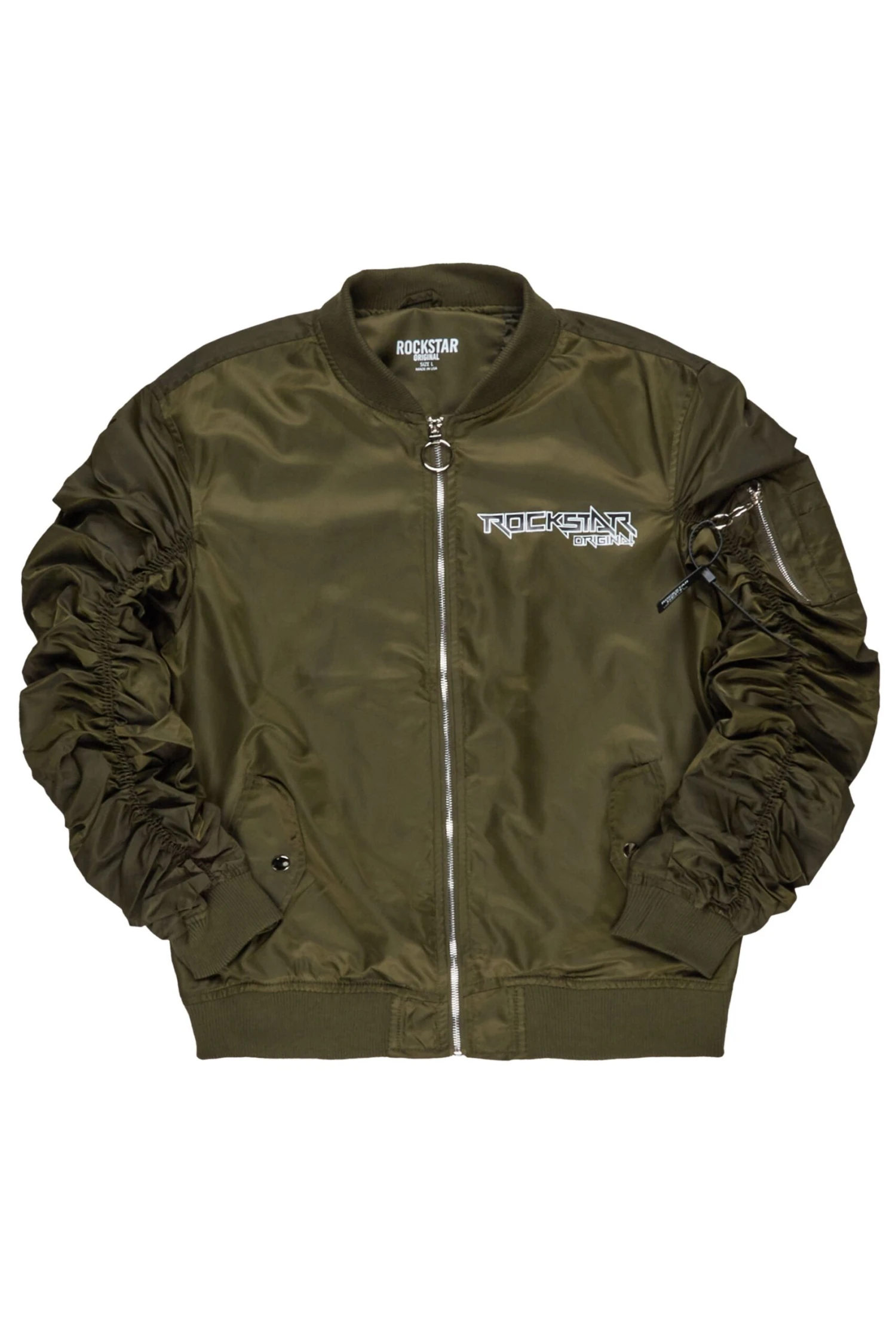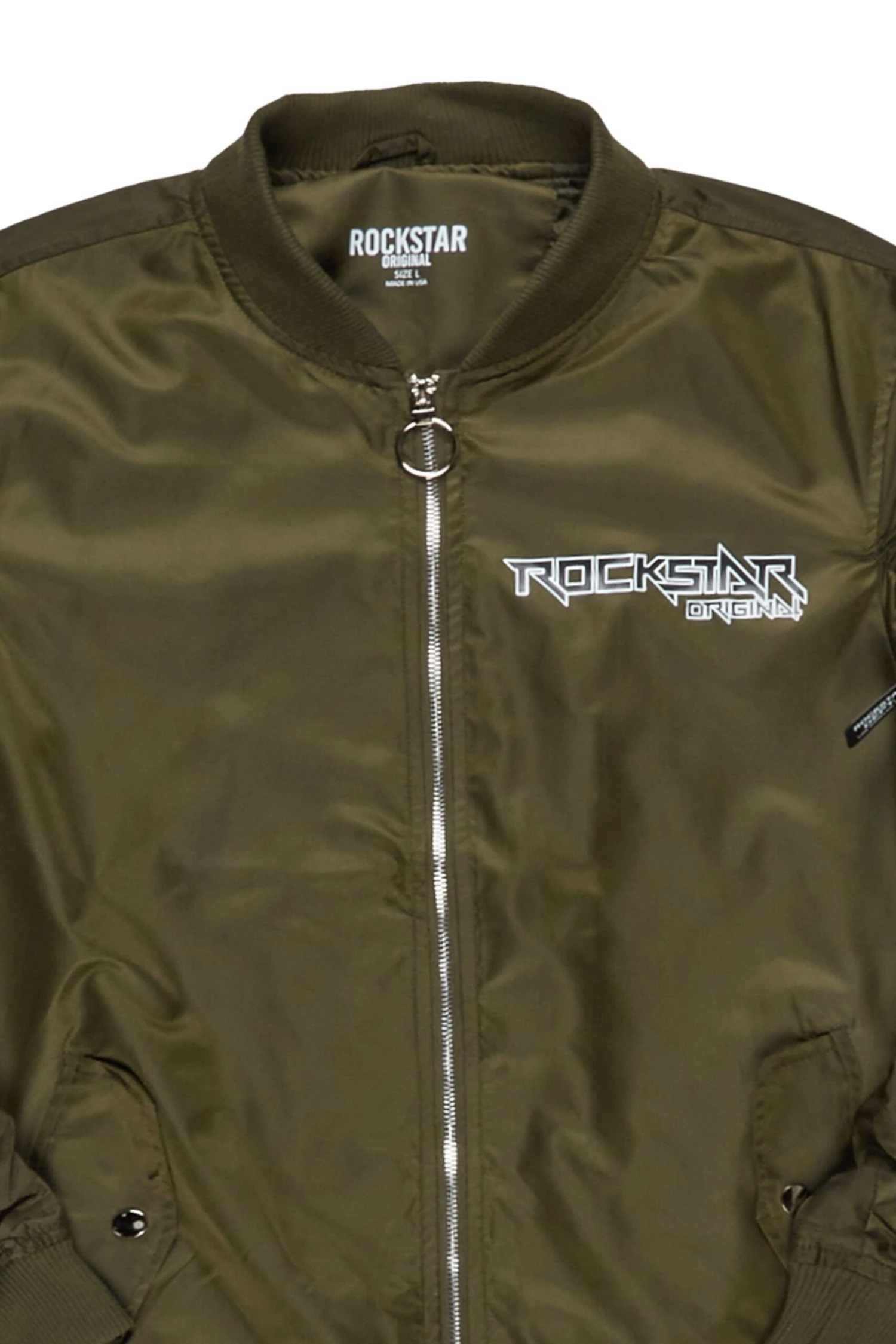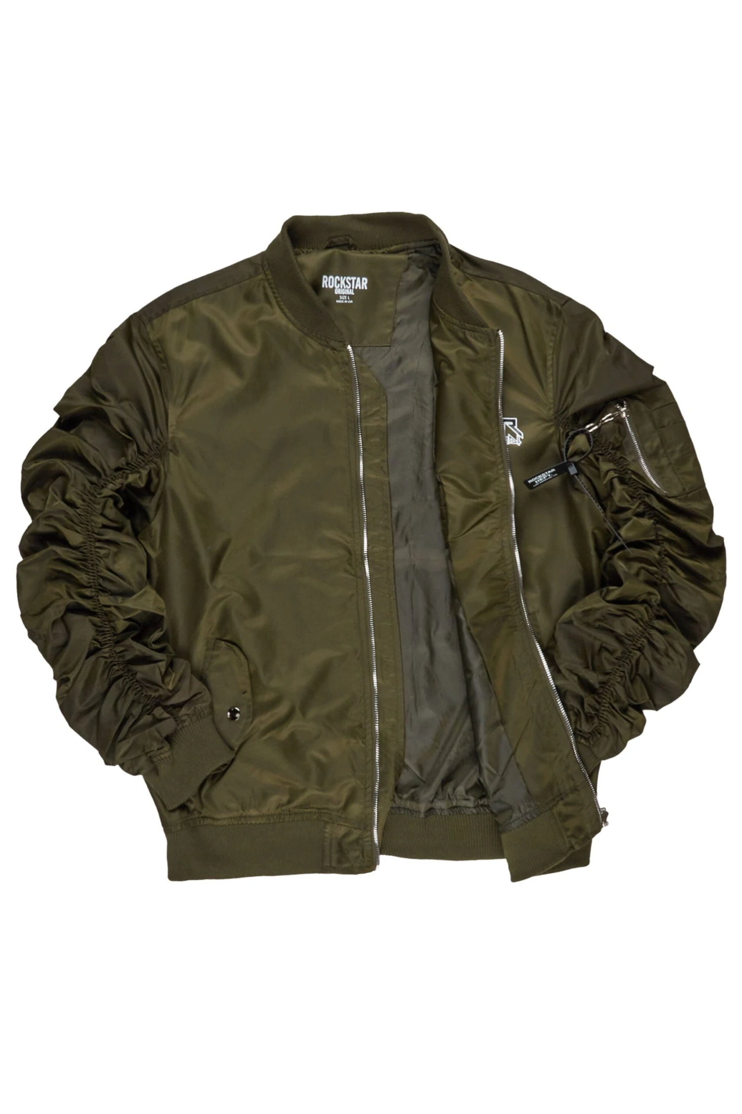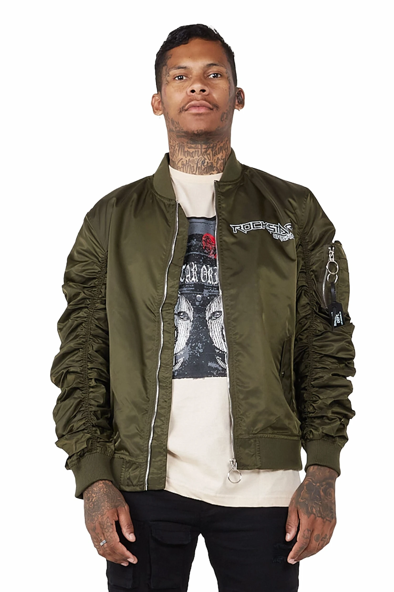 An MA-1 flight jacket style bomber jacket for men in olive. Designed with water-repellent fabric and a relaxed-fit for a must-cop outerwear style.
