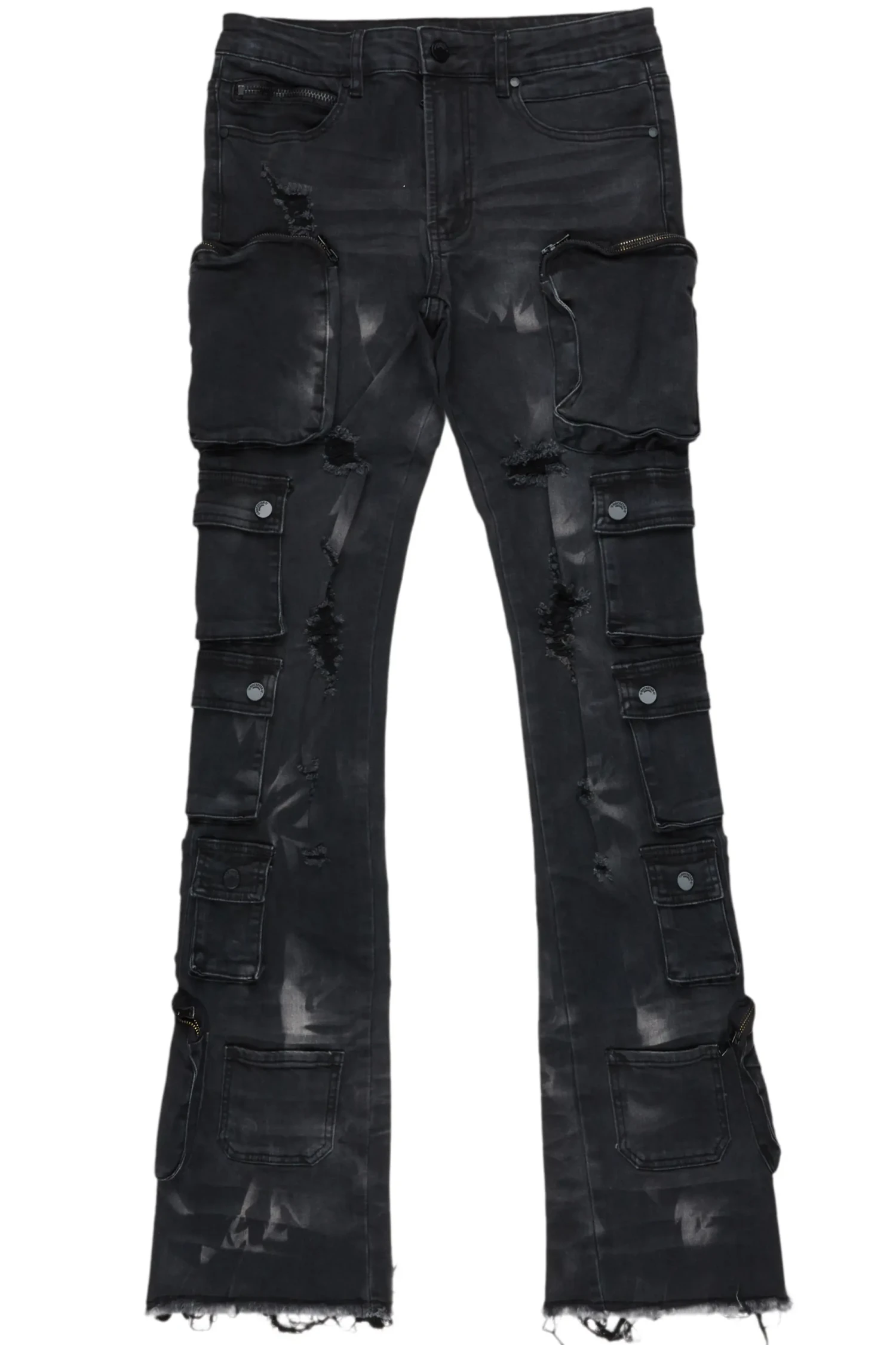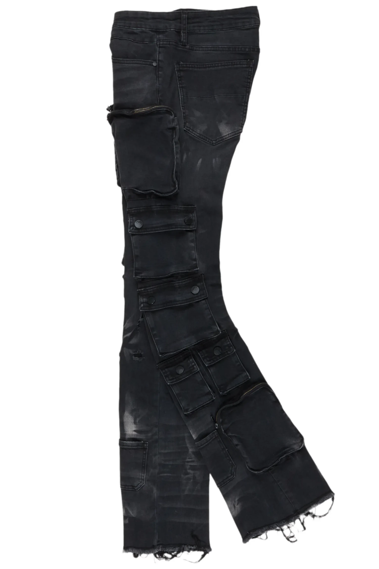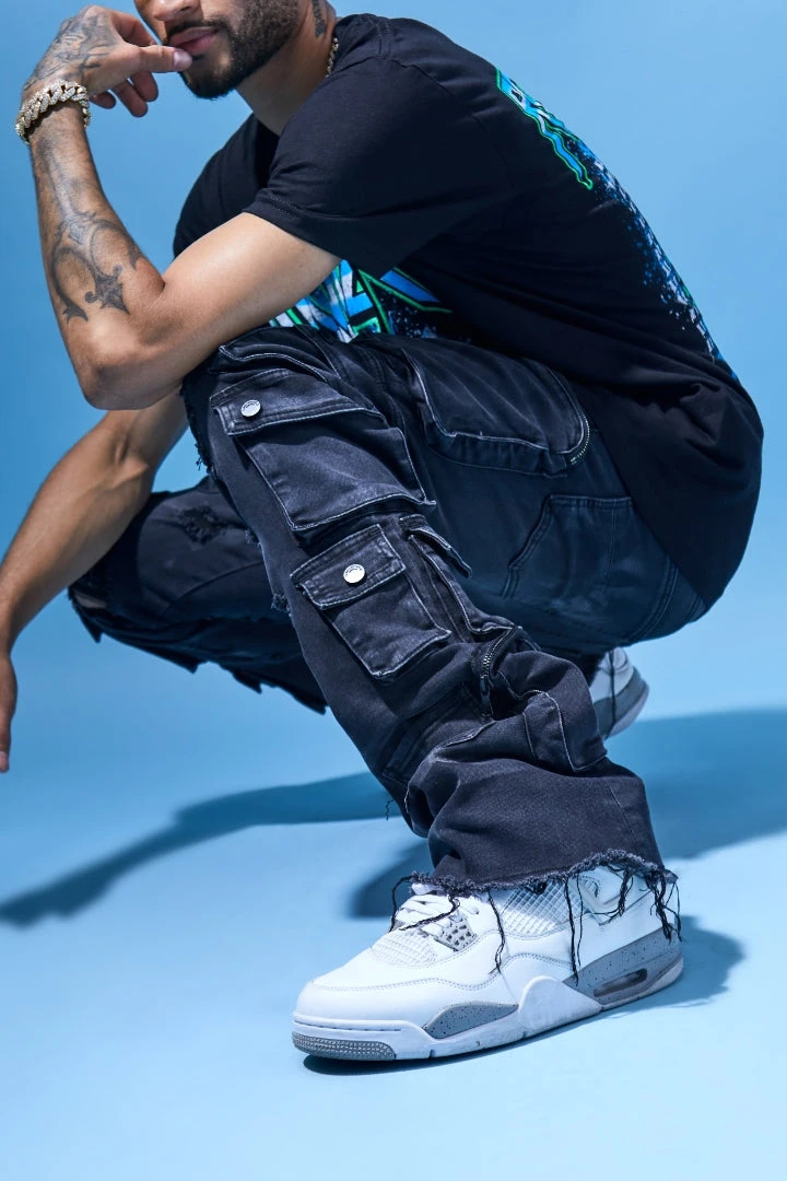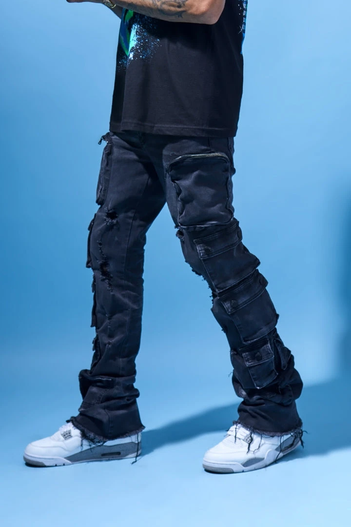 An urban cargo stacked flare jean for men in grey wash. Designed with organic cotton and extra long legs for a dope denim streetwear style.Â