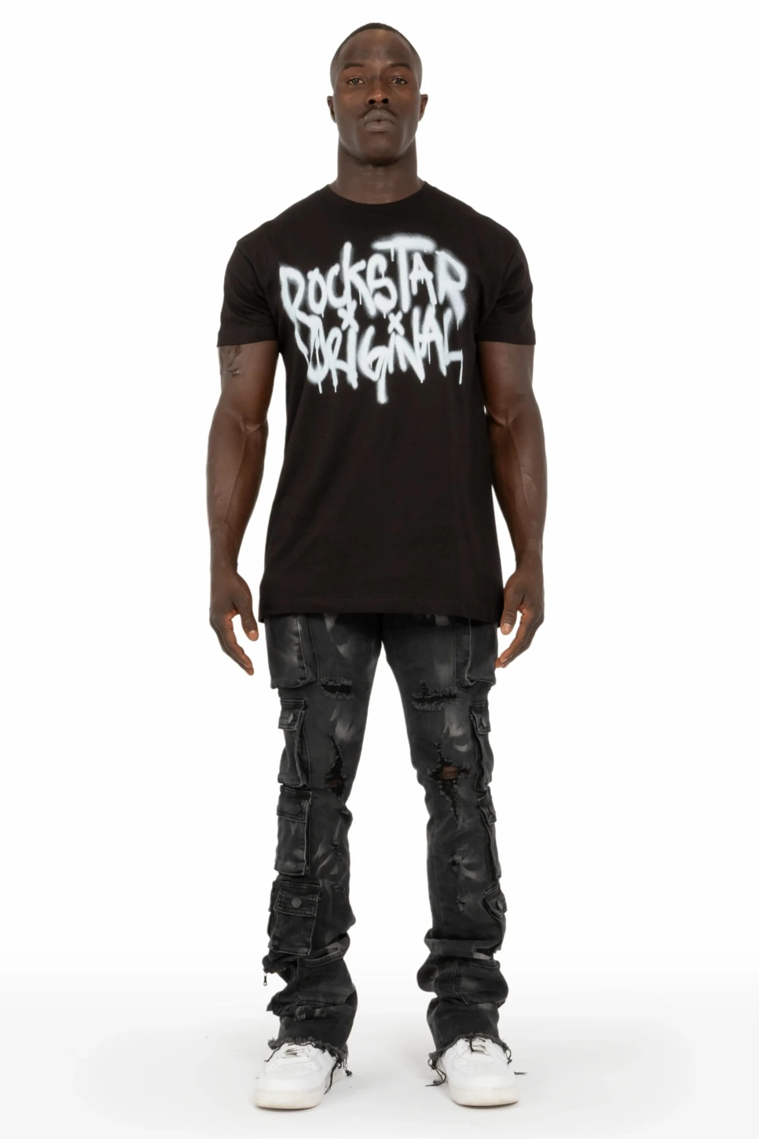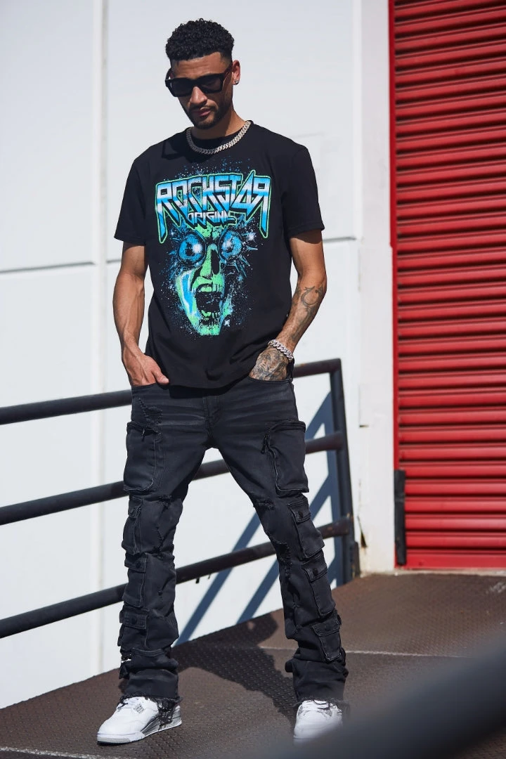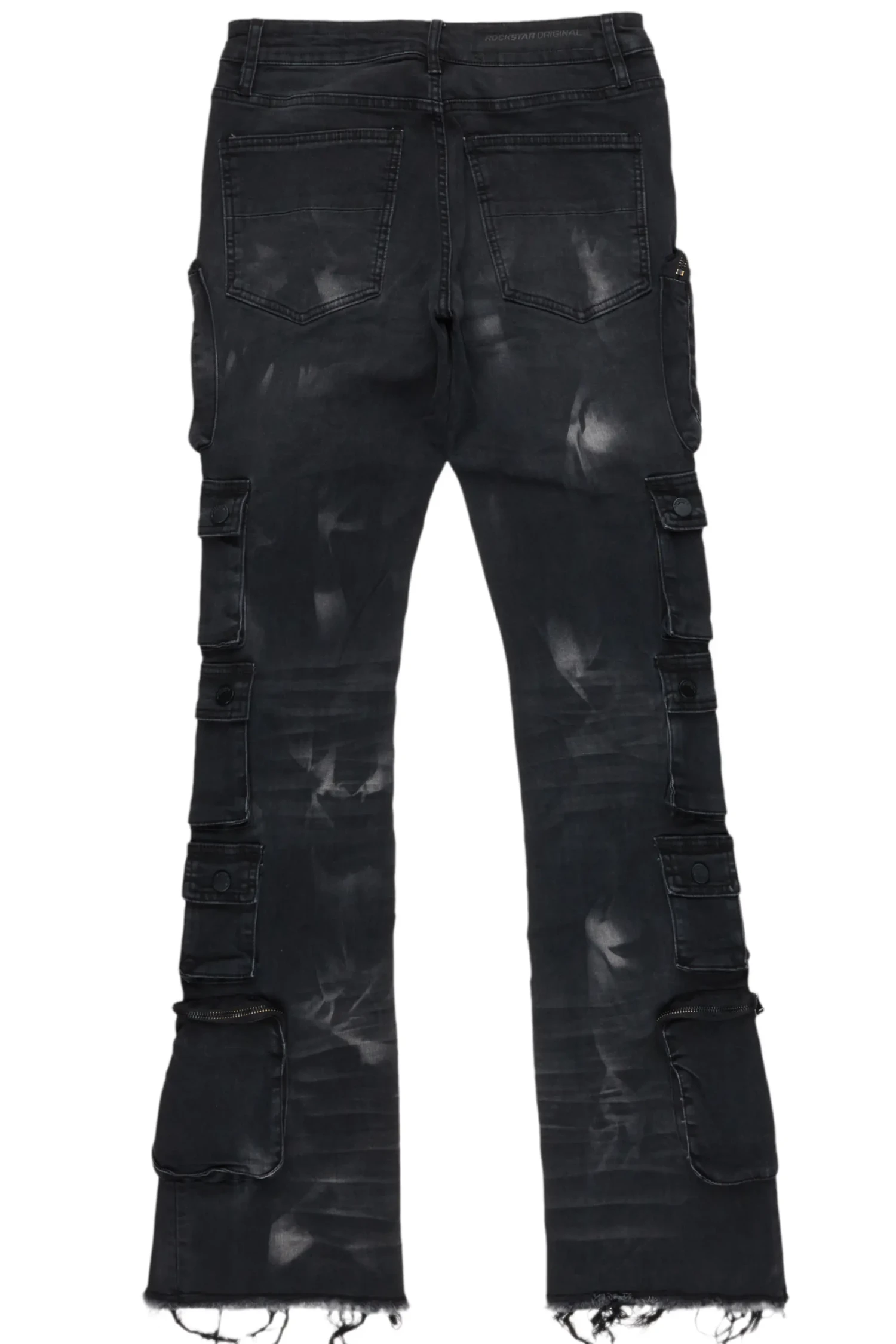 An urban cargo stacked flare jean for men in grey wash. Designed with organic cotton and extra long legs for a dope denim streetwear style.Â
