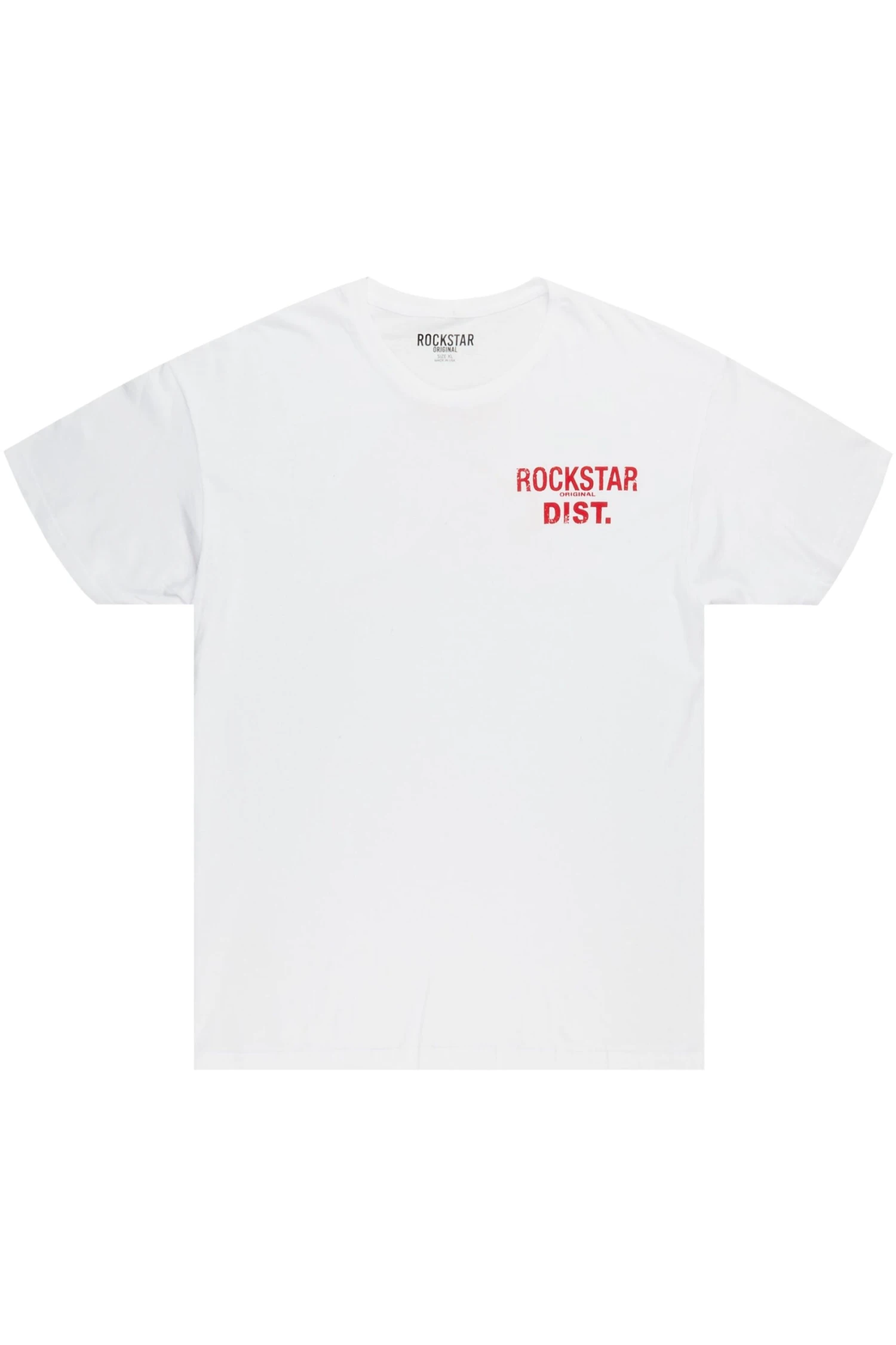 An urban streetwear t-shirt for men in white. Designed with organic cotton and a custom vintage-inspired graphic logo for the perfect staple piece tee.
