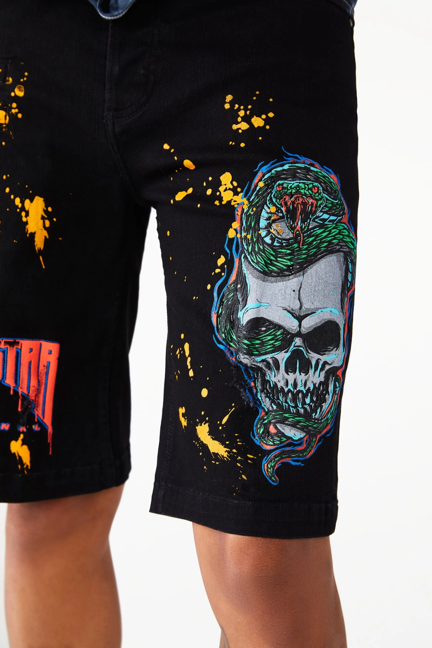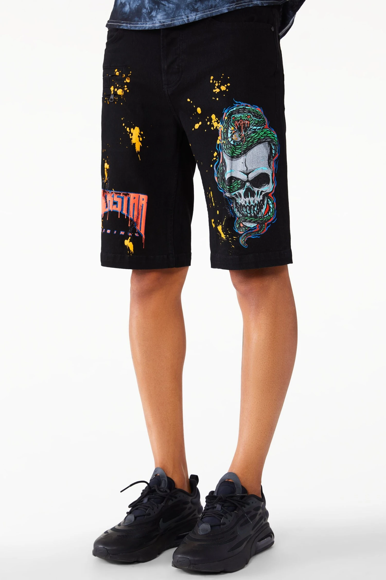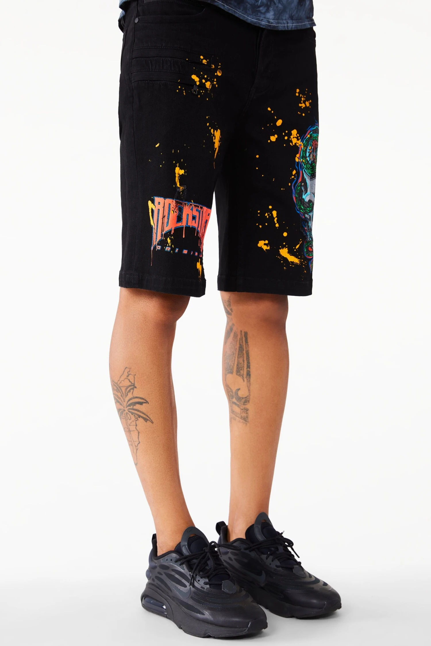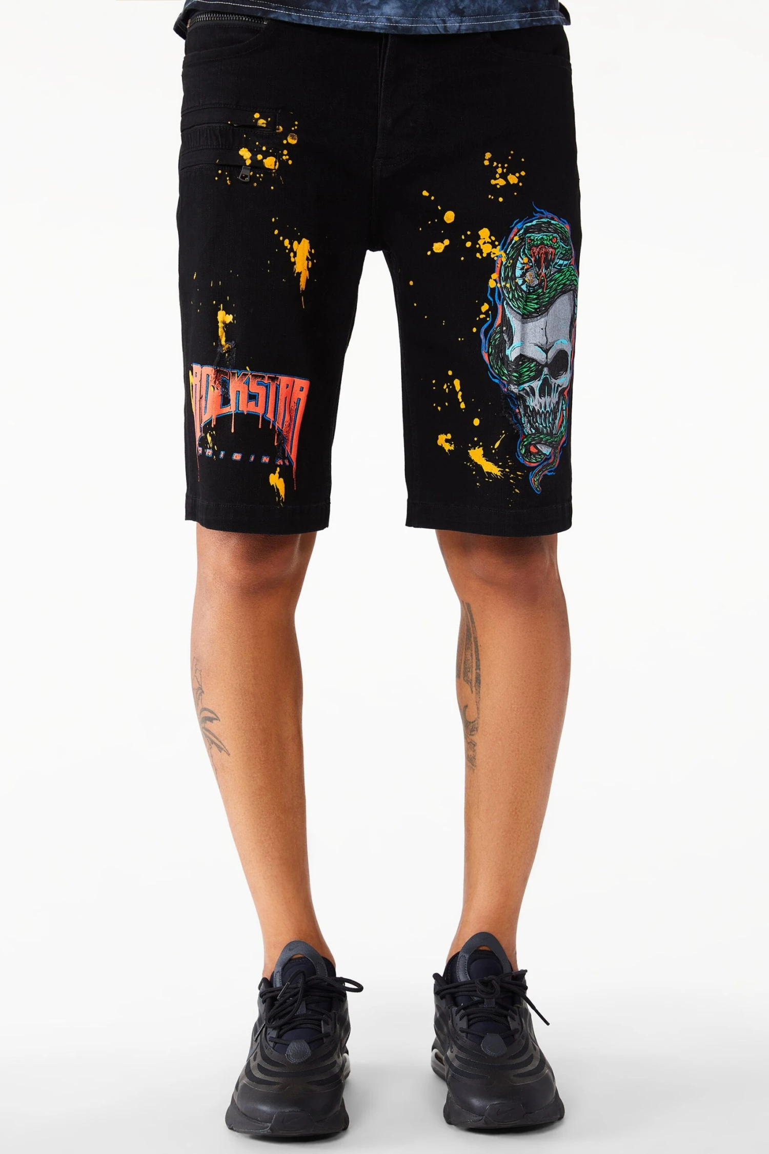Rockstar Original Men’s denim shorts in black. Featuring a printed RSO logo with snake and skull graphics to match. Accenting custom paint splatter detailing throughout with a high quality zipper coin pocket.