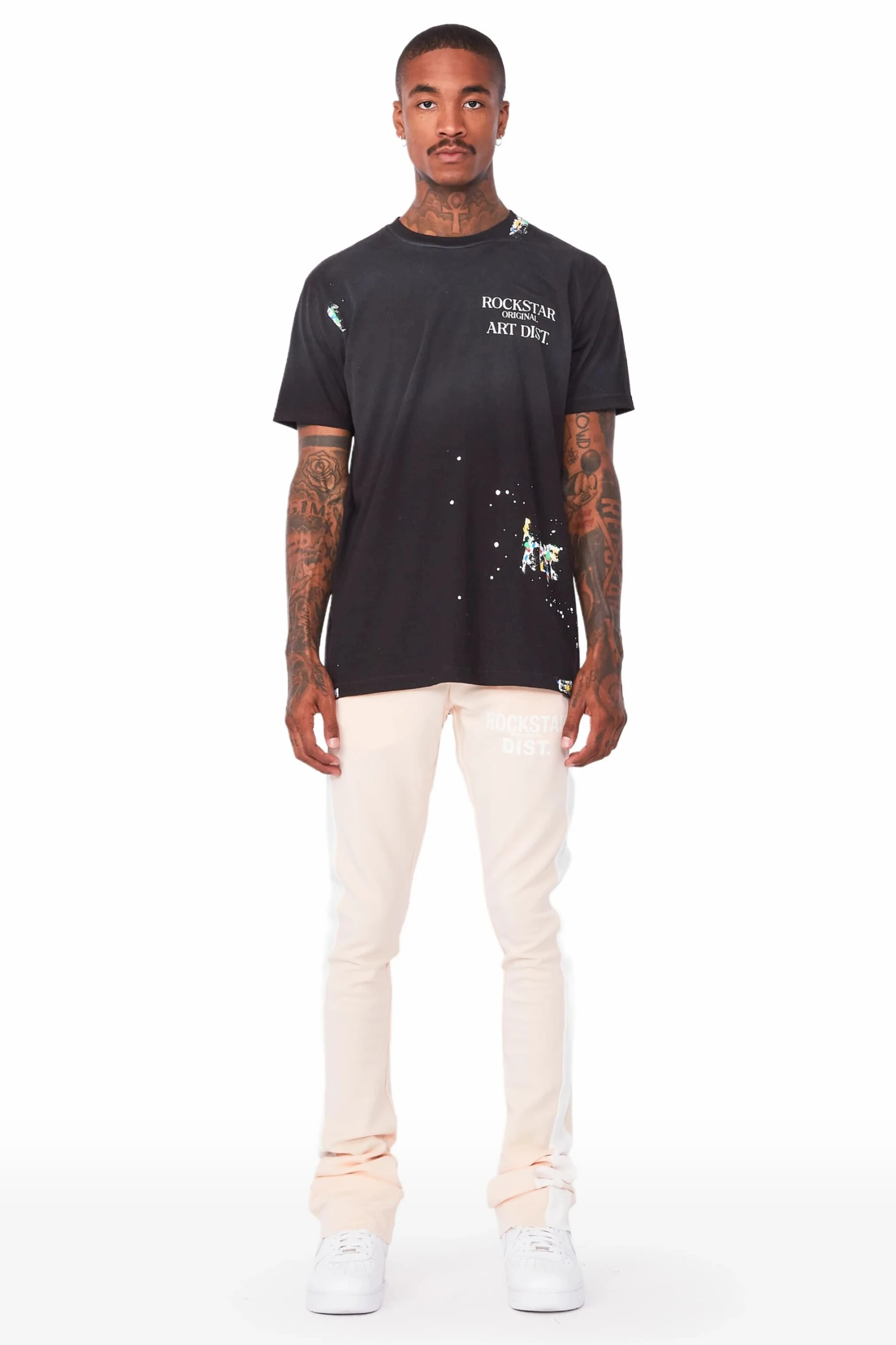A pair of contemporary super stacked track pants for men in beige. Designed with ultra soft fabric and extended seams for a dope streetwear style.