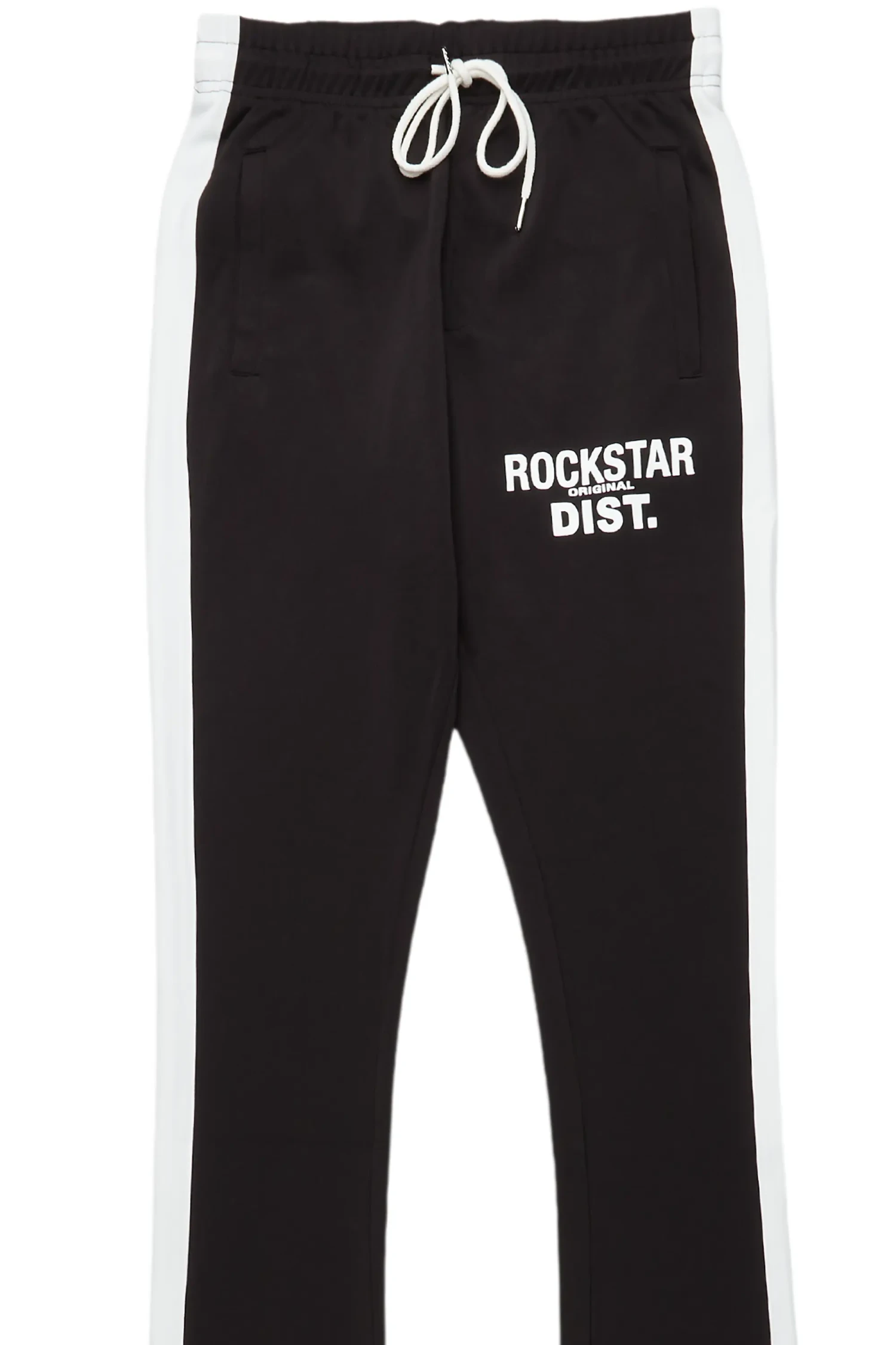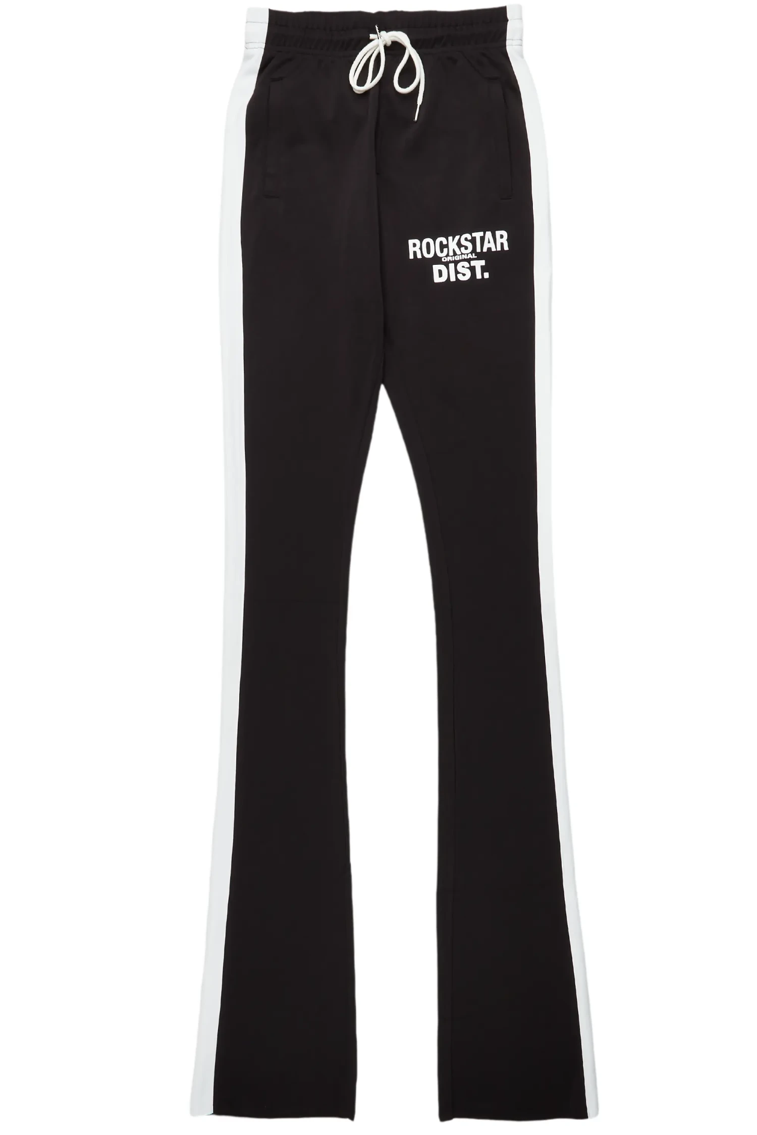 A pair of contemporary super stacked track pants for men in black. Designed with ultra soft fabric and extended seams for a dope streetwear style.