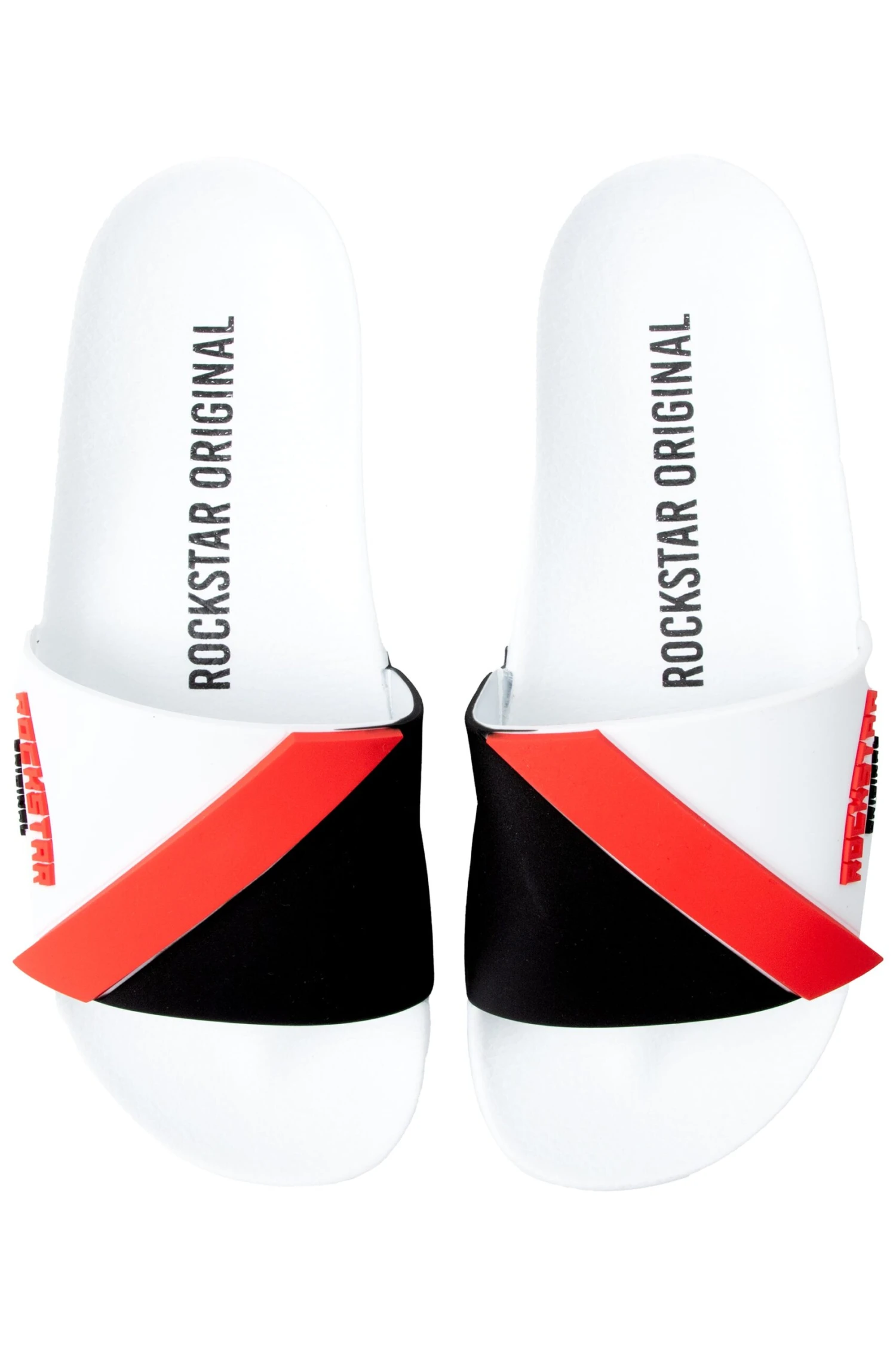 Rockstar Original unisex slides featuring a RSO logo with two pinstripe details. Comfortable synthetic upper and outsole.