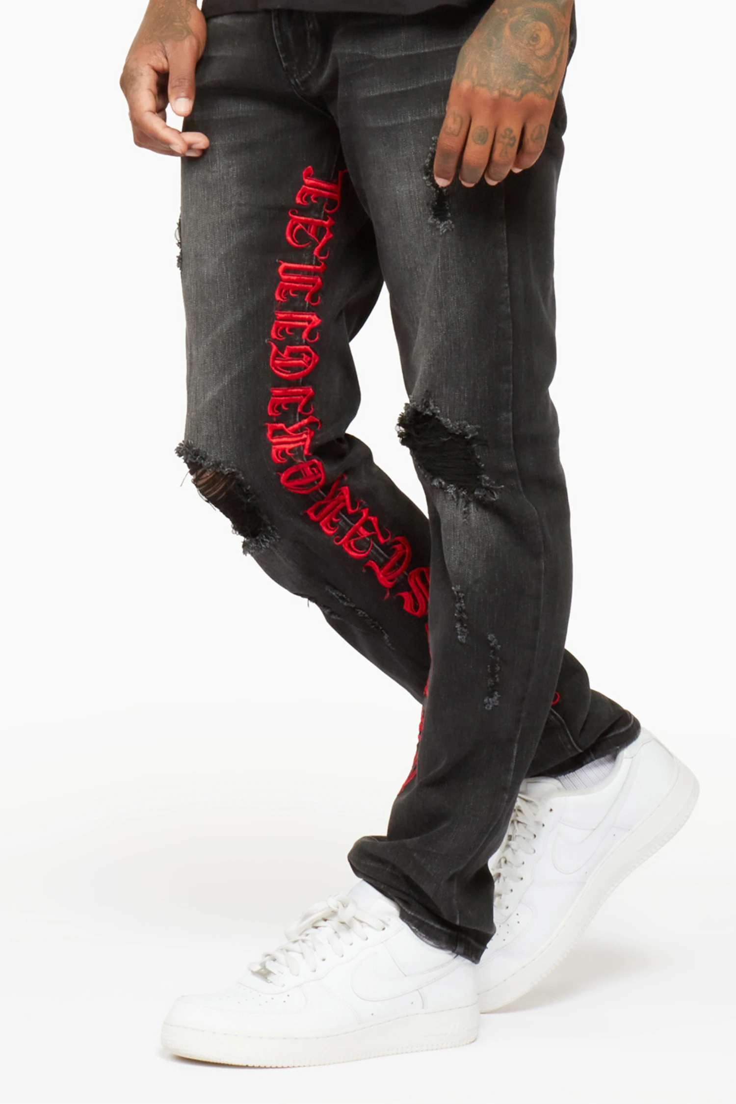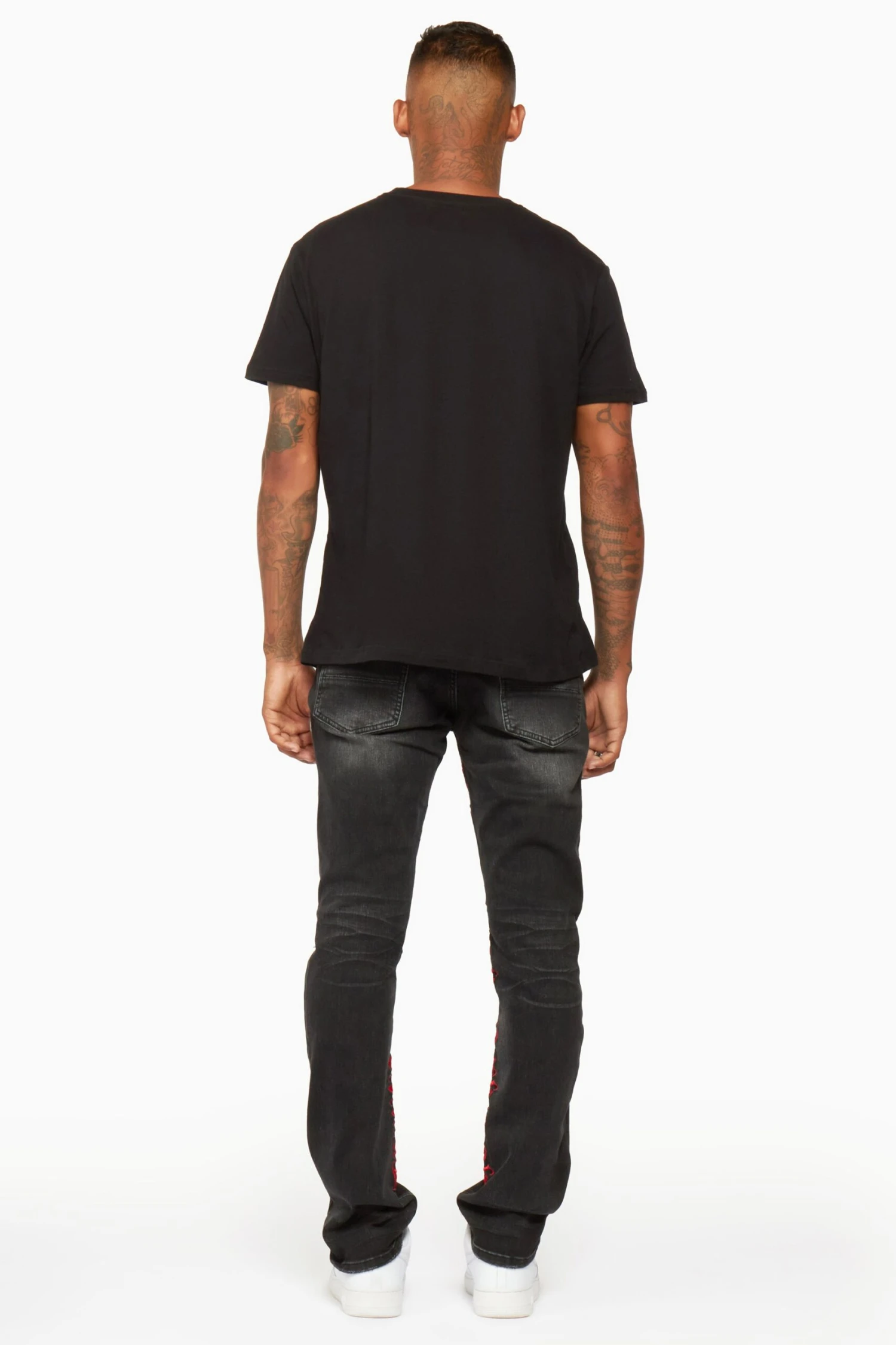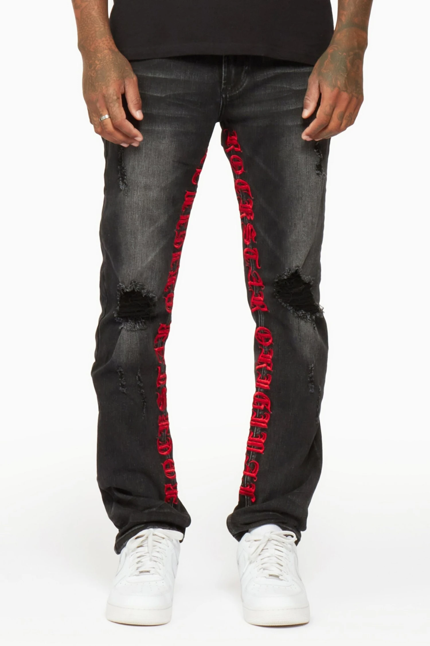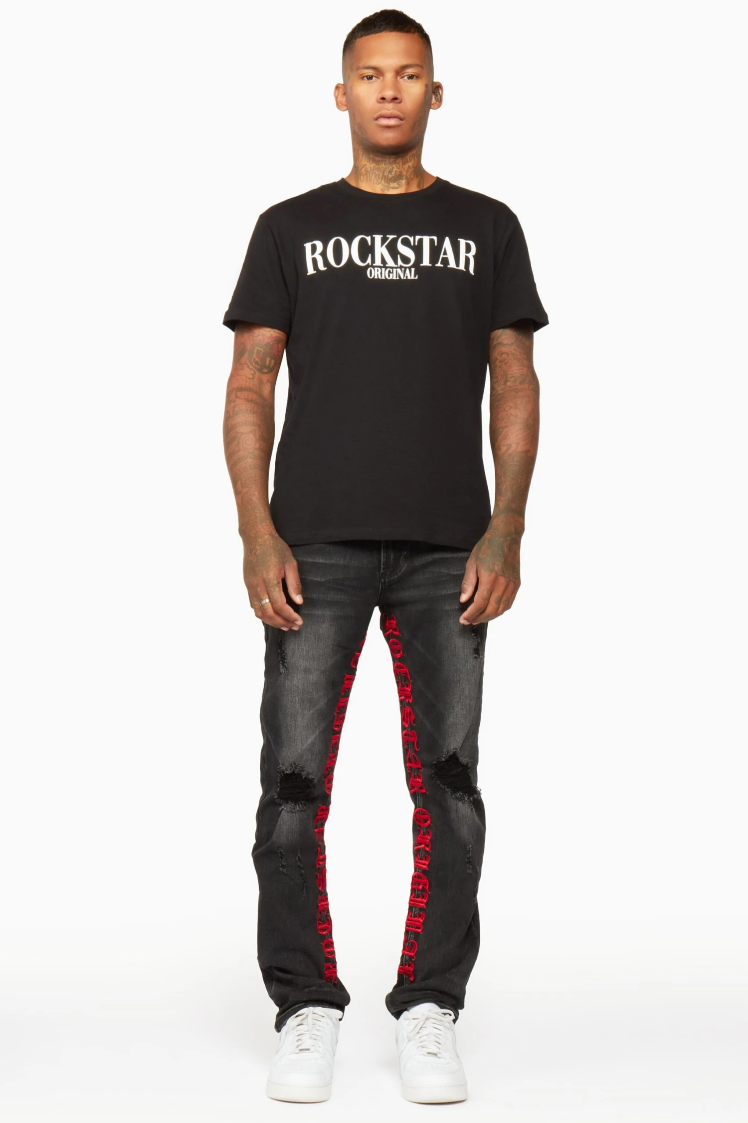 Rockstar Original Men’s denim jean in black. Featuring bleached designing with raw distressed detailing throughout. Accenting embroidered RSO logos on the inner leg seams and a straight leg fit.