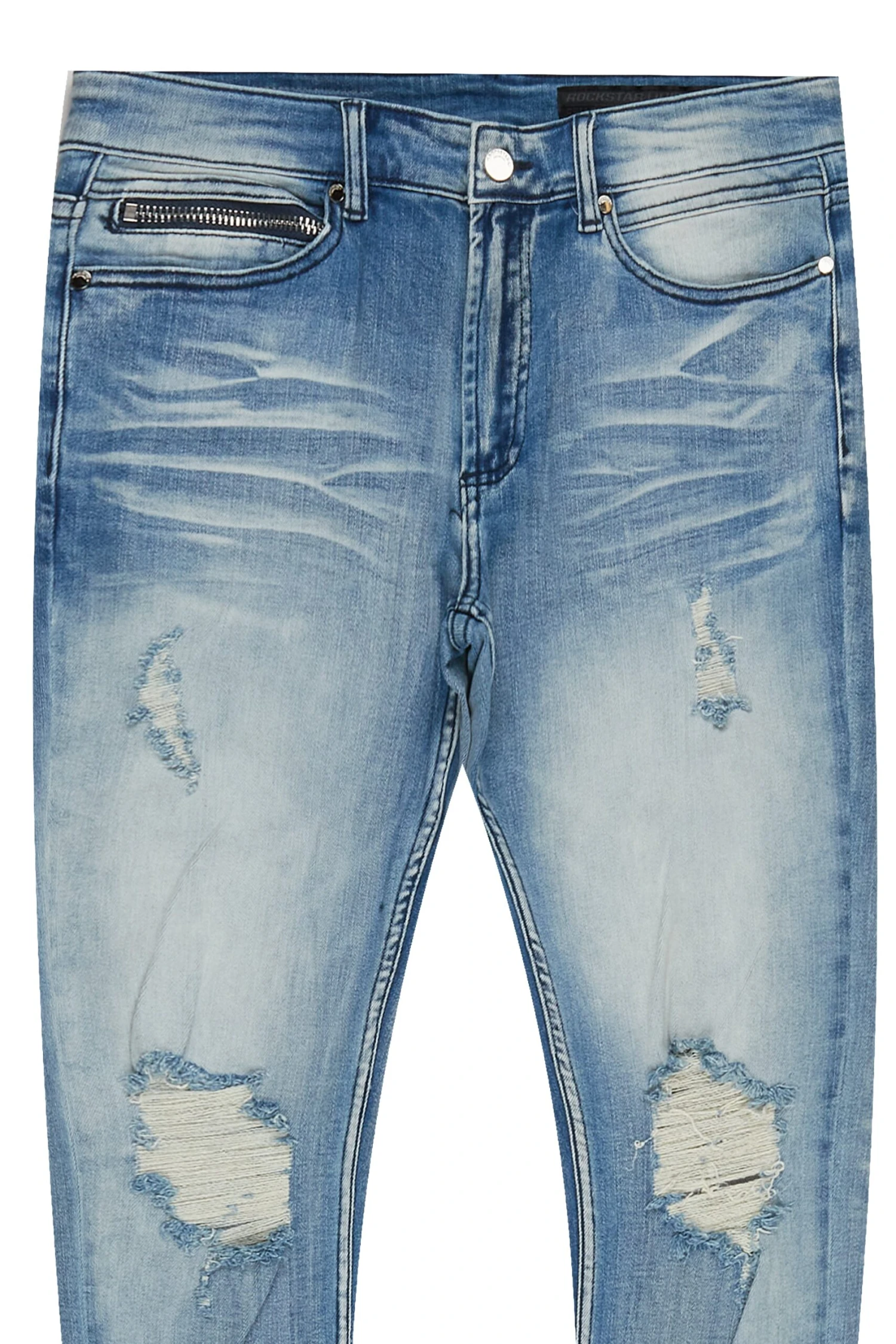 An organic cotton denim jean for men in medium wash. Designed with stretch fabric and a skinny-leg fit for everyday wear.Â