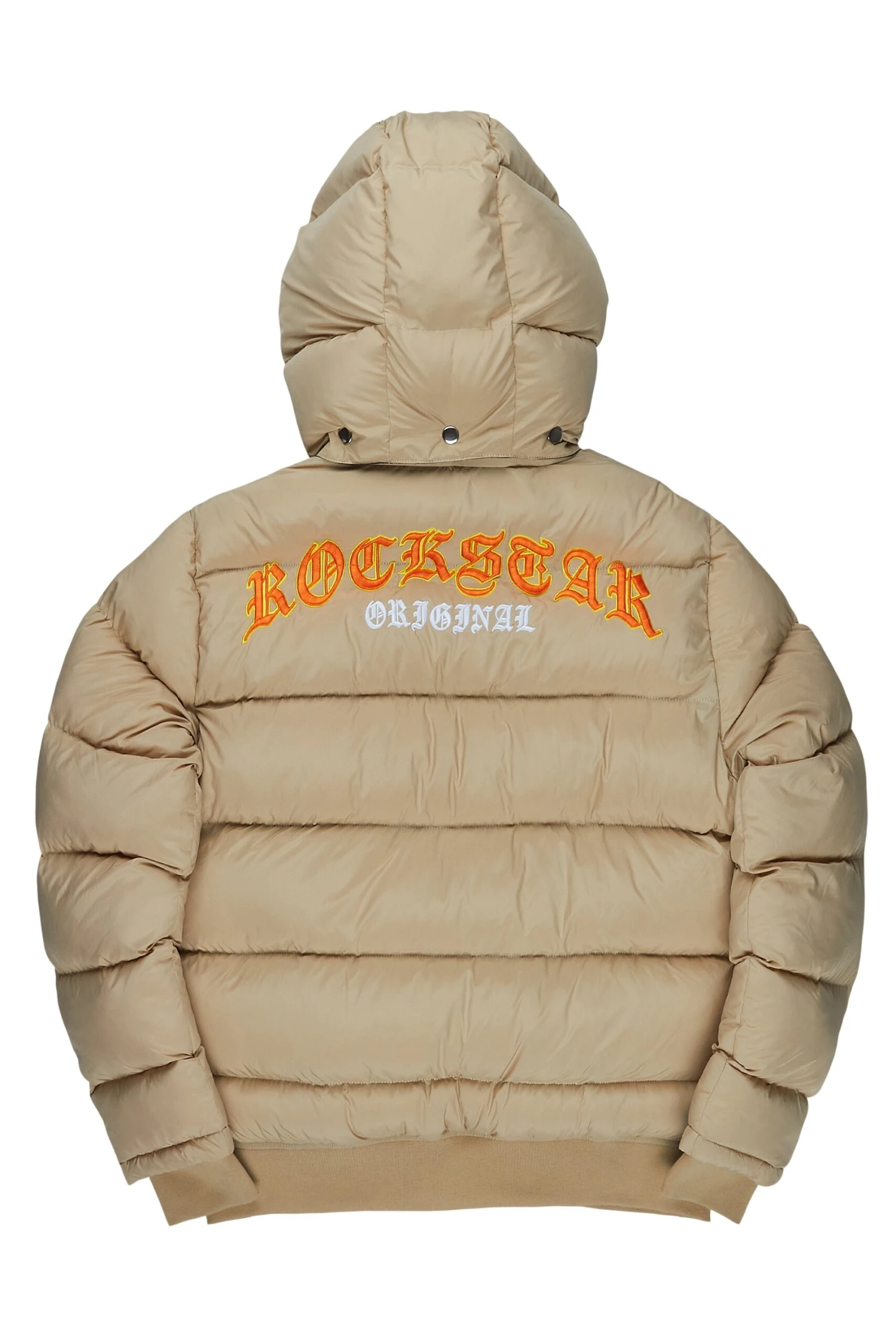 A down-filled, quilted puffer jacket for men in beige. Designed with water-resistant fabric for optimal warmth.