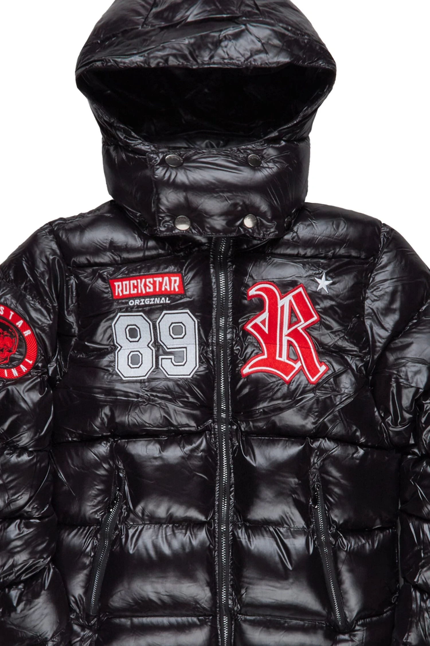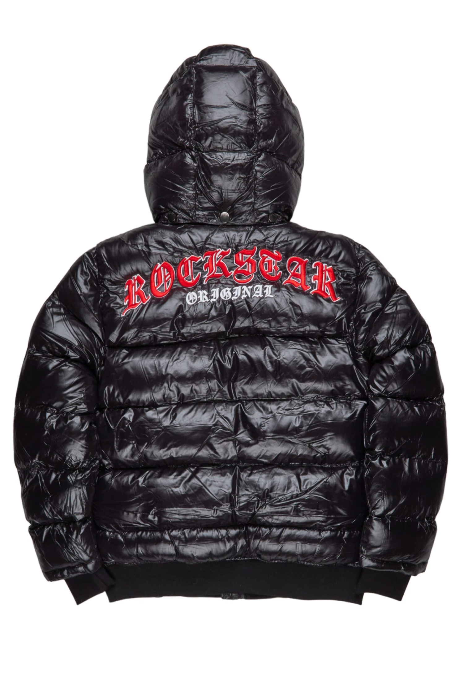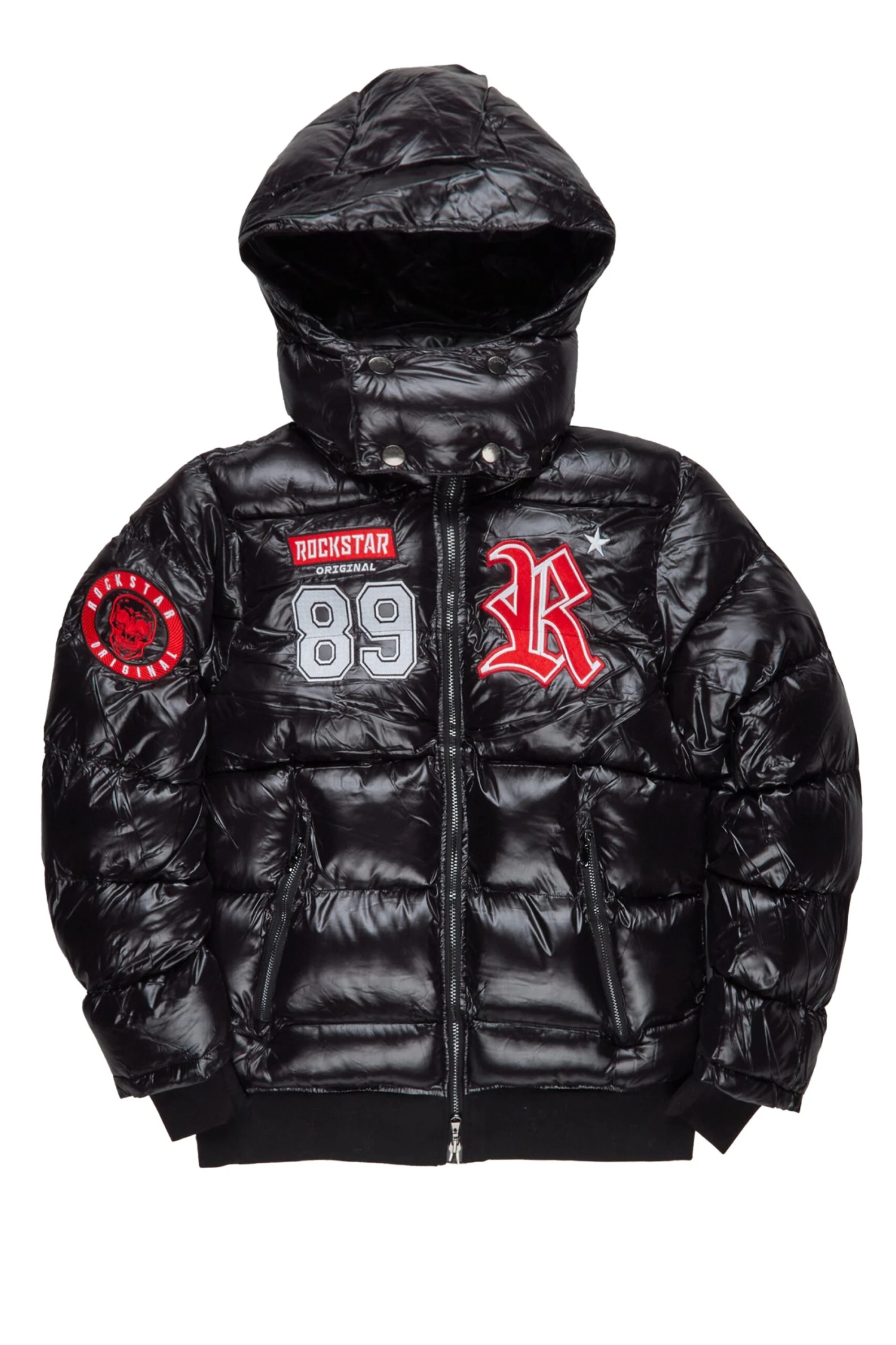 A down-filled, quilted puffer jacket for men in black. Designed with water-resistant fabric for optimal warmth.