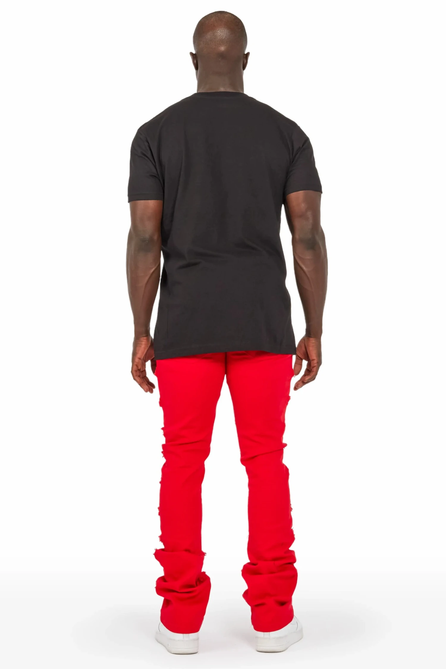 A distressed urban stacked denim jean for men in red. Designed with organic cotton and frayed rips for a dope streetwear style.