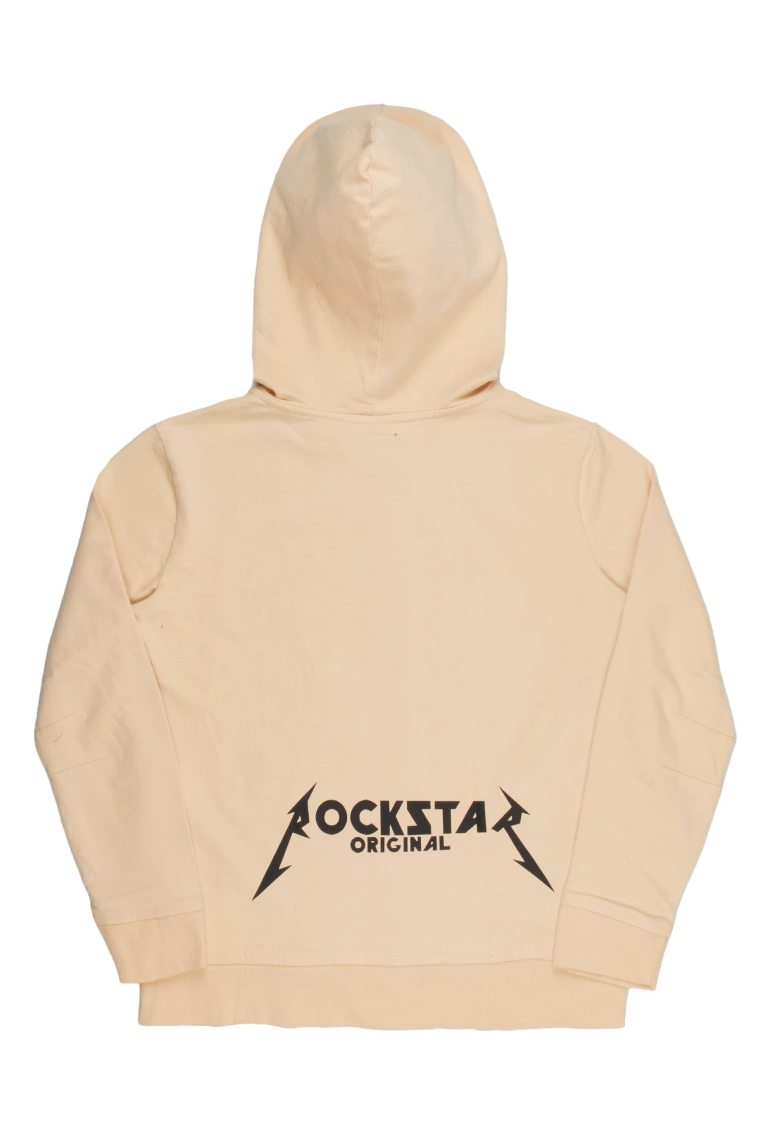 Rockstar Original Men’s hoodie in beige. Featuring an ombre rhinestone RSO logo on the chest with a printed posterior logo to match and paisley patches in orange and green throughout. Accenting a drawstring hood with a front pocket, elastic cuffs and premium cotton threading for style and comfort.