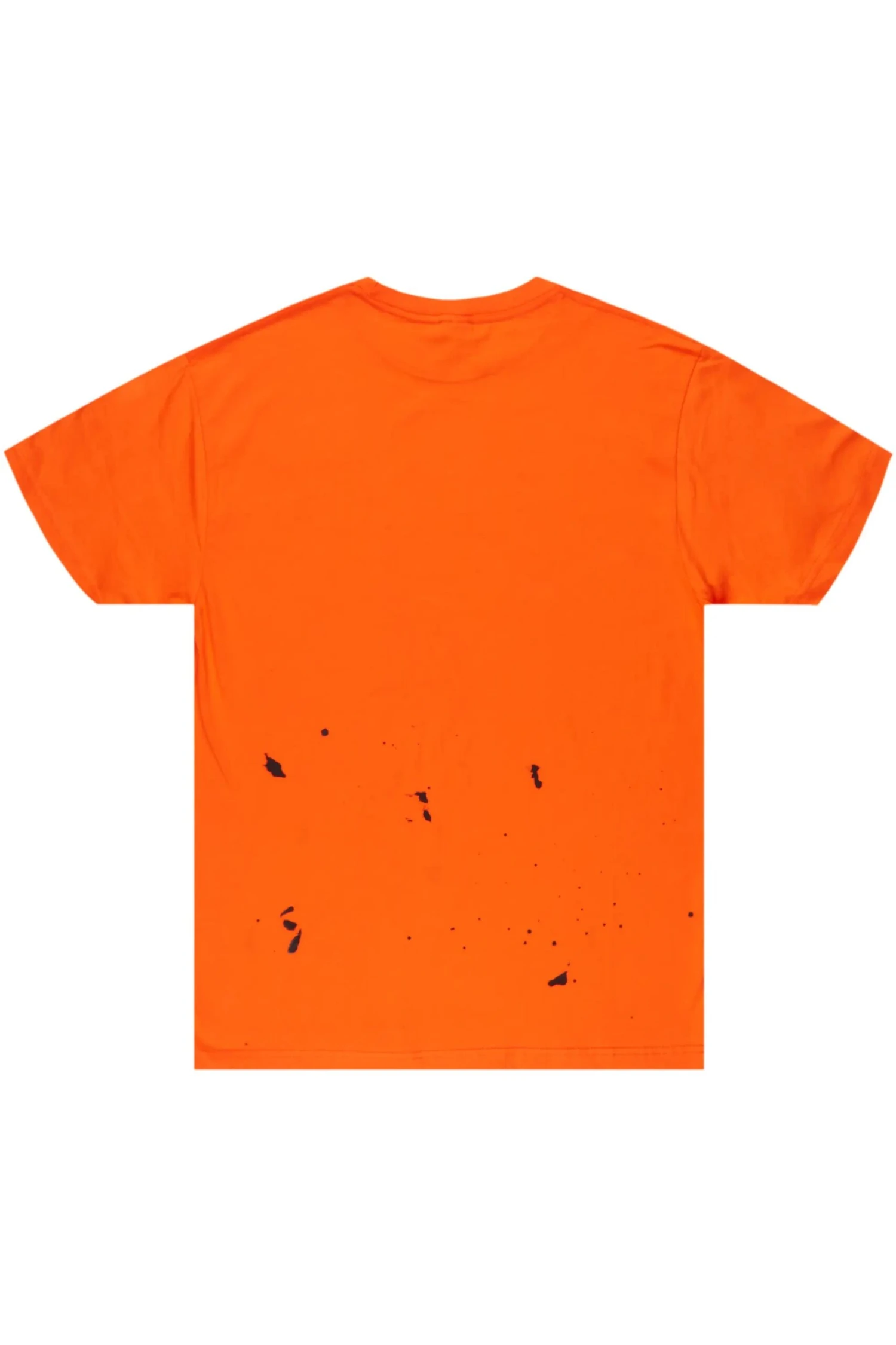 An urban streetwear t-shirt for men in orange. Designed with organic cotton and a custom paint spatter detailing for the perfect staple piece style.
