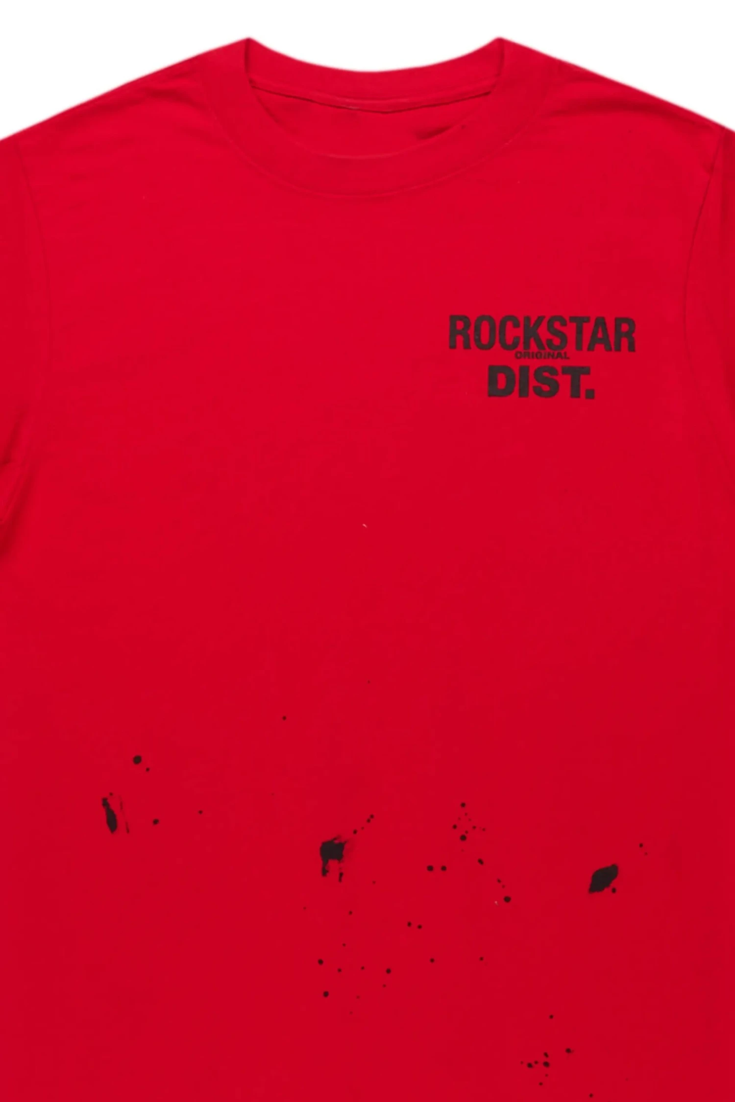 An urban streetwear t-shirt for men in red. Designed with organic cotton and a custom paint spatter detailing for the perfect staple piece style.
