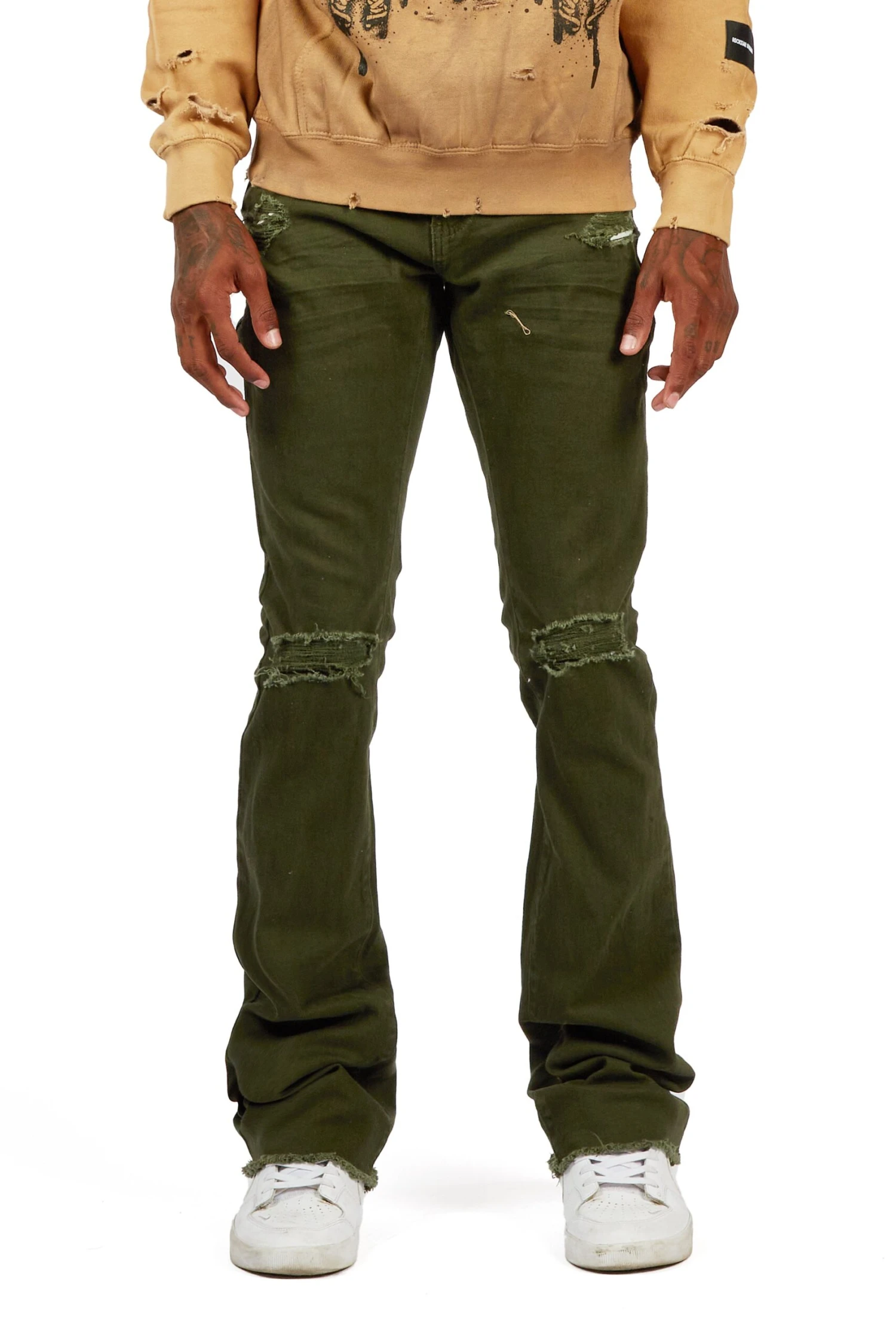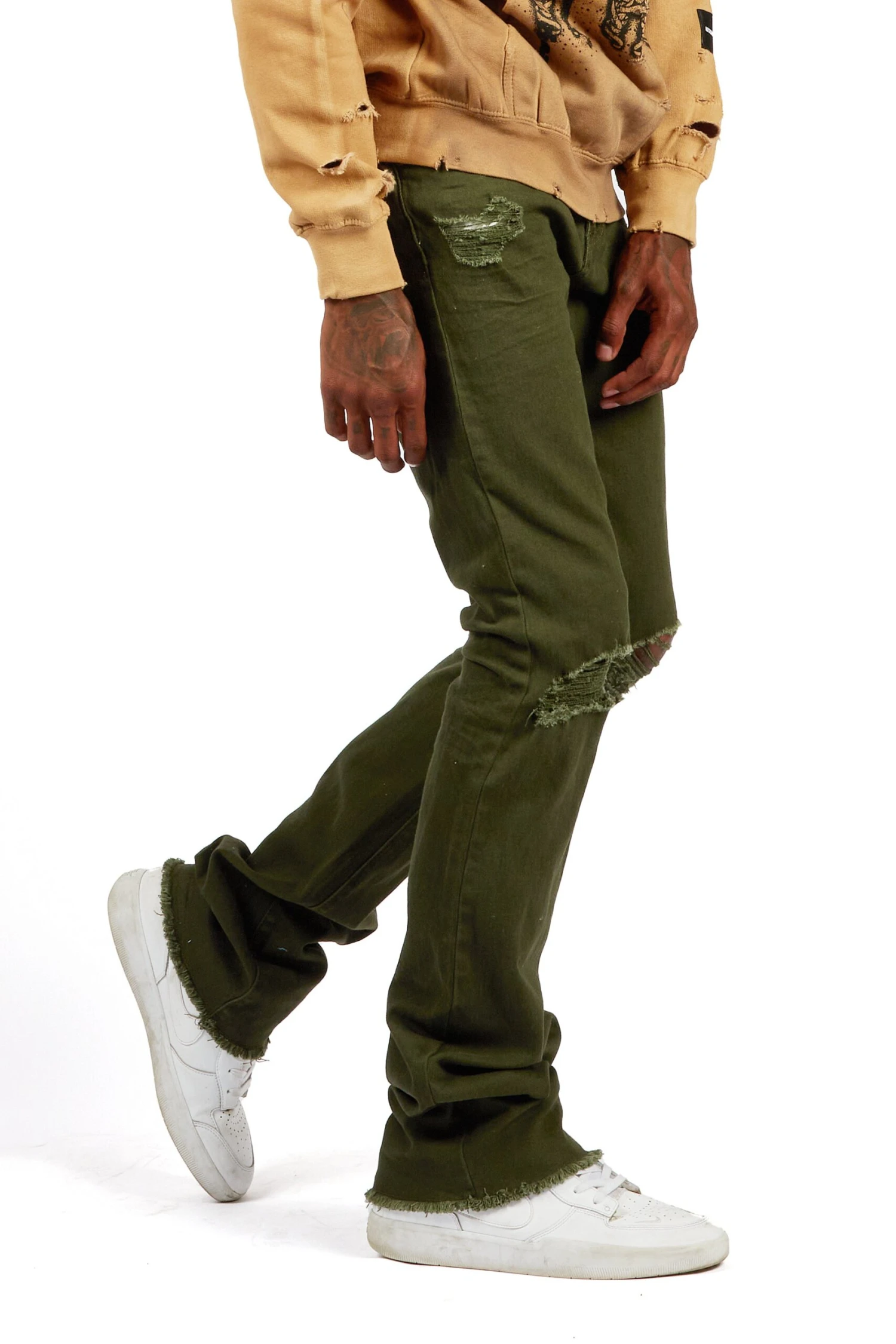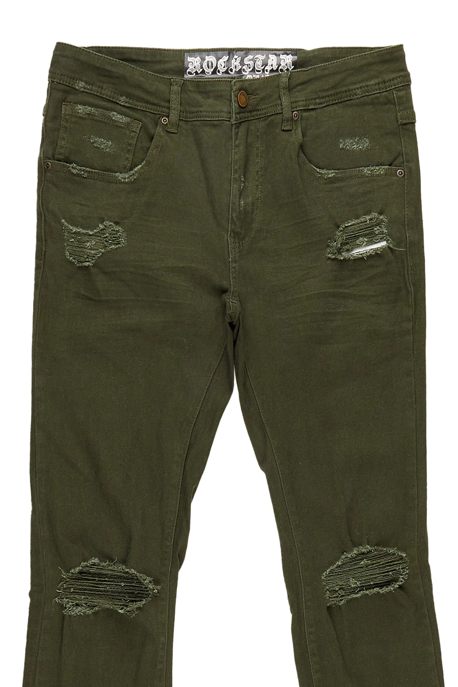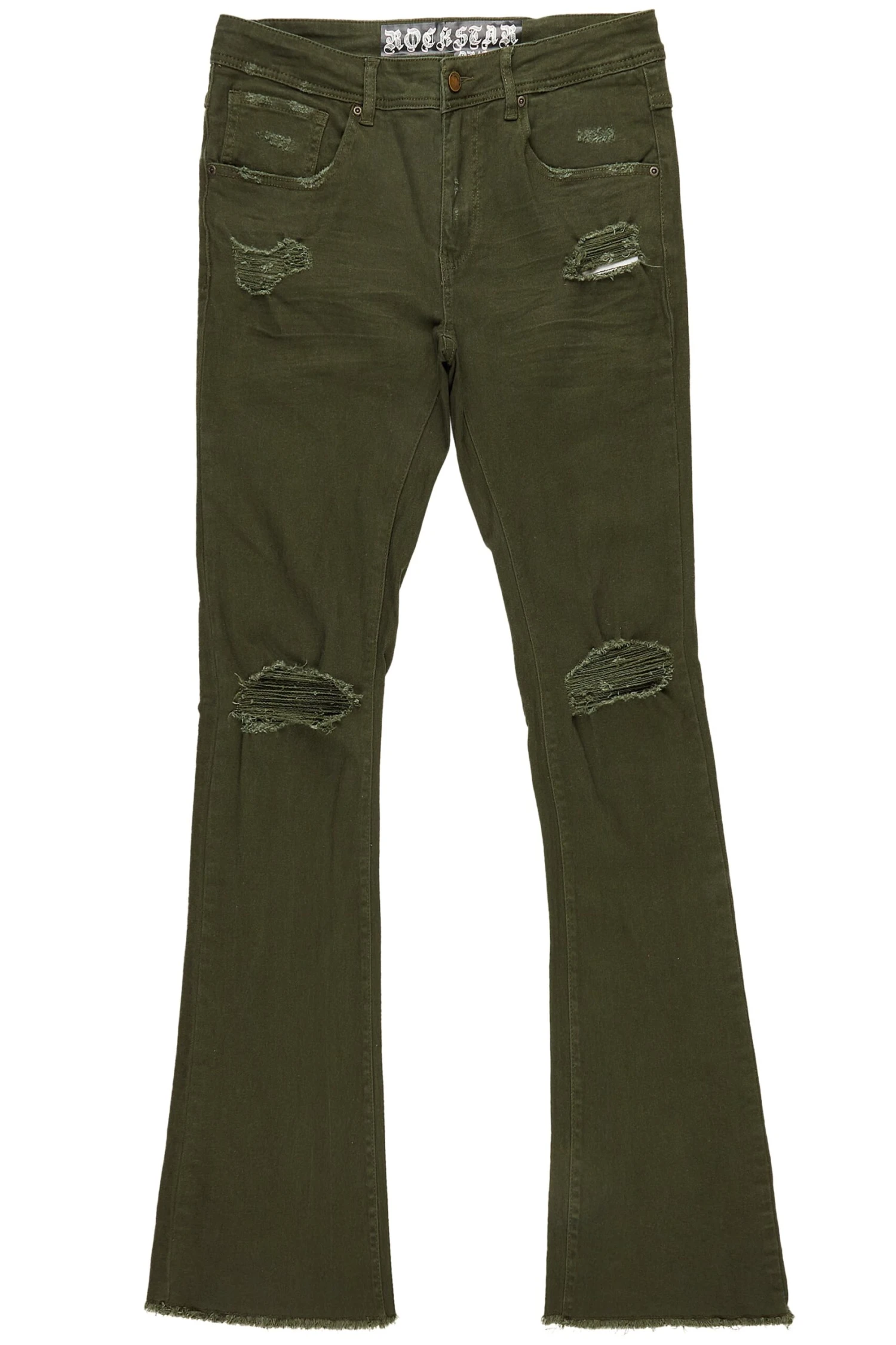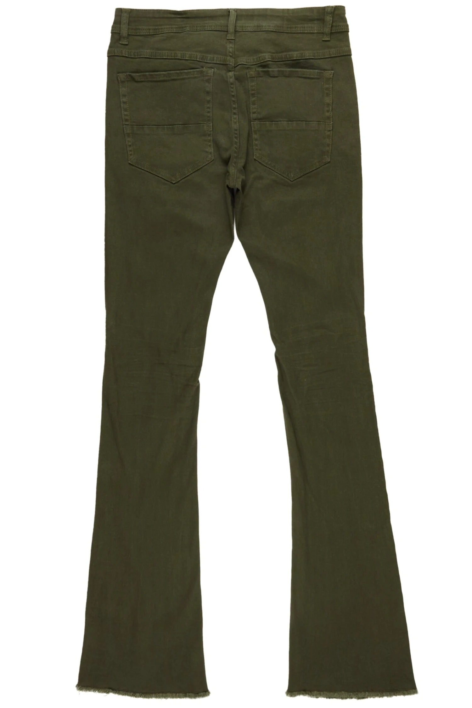 A pair of contemporary stacked denim jeans for men in olive. Designed with a retro feel and organic cotton for the perfect everyday style.