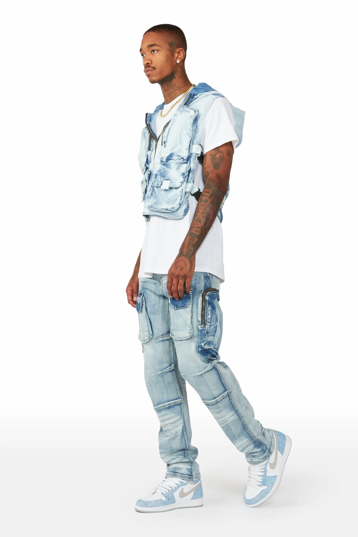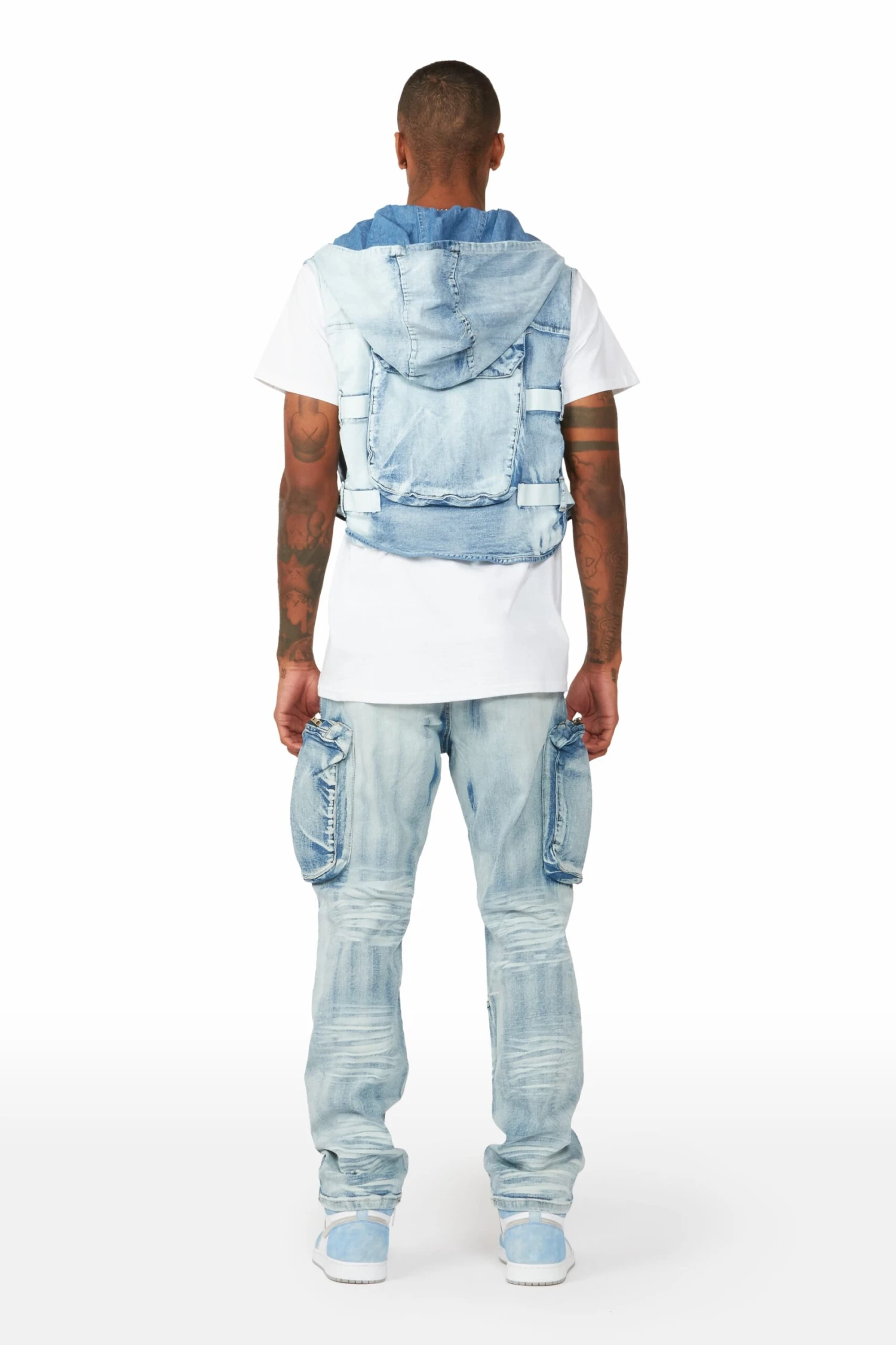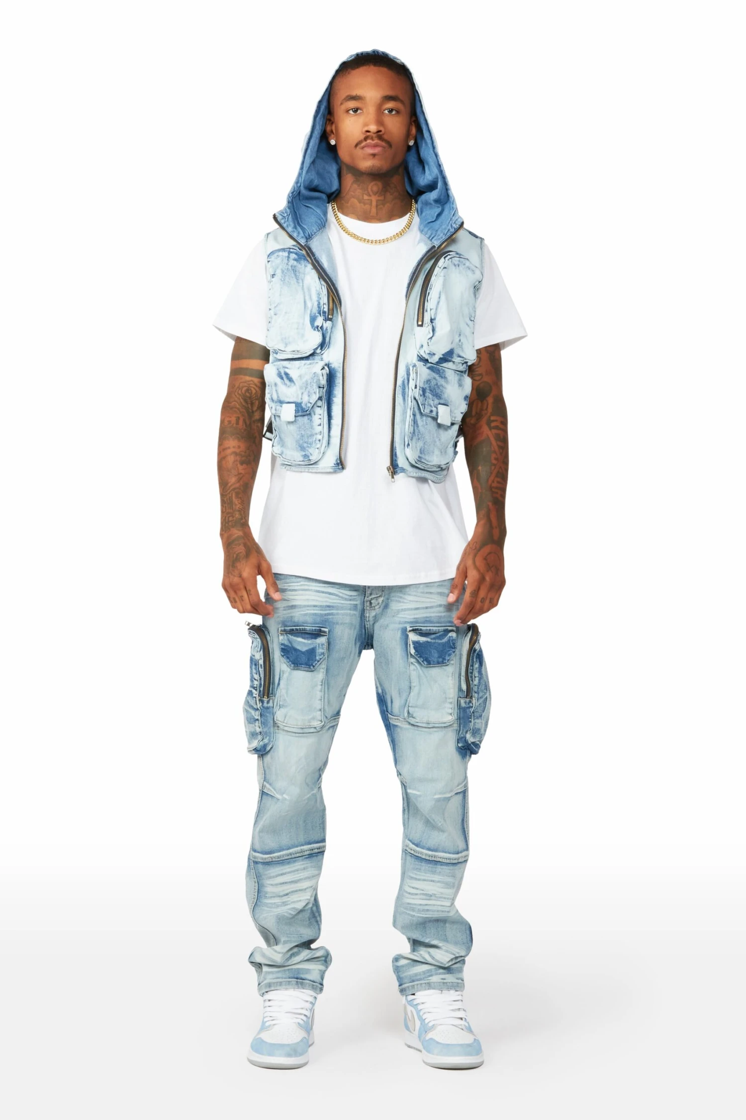 An urban streetwear cargo vest for men in light blue. Designed with water-repellent nylon and utility pockets for a versatile style.
