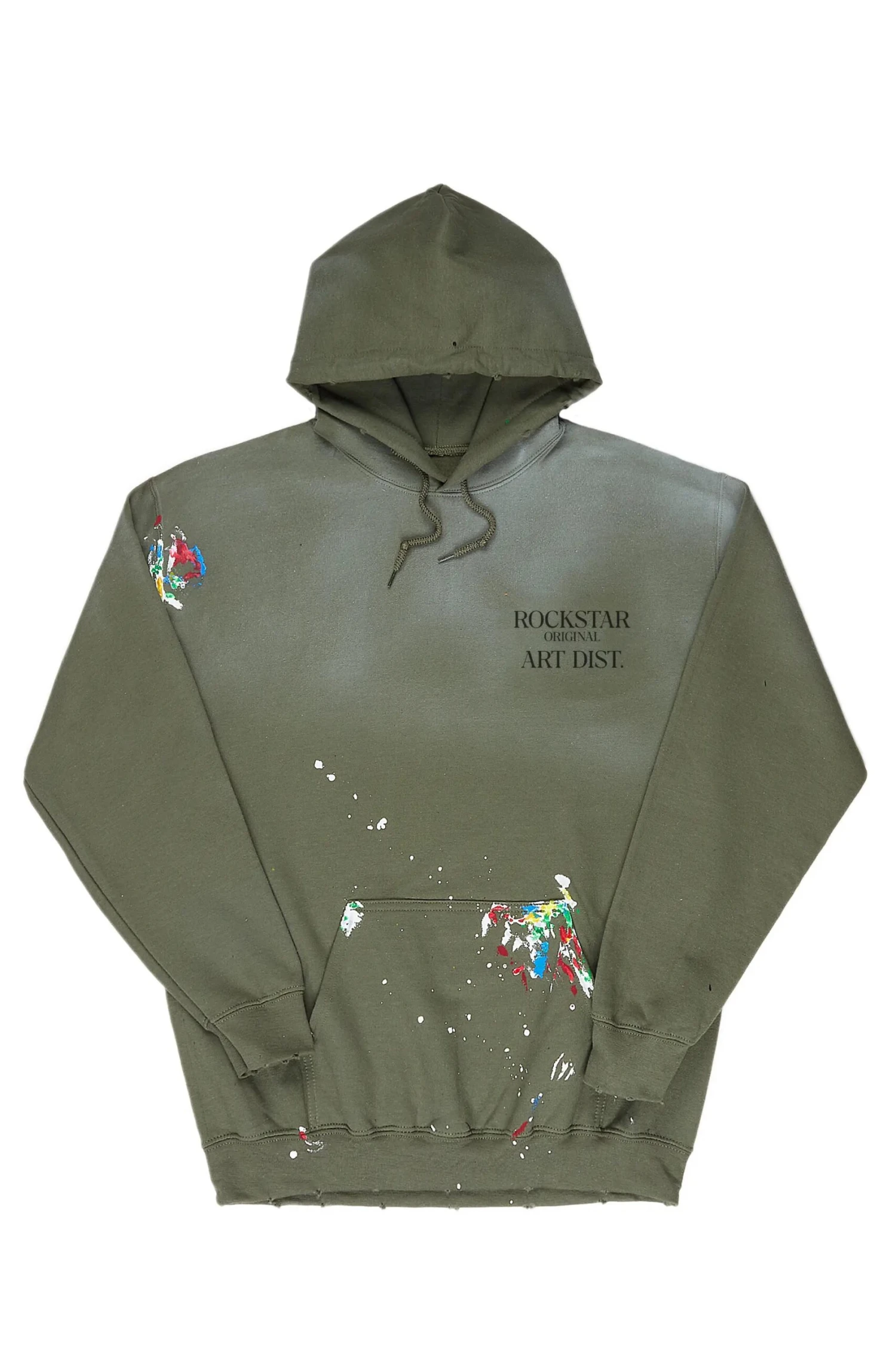 An organic cotton hoodie for men in green. Designed with a worn-in finish and custom splatter paint for the perfect vintage-inspired staple piece.