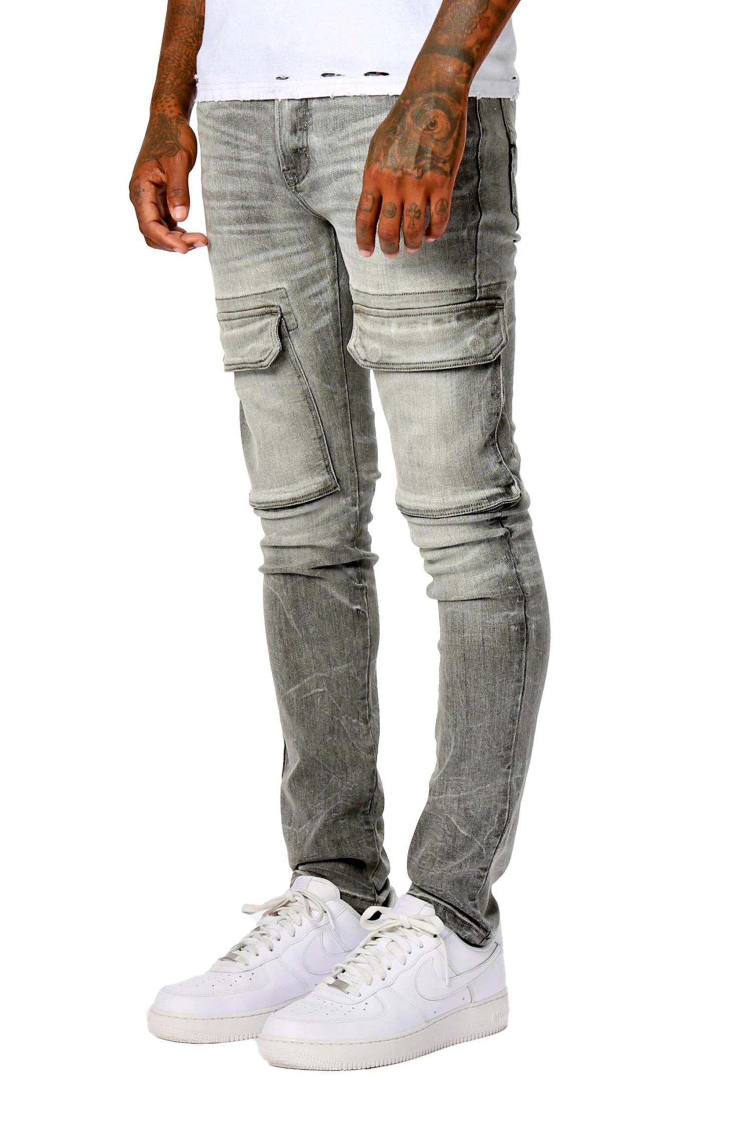 A cargo-inspired denim jean for men in grey. Designed with multiple pockets and a slim-fit for a must-cop staple piece.