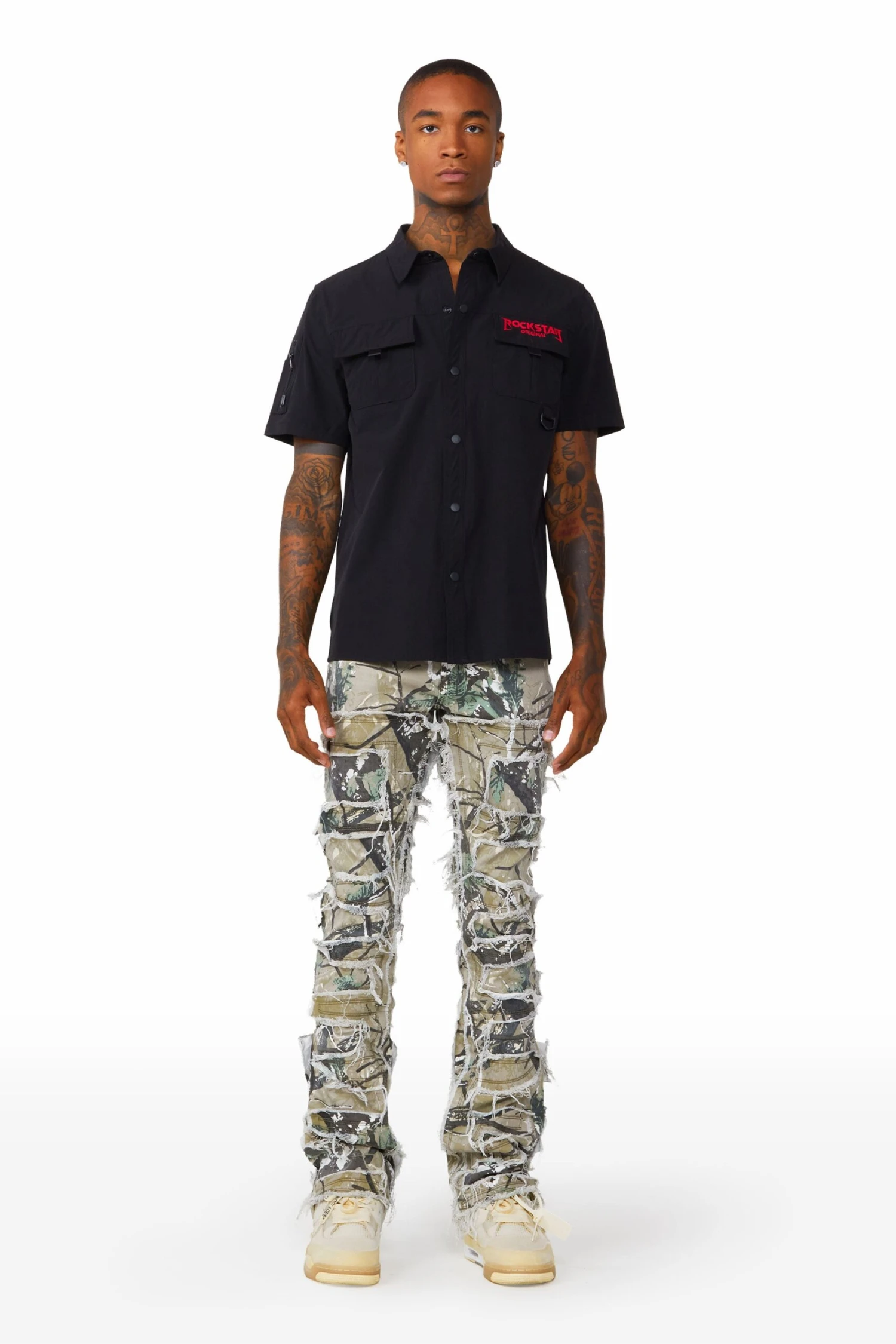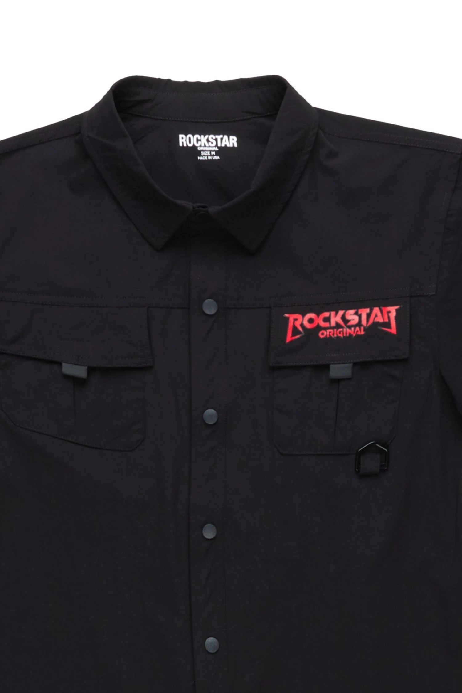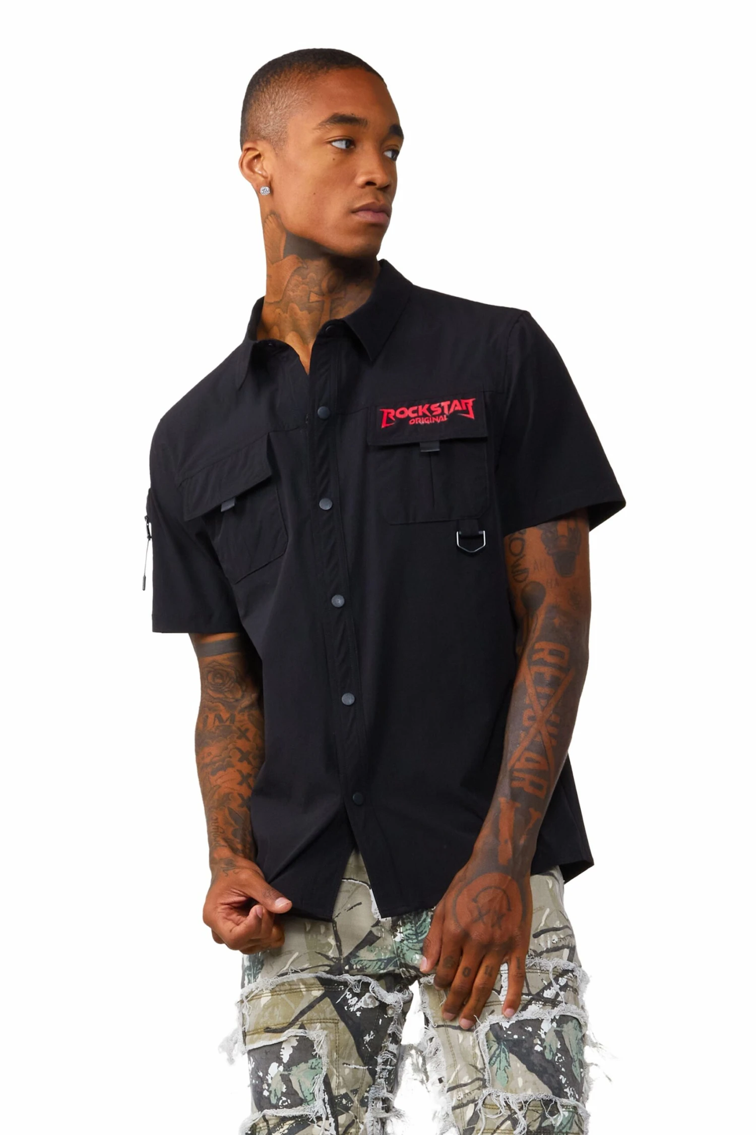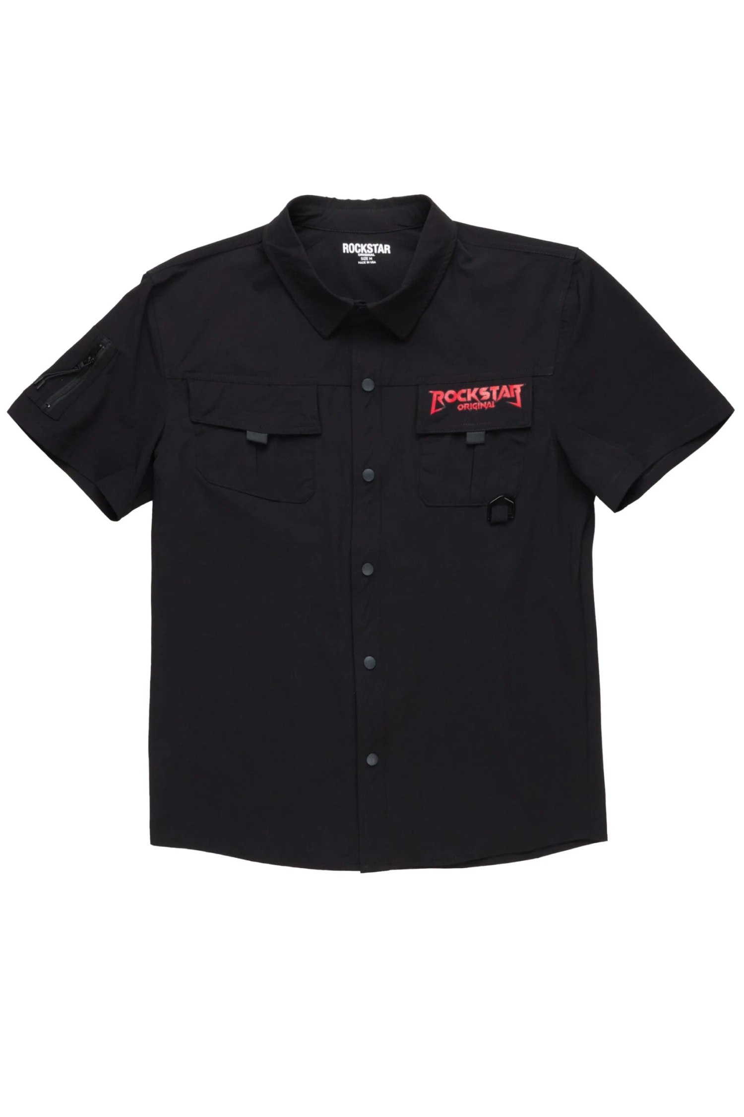 A sleek button-up tee for men in black. Designed with organic cotton and utility hardware for a versatile staple piece