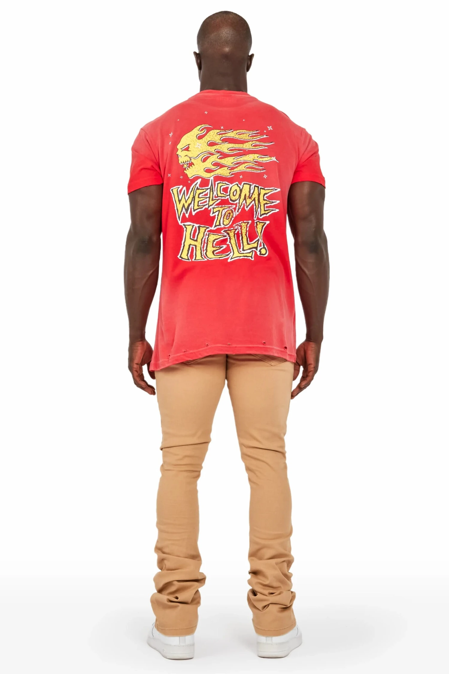 An urban cargo stacked flare jean for men in khaki. Designed with organic cotton and extra long legs for a dope denim streetwear style.