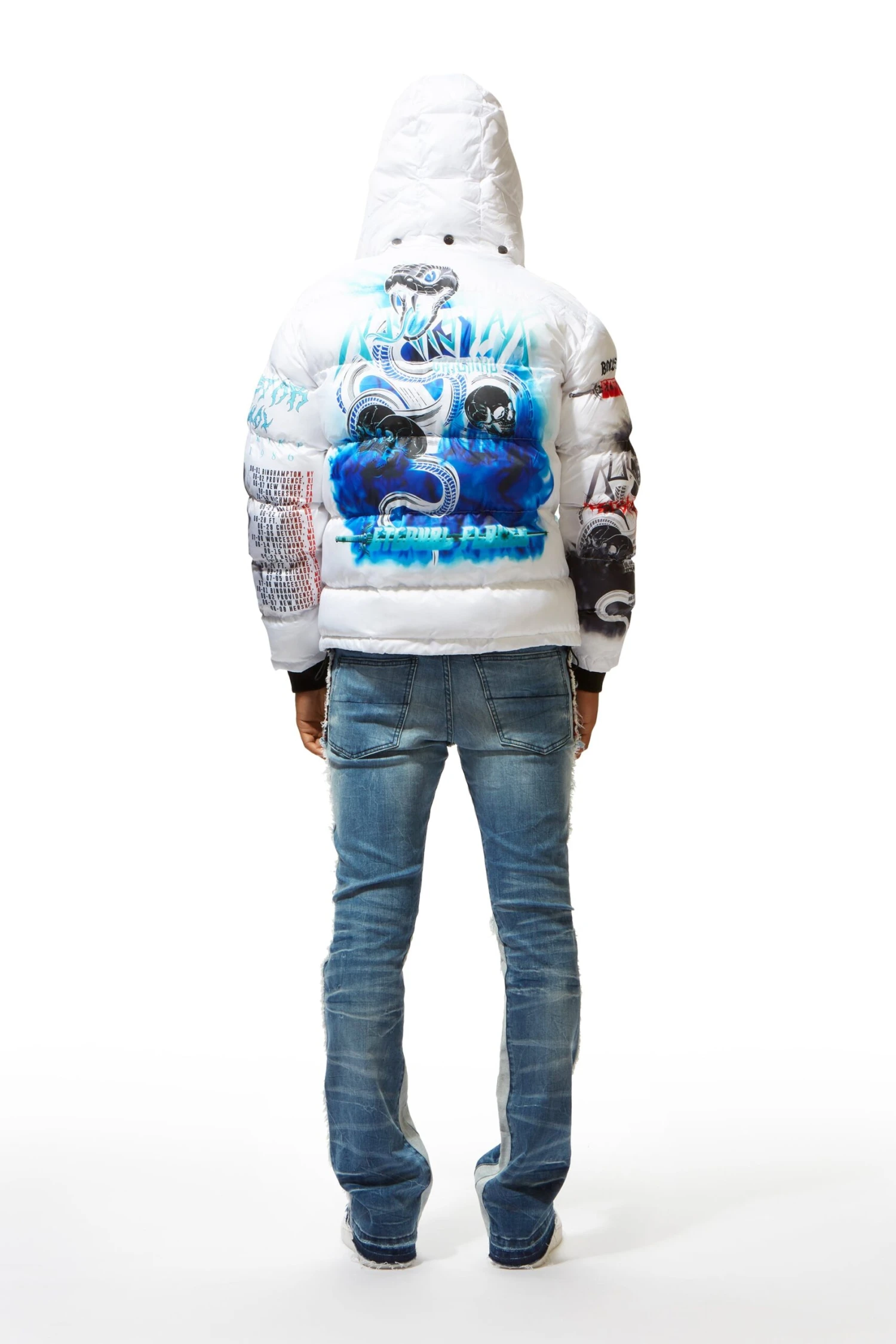 A down-filled, quilted puffer jacket for men in white. Designed with water-resistant fabric for optimal warmth.
