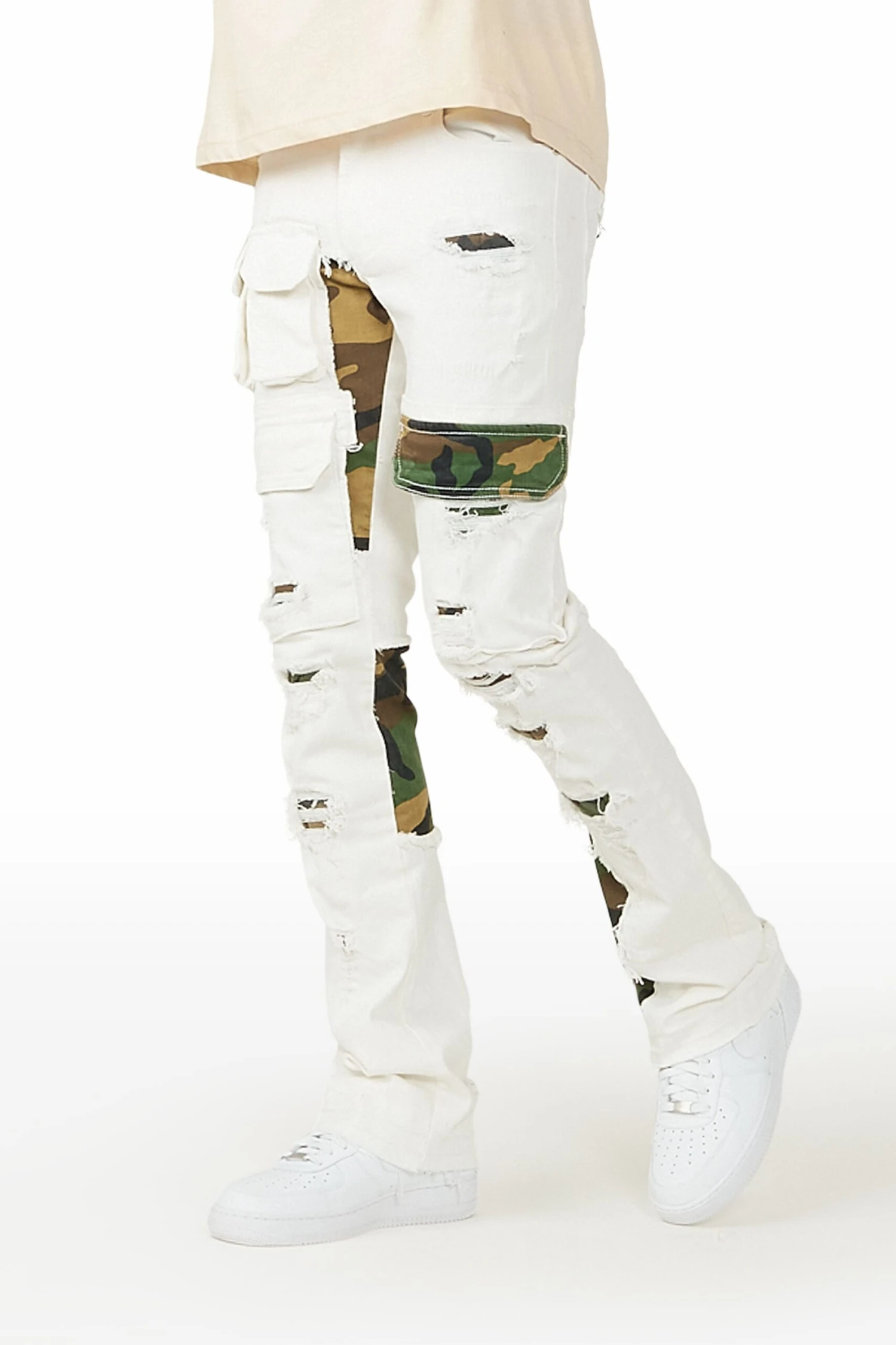 A contemporary pair of urban stacked denim jean for men in blue. Designed with organic cotton and contrast camo fabric with utility pockets for a dope must-cop style.
